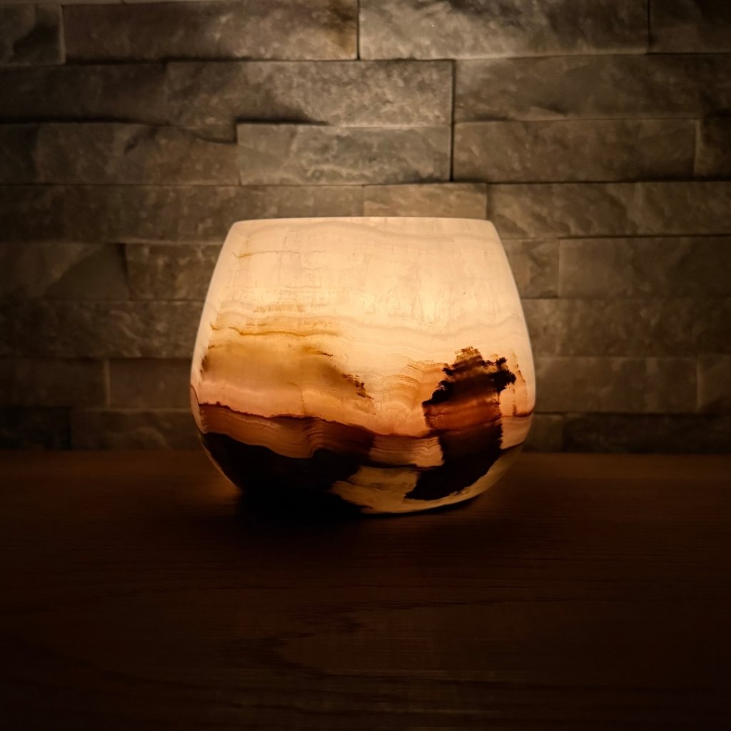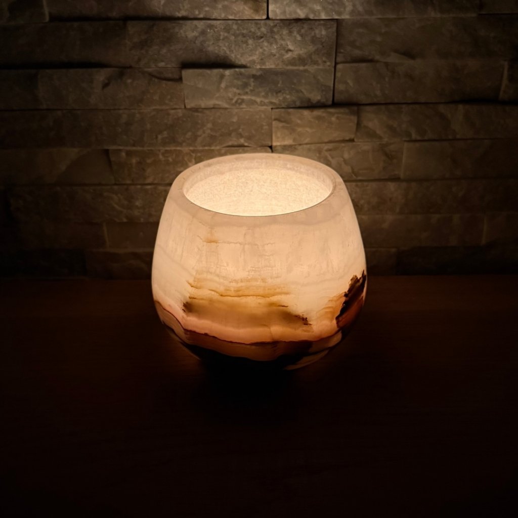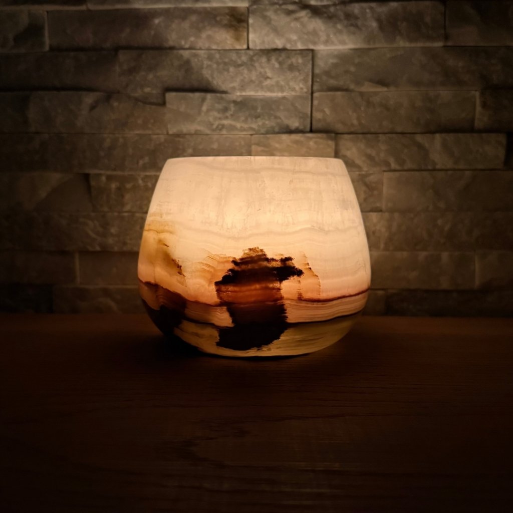 Svícen je vyroben z přírodního aragonitu, známého také jako pákistánský onyx. Tento kámen vyniká pevností, jemným leskem a přirozenou kresbou, která vznikala po tisíce let. Kupujete přesně ten svícen, který vidíte na fotografiích, žádný náhodný výběr, ale konkrétní originální kus.