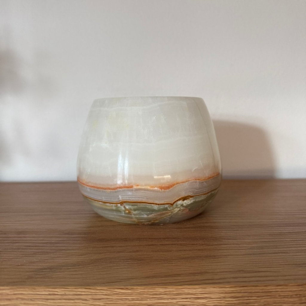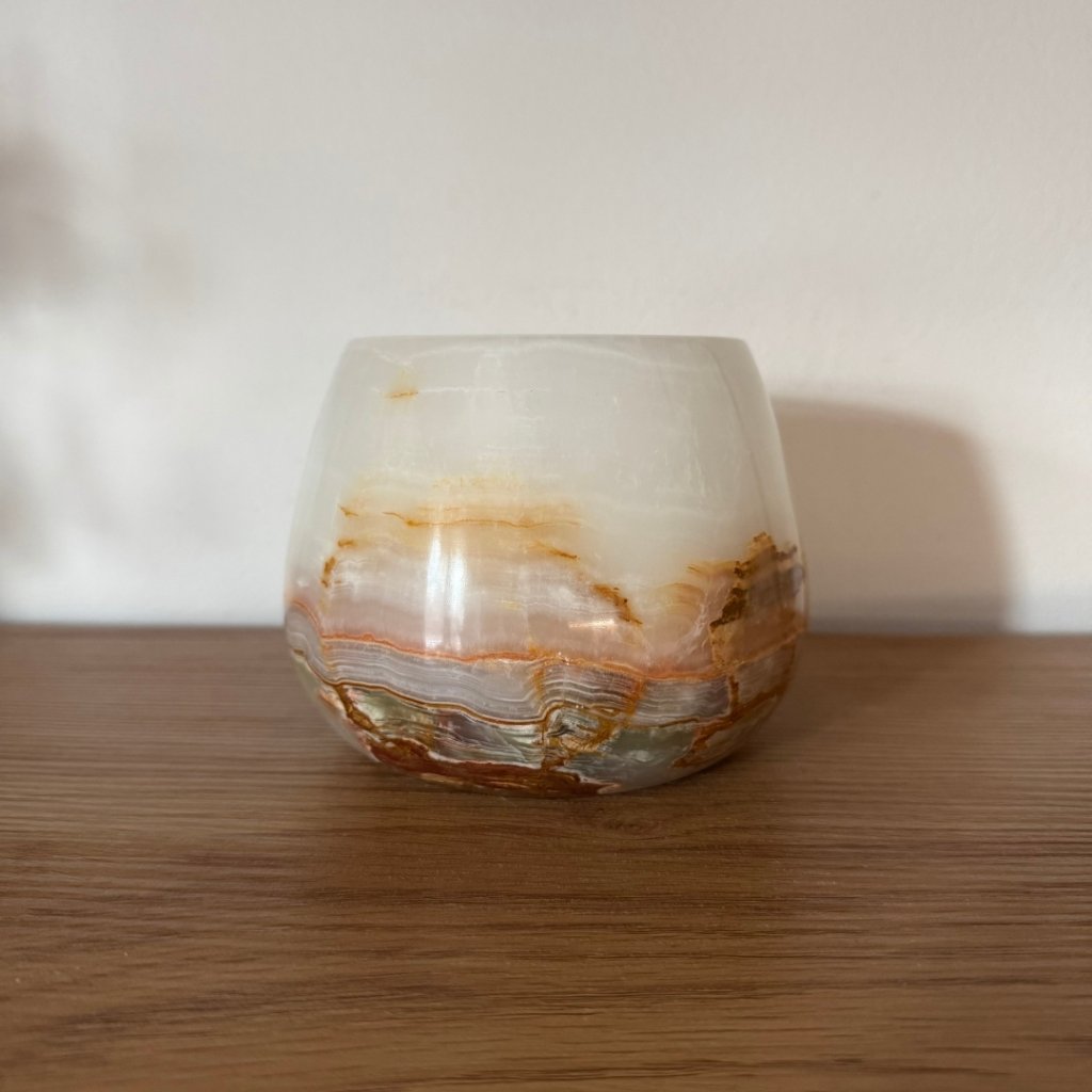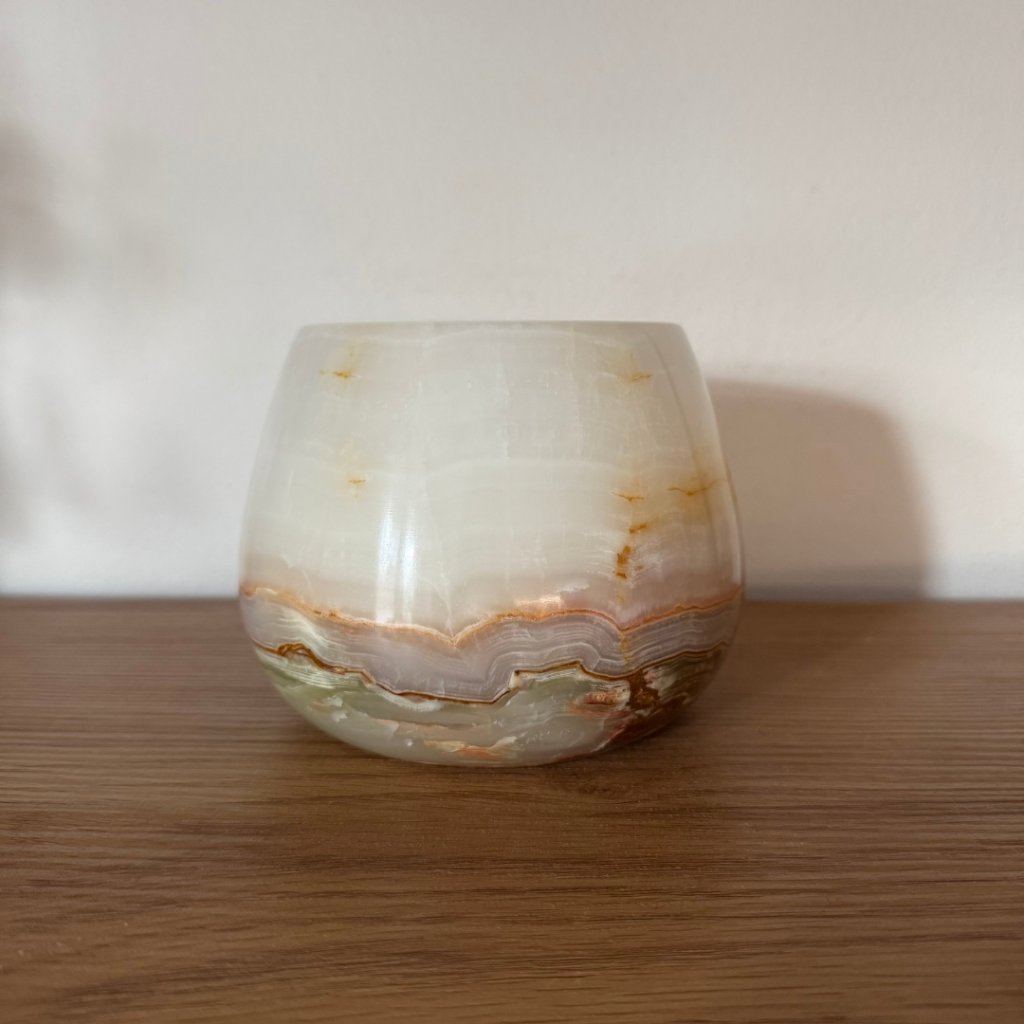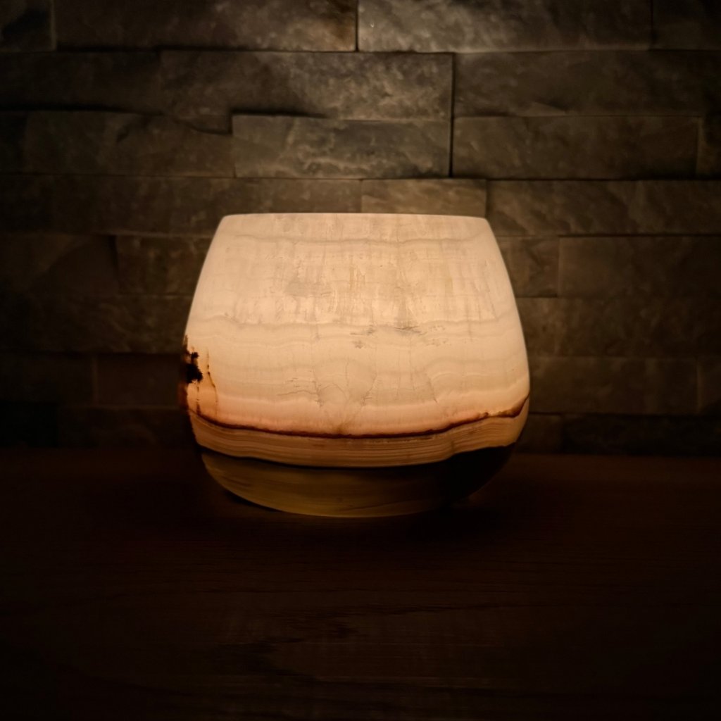 Svícen je vyroben z přírodního aragonitu, známého také jako pákistánský onyx. Tento kámen vyniká pevností, jemným leskem a přirozenou kresbou, která vznikala po tisíce let. Kupujete přesně ten svícen, který vidíte na fotografiích, žádný náhodný výběr, ale konkrétní originální kus.