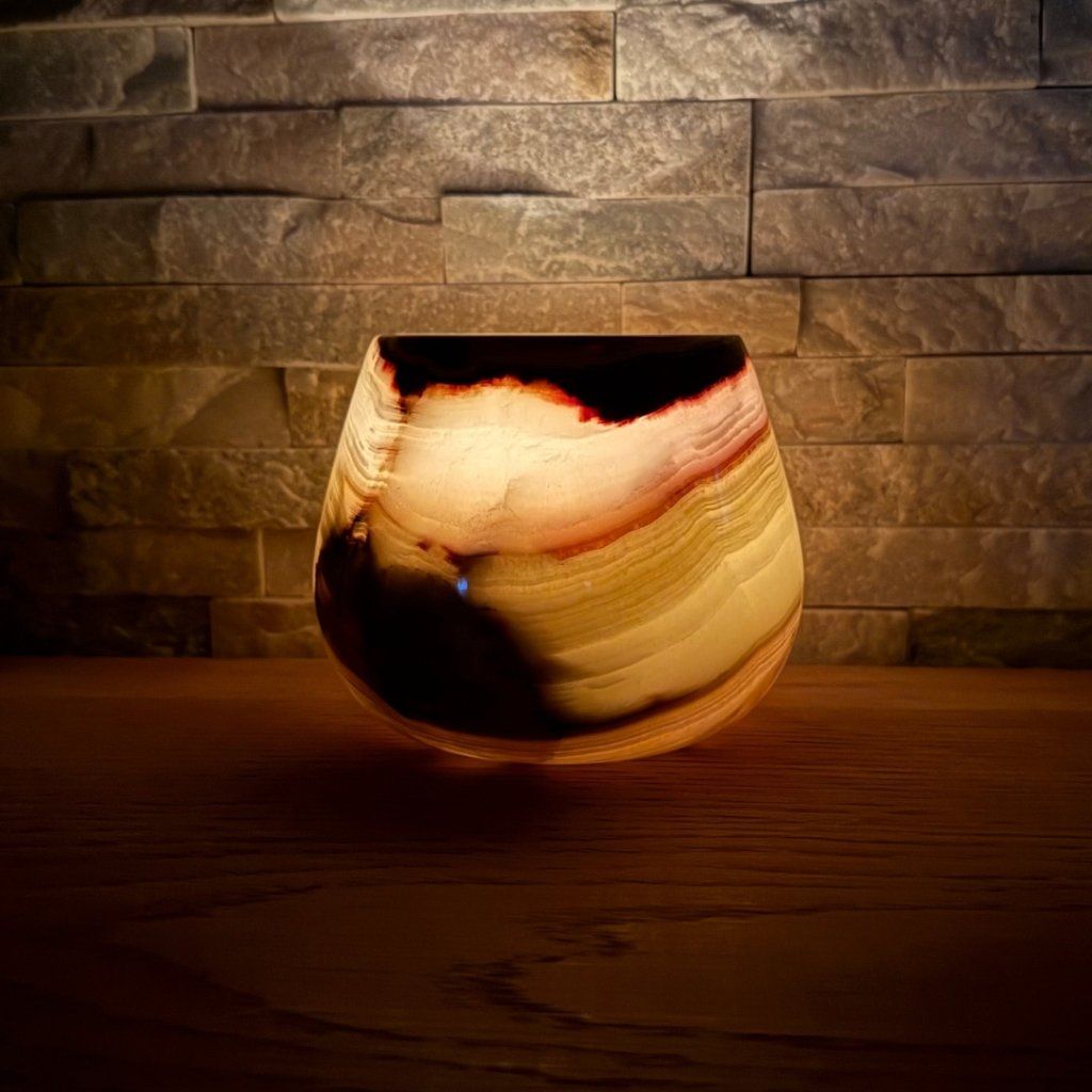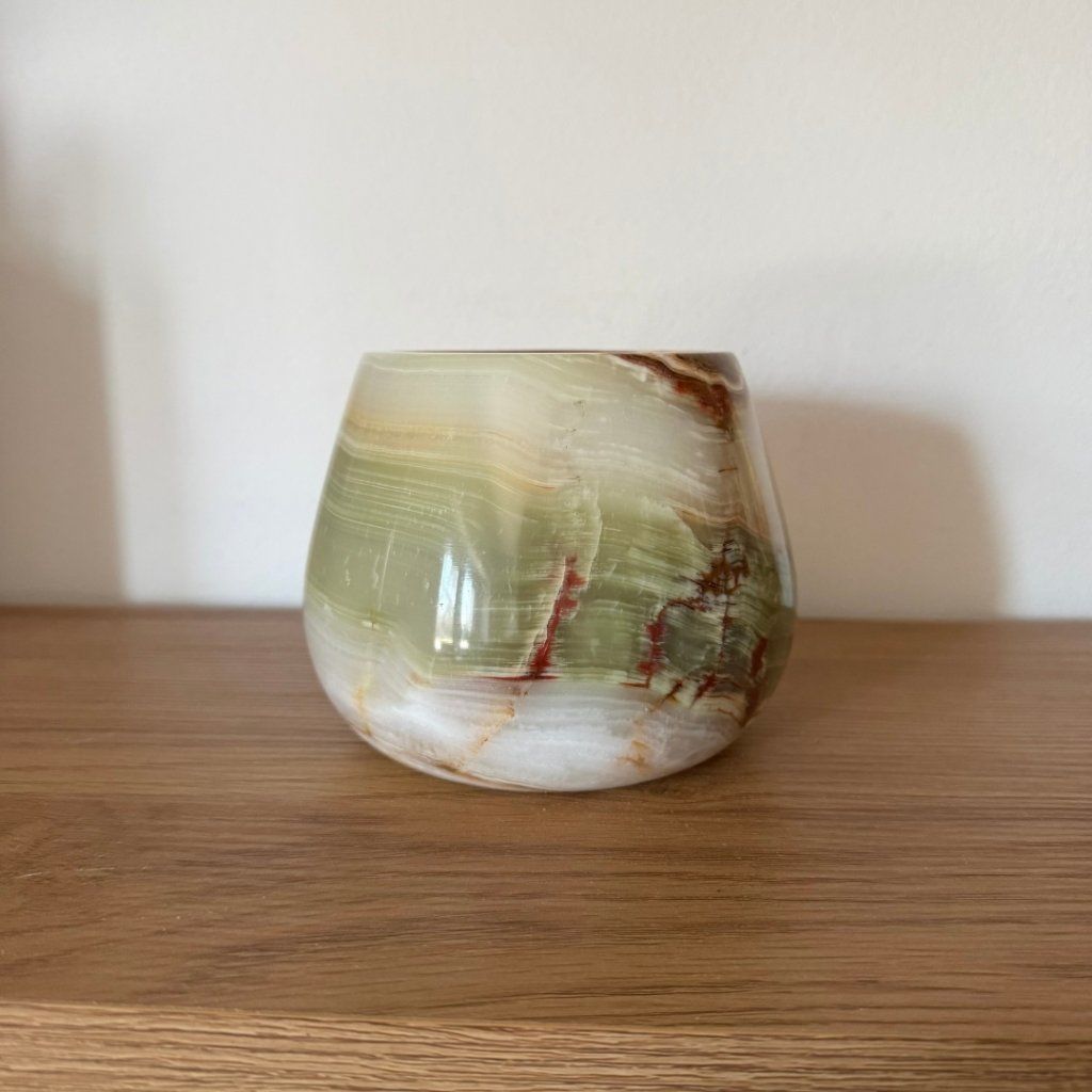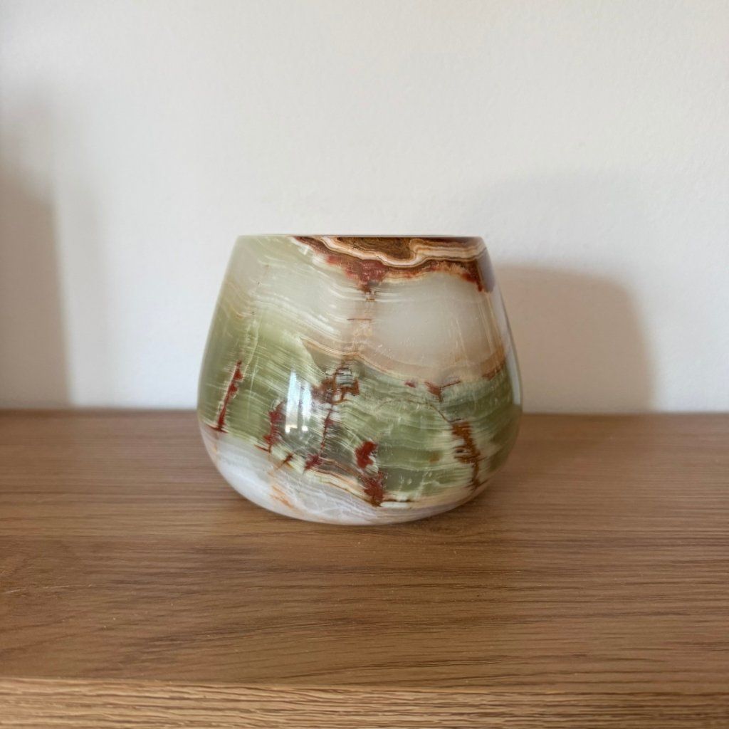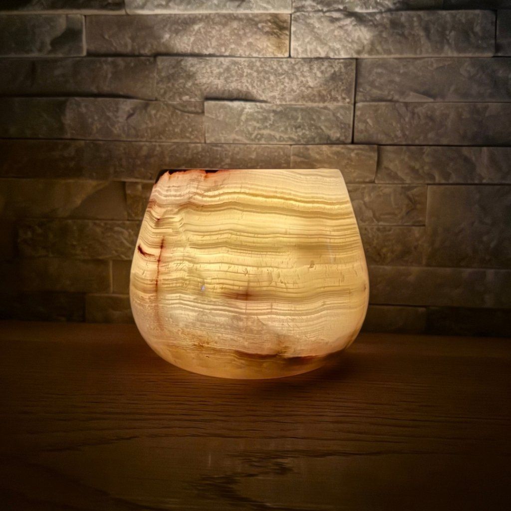Svícen je vyroben z přírodního aragonitu, známého také jako pákistánský onyx. Tento kámen vyniká pevností, jemným leskem a přirozenou kresbou, která vznikala po tisíce let. Kupujete přesně ten svícen, který vidíte na fotografiích, žádný náhodný výběr, ale konkrétní originální kus.