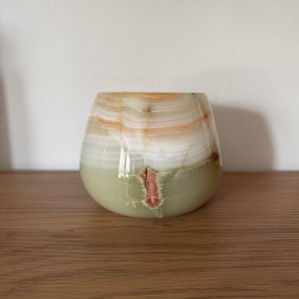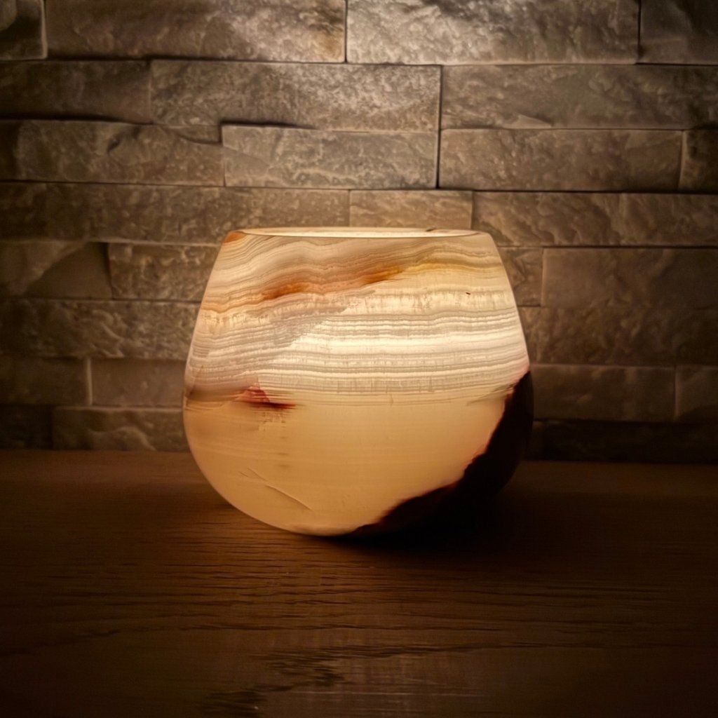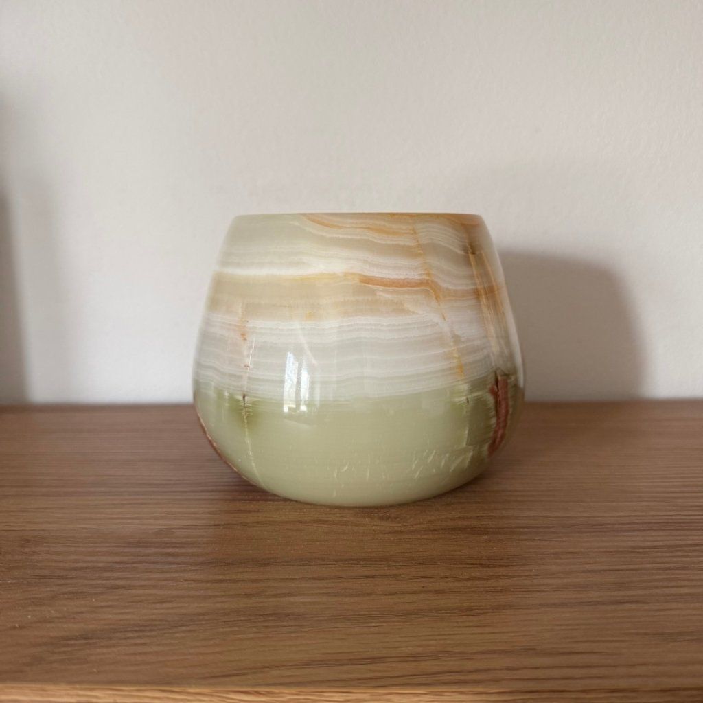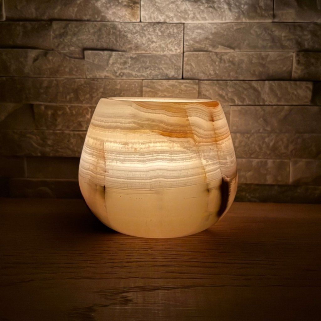 Svícen je vyroben z přírodního aragonitu, známého také jako pákistánský onyx. Tento kámen vyniká pevností, jemným leskem a přirozenou kresbou, která vznikala po tisíce let. Kupujete přesně ten svícen, který vidíte na fotografiích, žádný náhodný výběr, ale konkrétní originální kus.