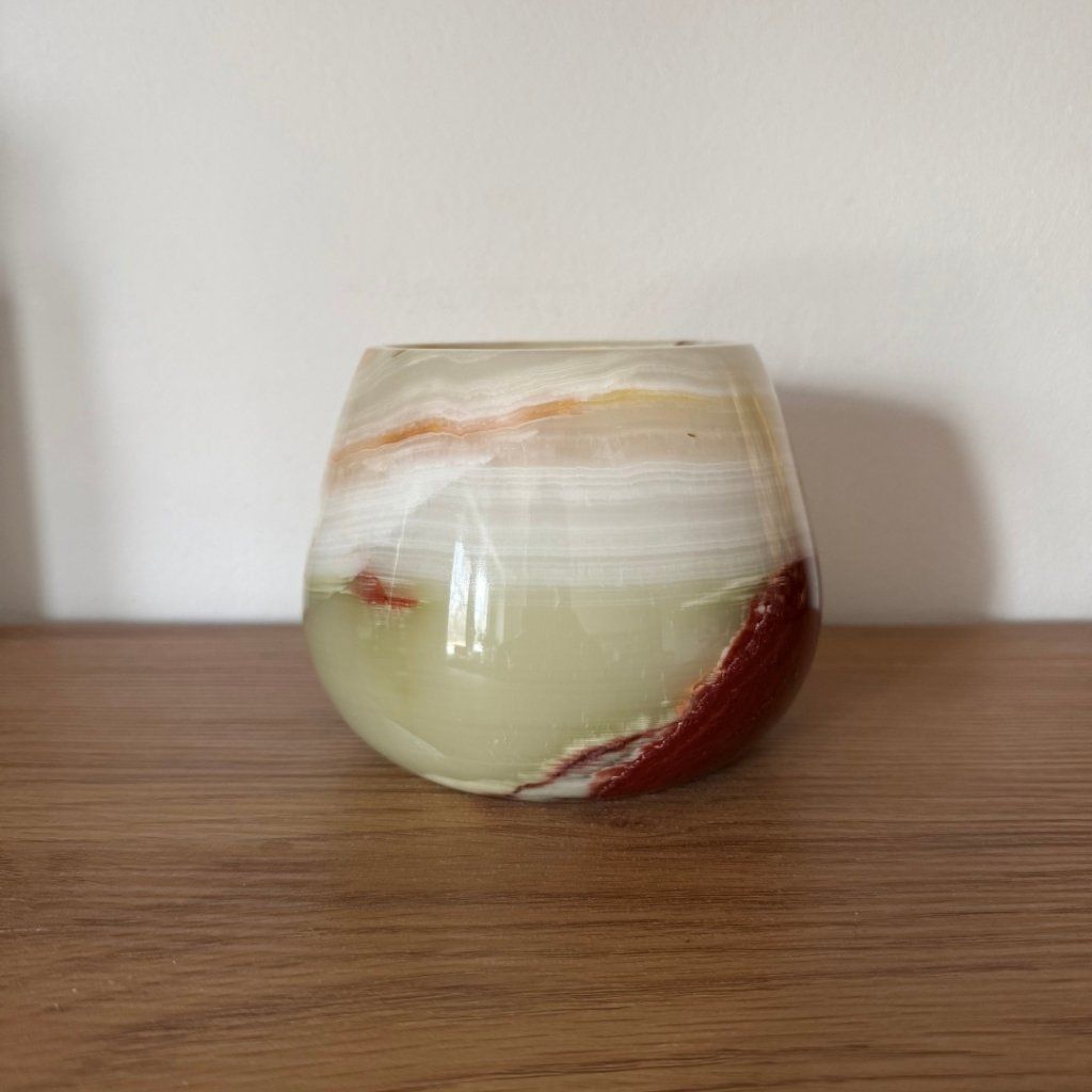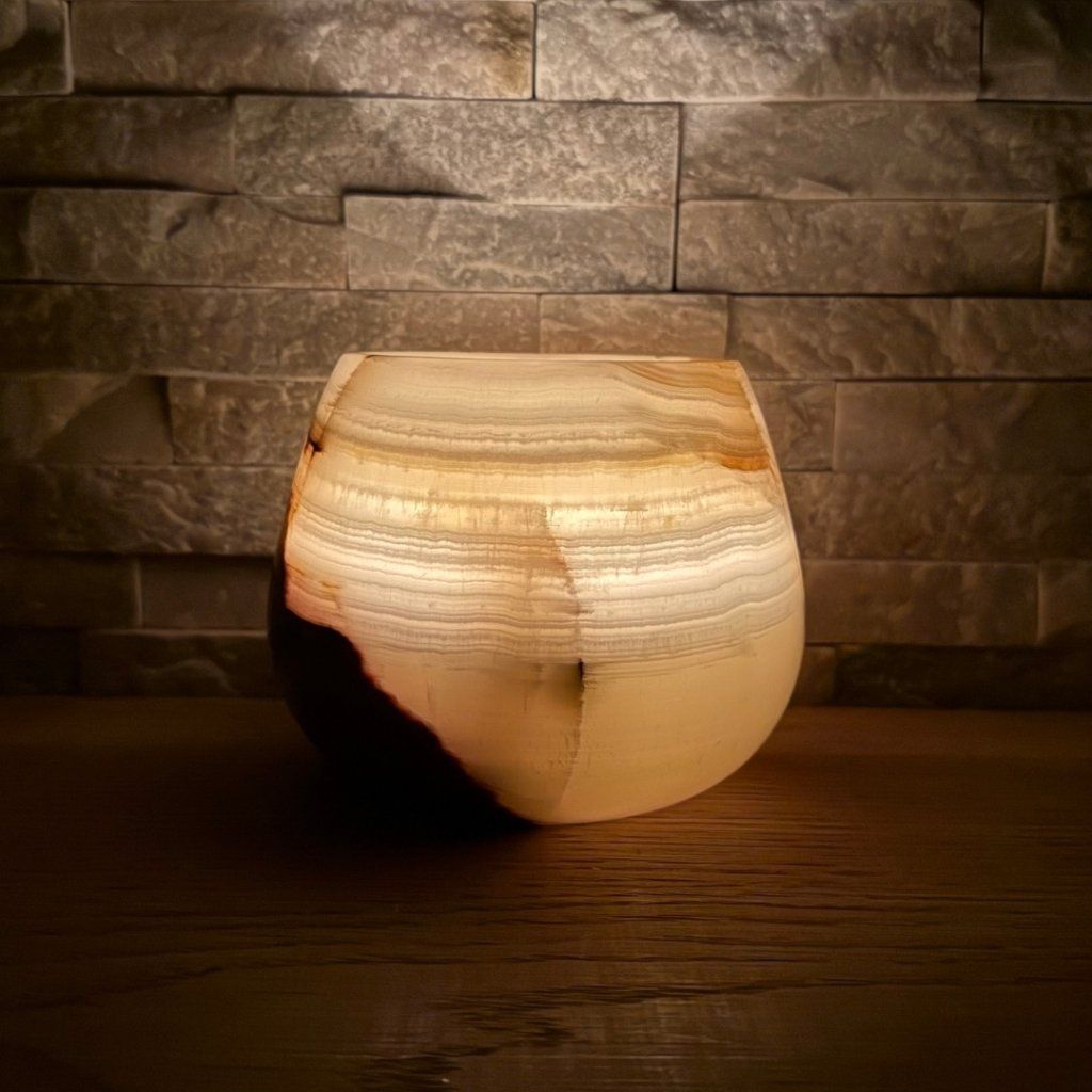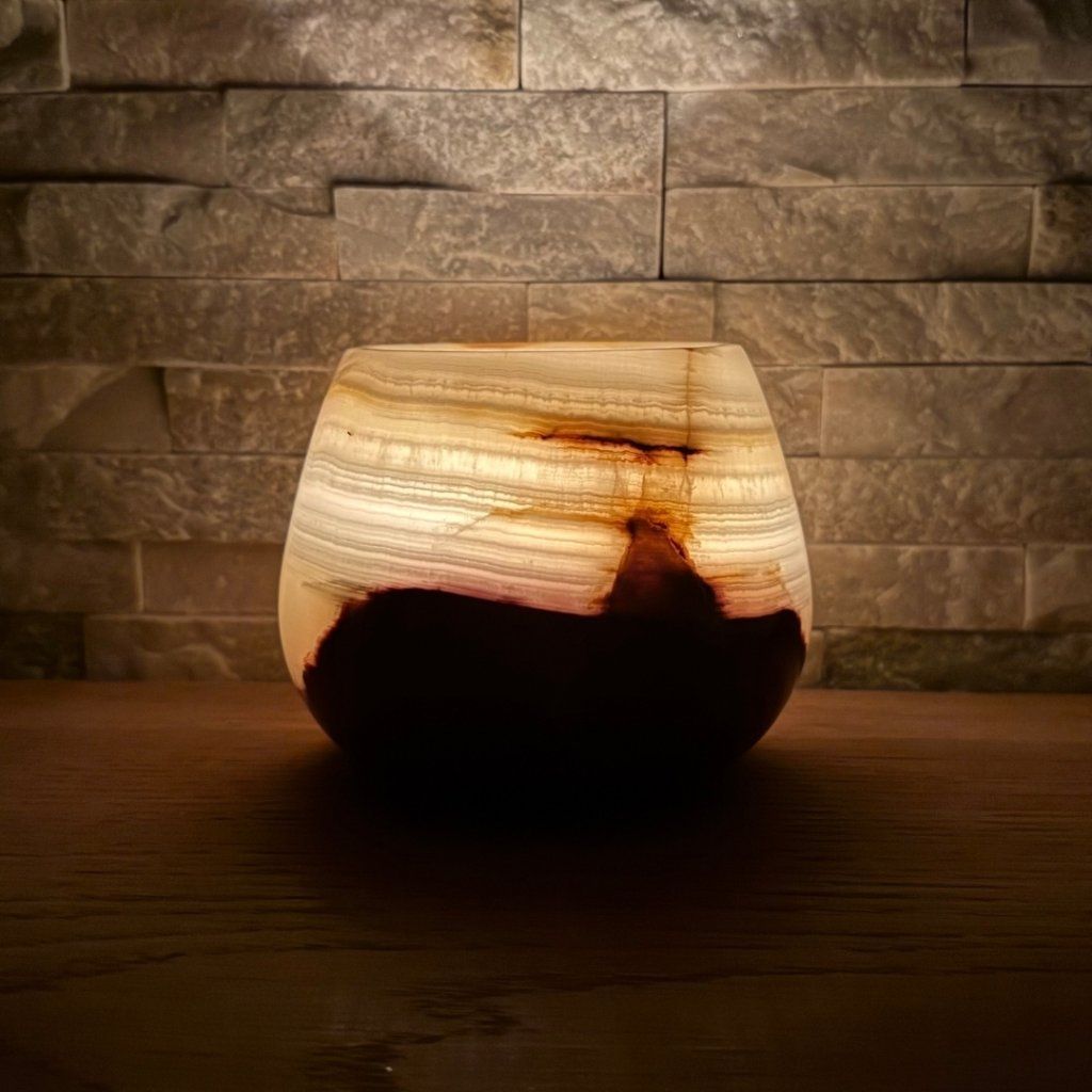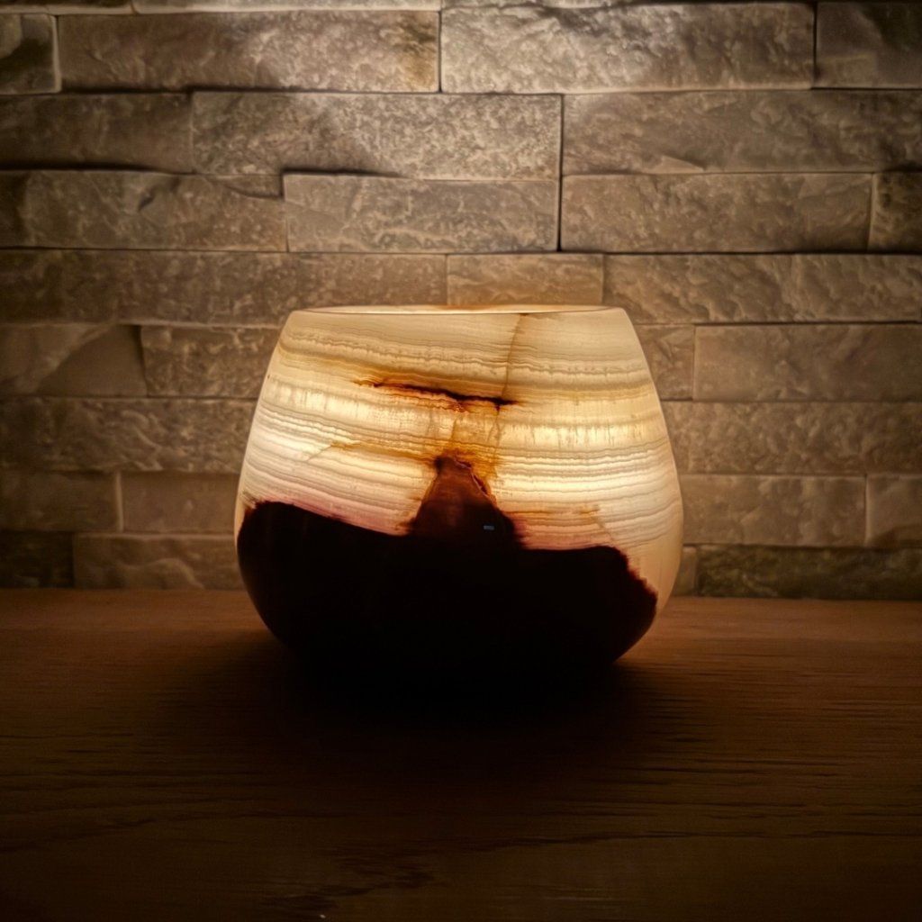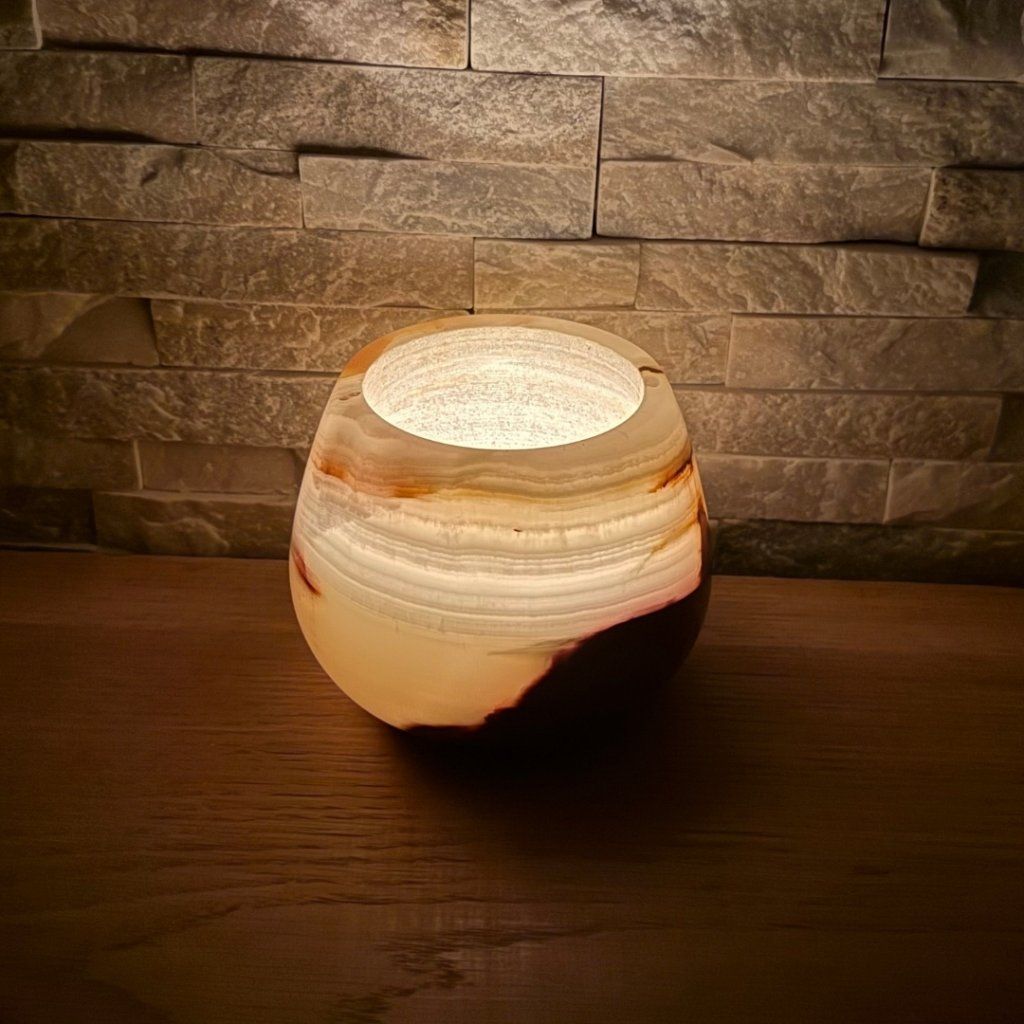 Svícen je vyroben z přírodního aragonitu, známého také jako pákistánský onyx. Tento kámen vyniká pevností, jemným leskem a přirozenou kresbou, která vznikala po tisíce let. Kupujete přesně ten svícen, který vidíte na fotografiích, žádný náhodný výběr, ale konkrétní originální kus.