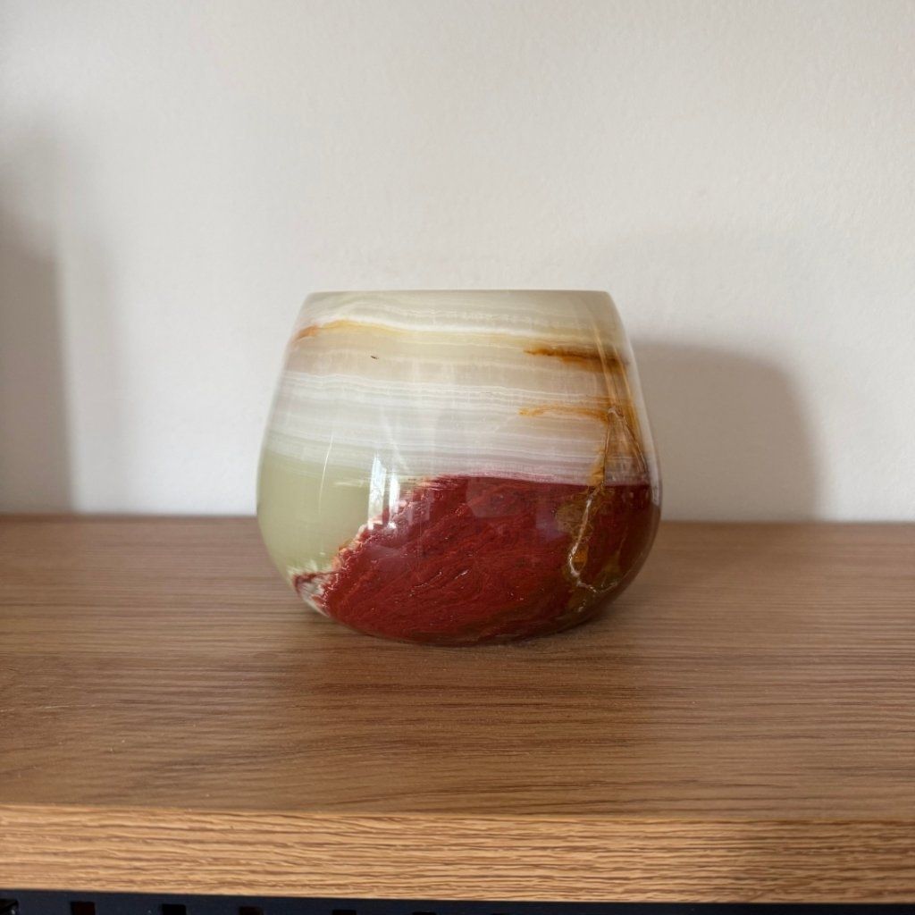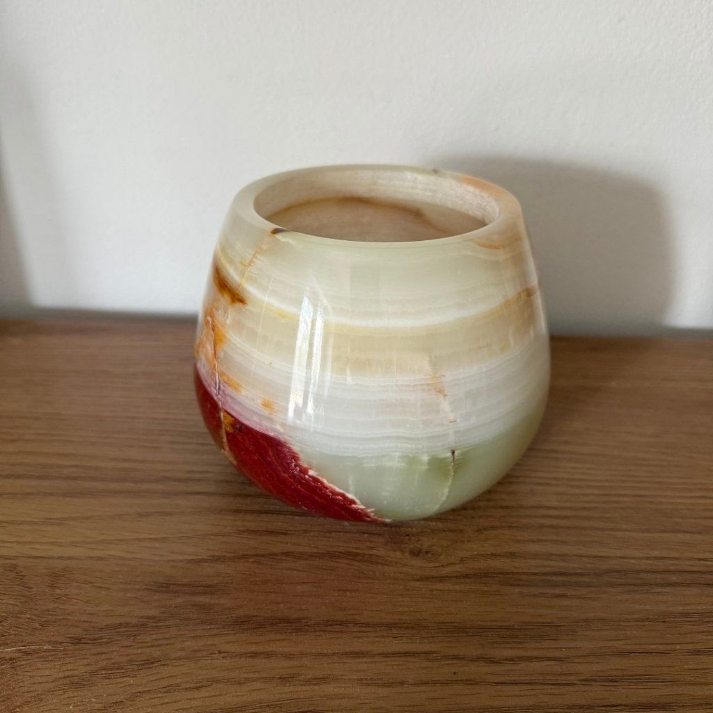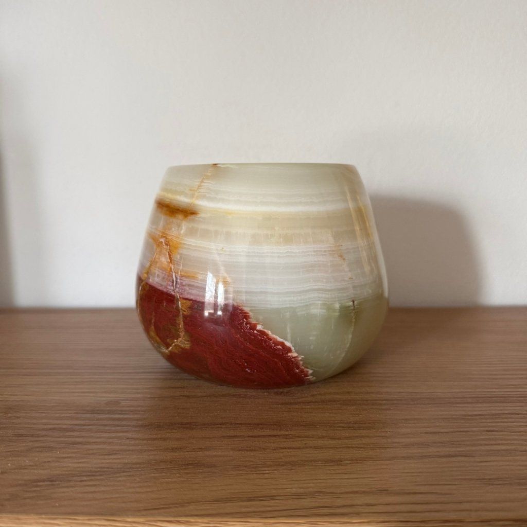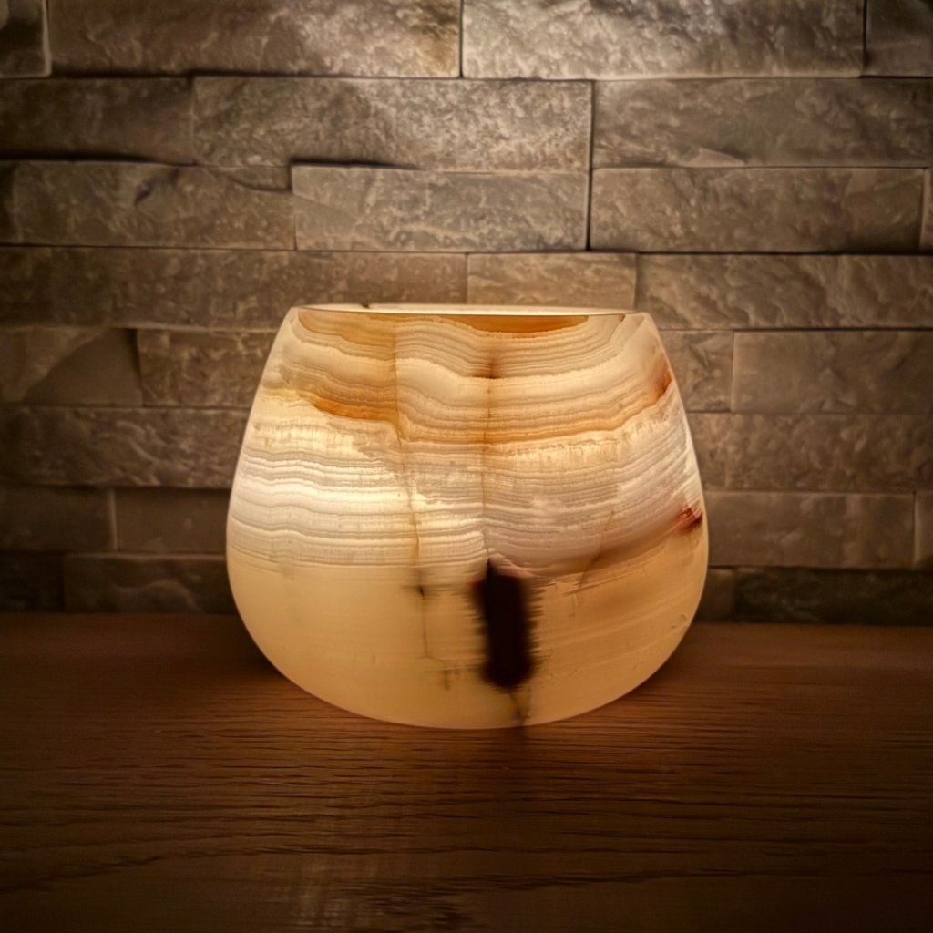 Svícen je vyroben z přírodního aragonitu, známého také jako pákistánský onyx. Tento kámen vyniká pevností, jemným leskem a přirozenou kresbou, která vznikala po tisíce let. Kupujete přesně ten svícen, který vidíte na fotografiích, žádný náhodný výběr, ale konkrétní originální kus.