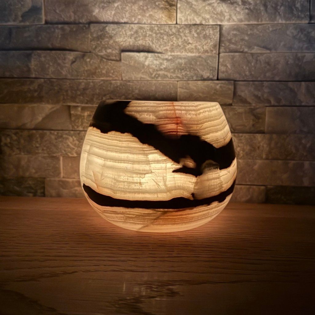 Každý svícen z aragonitu je jedinečný svým vzhledem. Tento konkrétní kus má přesně takovou strukturu, žilkování a barevnost, jakou vidíte na fotkách. Doporučujeme si fotogalerii projít opravdu pečlivě, abyste věděli, jaký svícen si domů vybíráte. Po zapálení čajové svíčky začne světlo jemně prosvítat kamenem a zvýrazní jeho přirozenou kresbu.