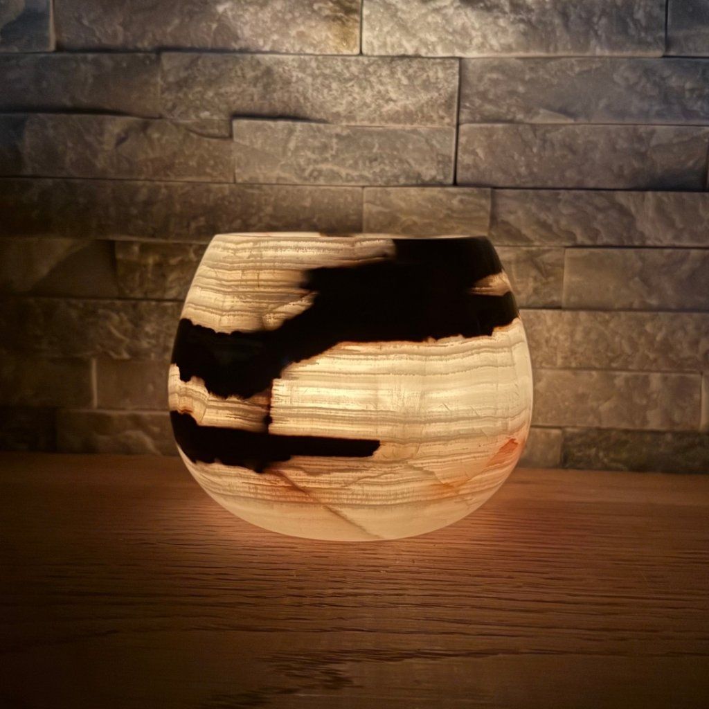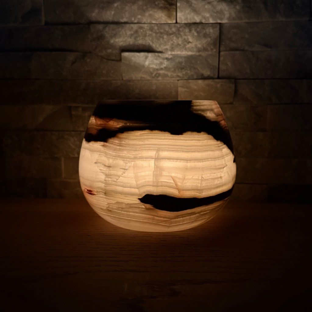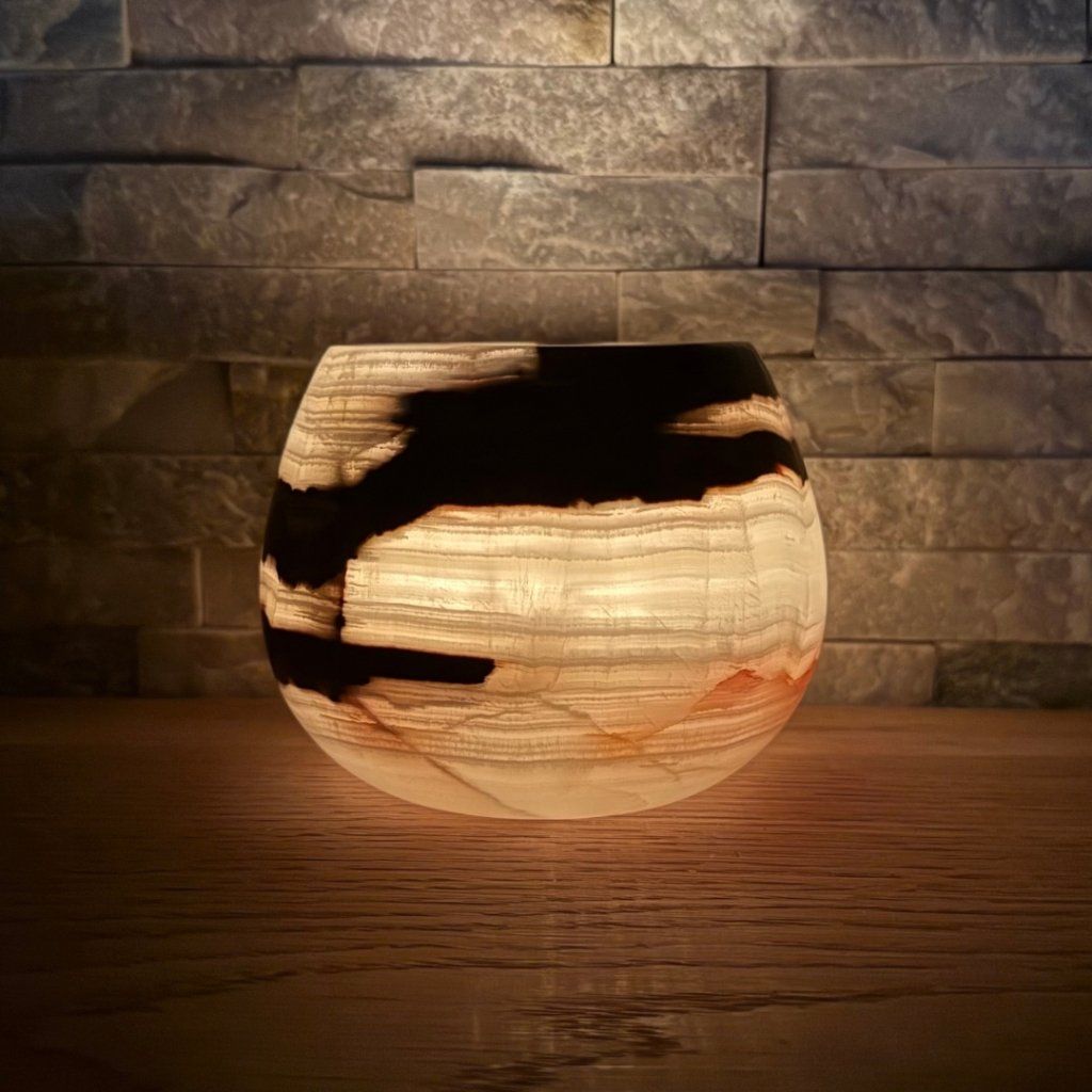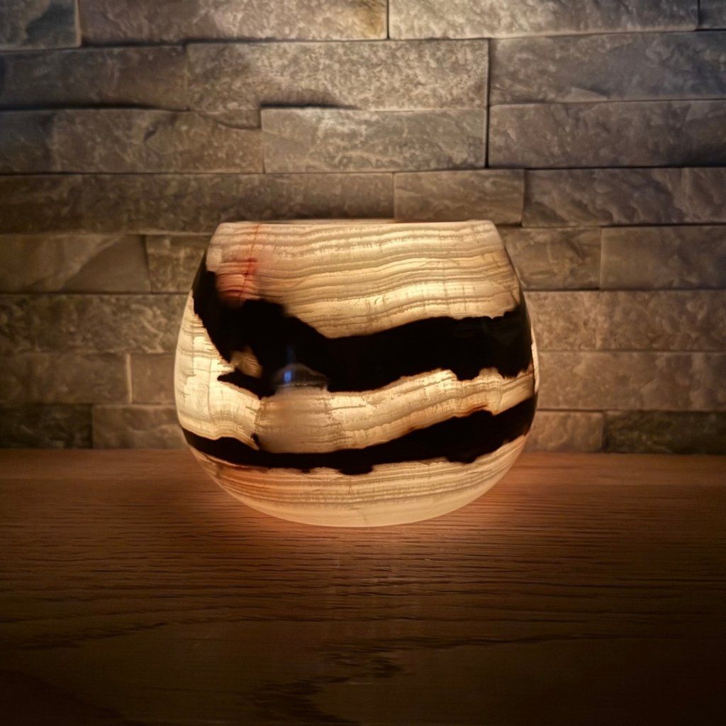 Svícen je vyroben z přírodního aragonitu, známého také jako pákistánský onyx. Tento kámen vyniká pevností, jemným leskem a přirozenou kresbou, která vznikala po tisíce let. Kupujete přesně ten svícen, který vidíte na fotografiích, žádný náhodný výběr, ale konkrétní originální kus.