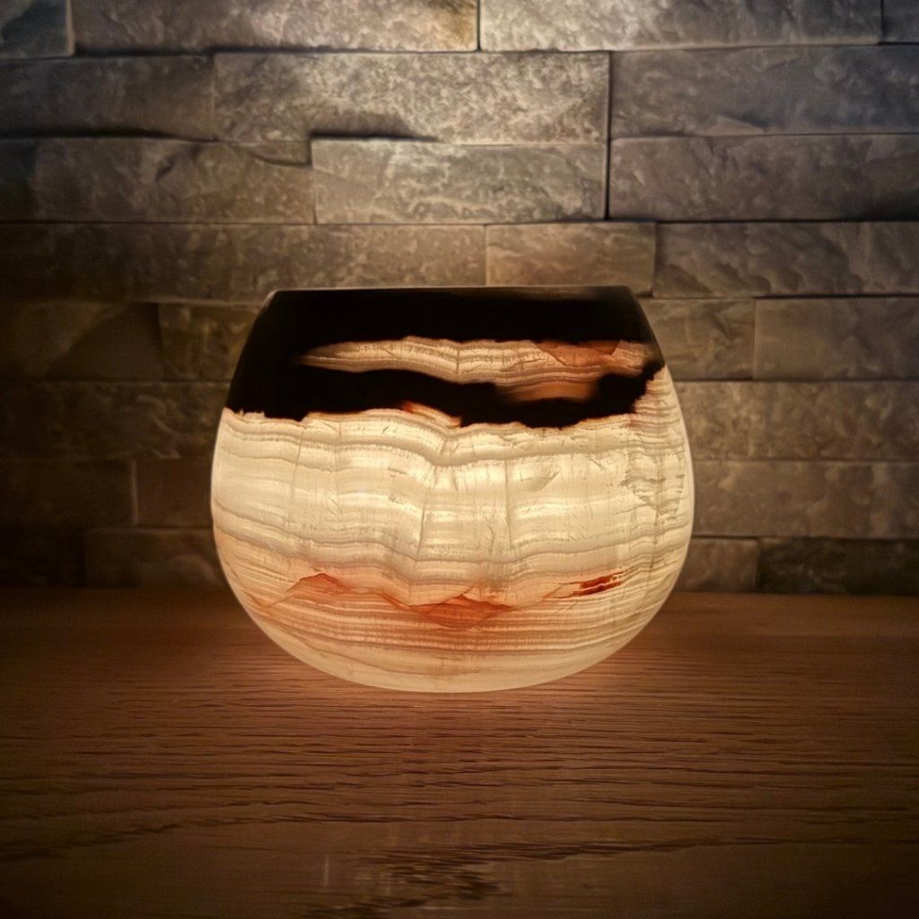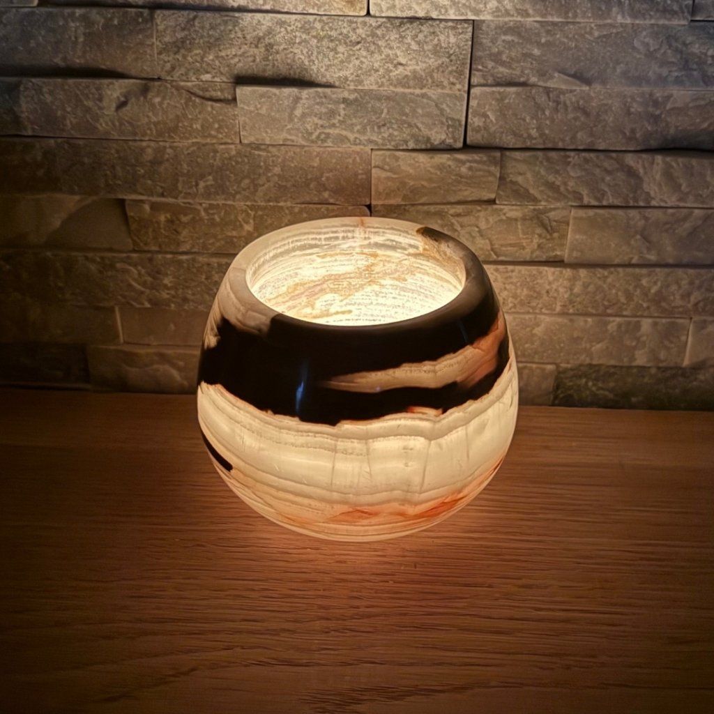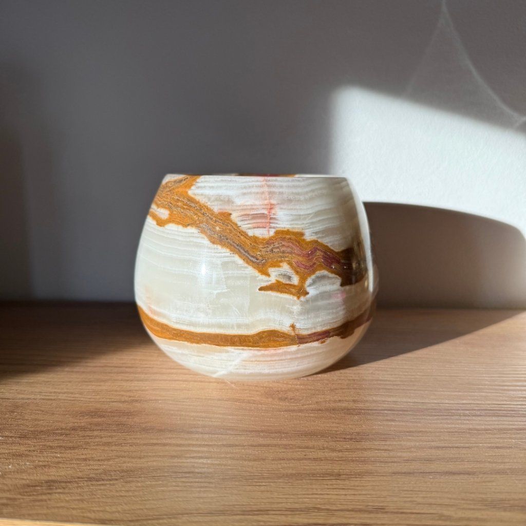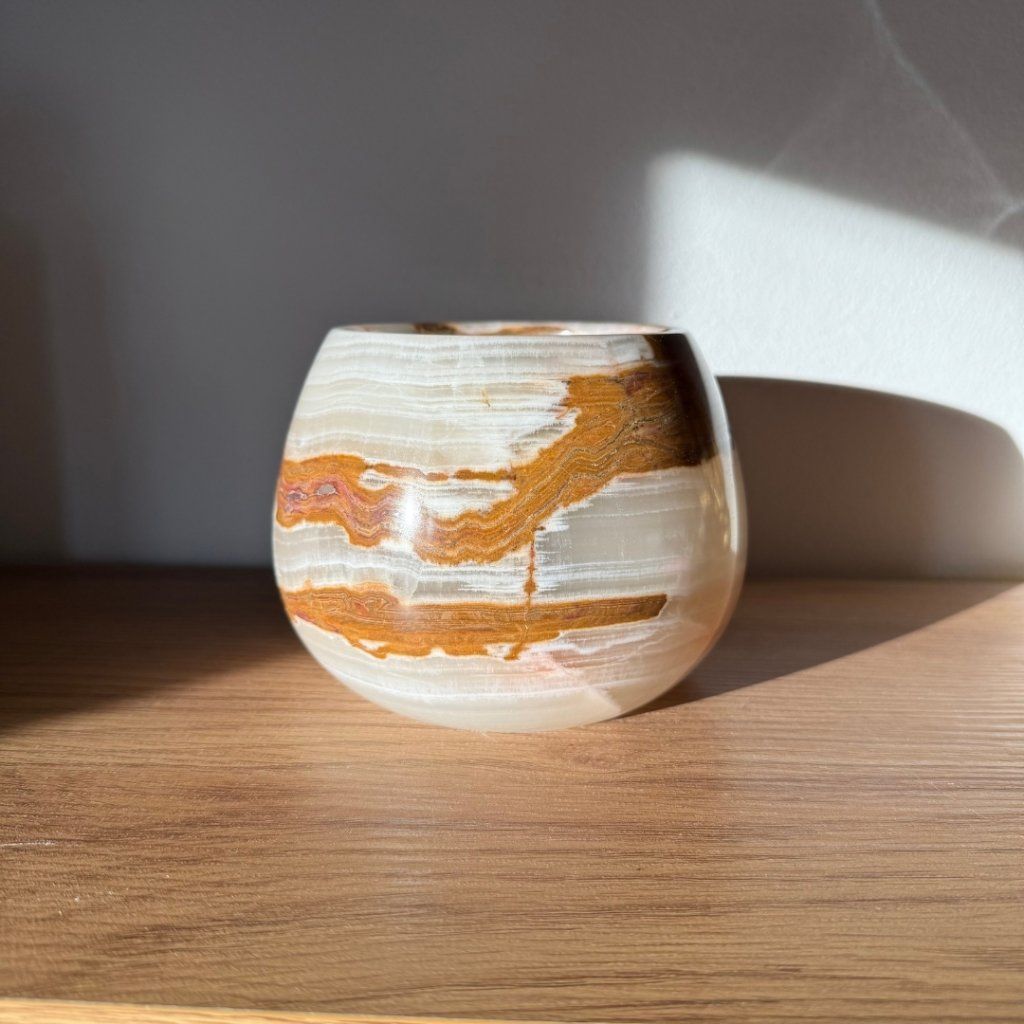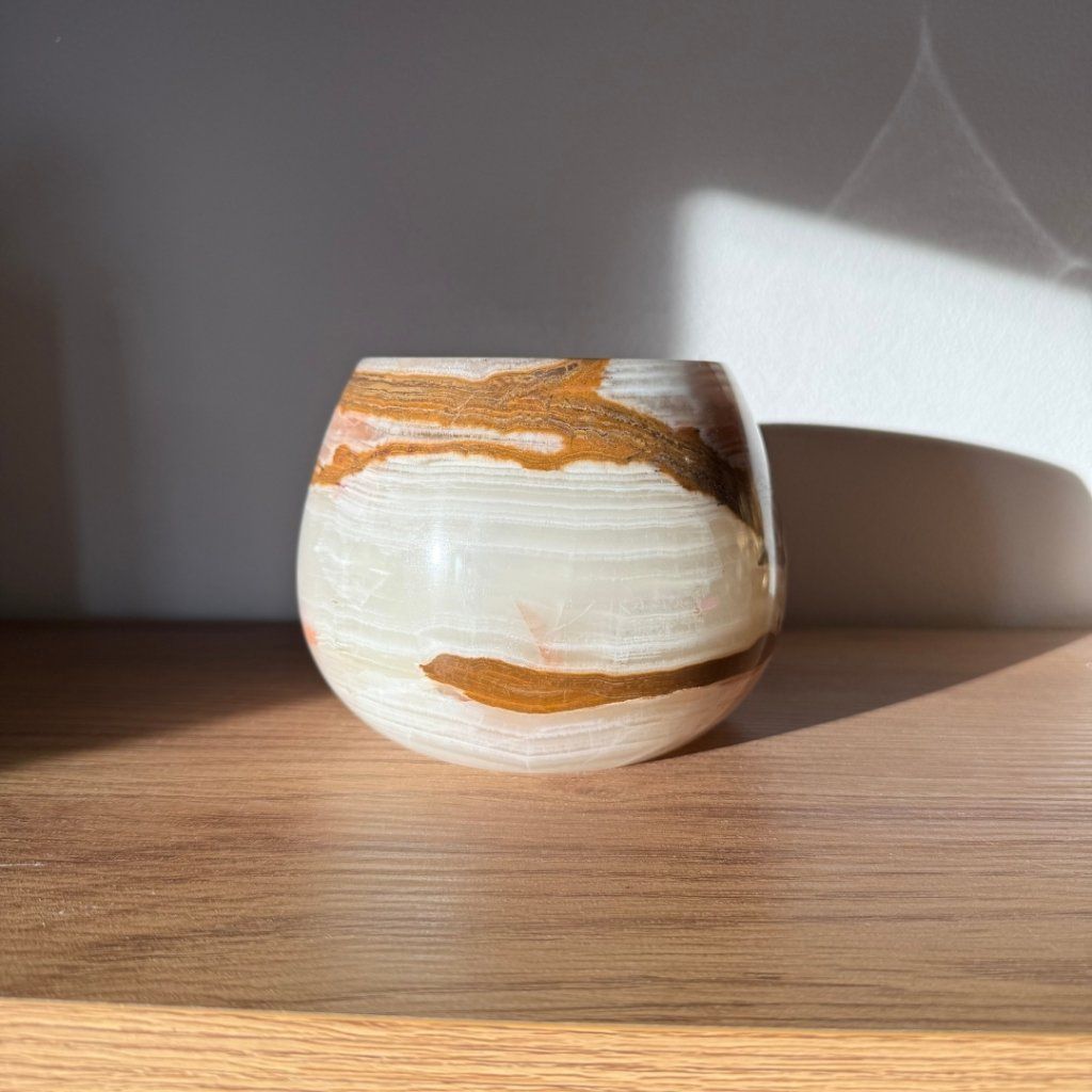 Svícen je vyroben z přírodního aragonitu, známého také jako pákistánský onyx. Tento kámen vyniká pevností, jemným leskem a přirozenou kresbou, která vznikala po tisíce let. Kupujete přesně ten svícen, který vidíte na fotografiích, žádný náhodný výběr, ale konkrétní originální kus.
