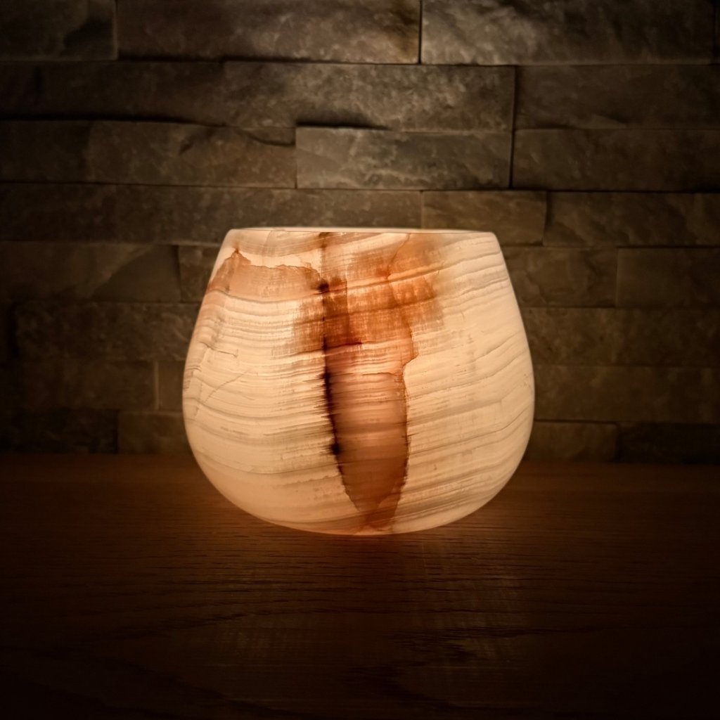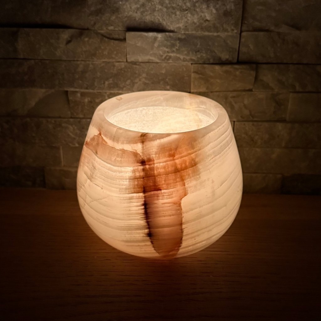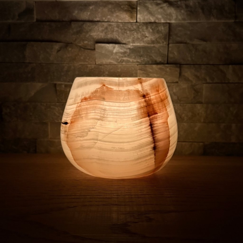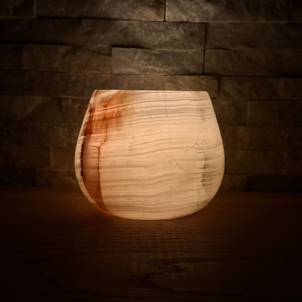 Svícen je vyroben z přírodního aragonitu, známého také jako pákistánský onyx. Tento kámen vyniká pevností, jemným leskem a přirozenou kresbou, která vznikala po tisíce let. Kupujete přesně ten svícen, který vidíte na fotografiích, žádný náhodný výběr, ale konkrétní originální kus.