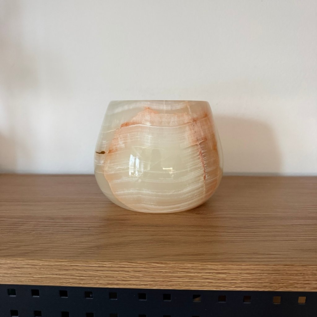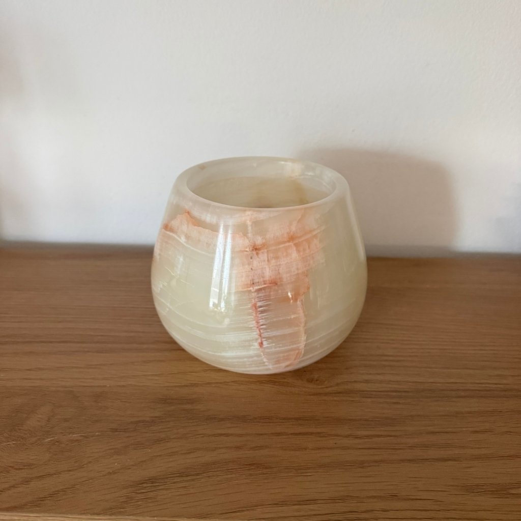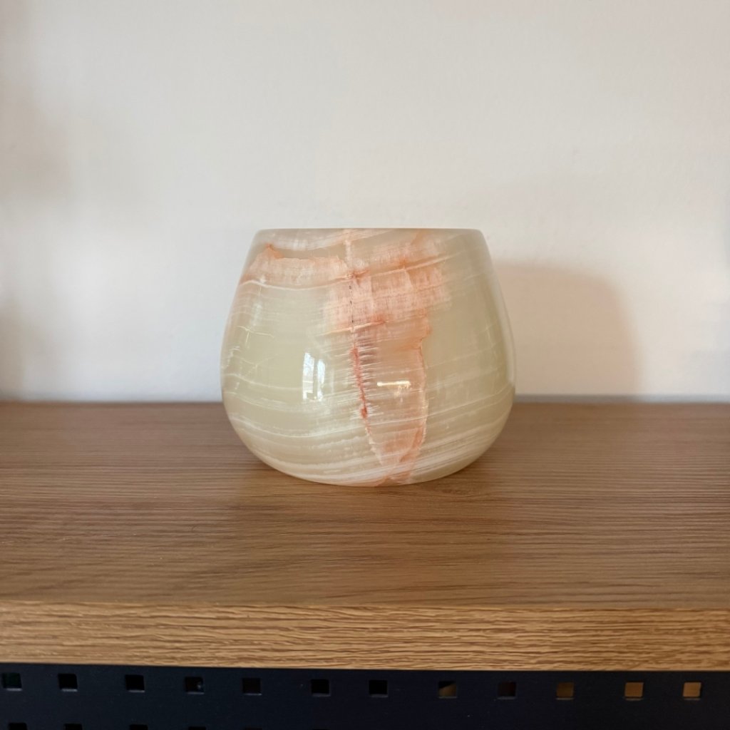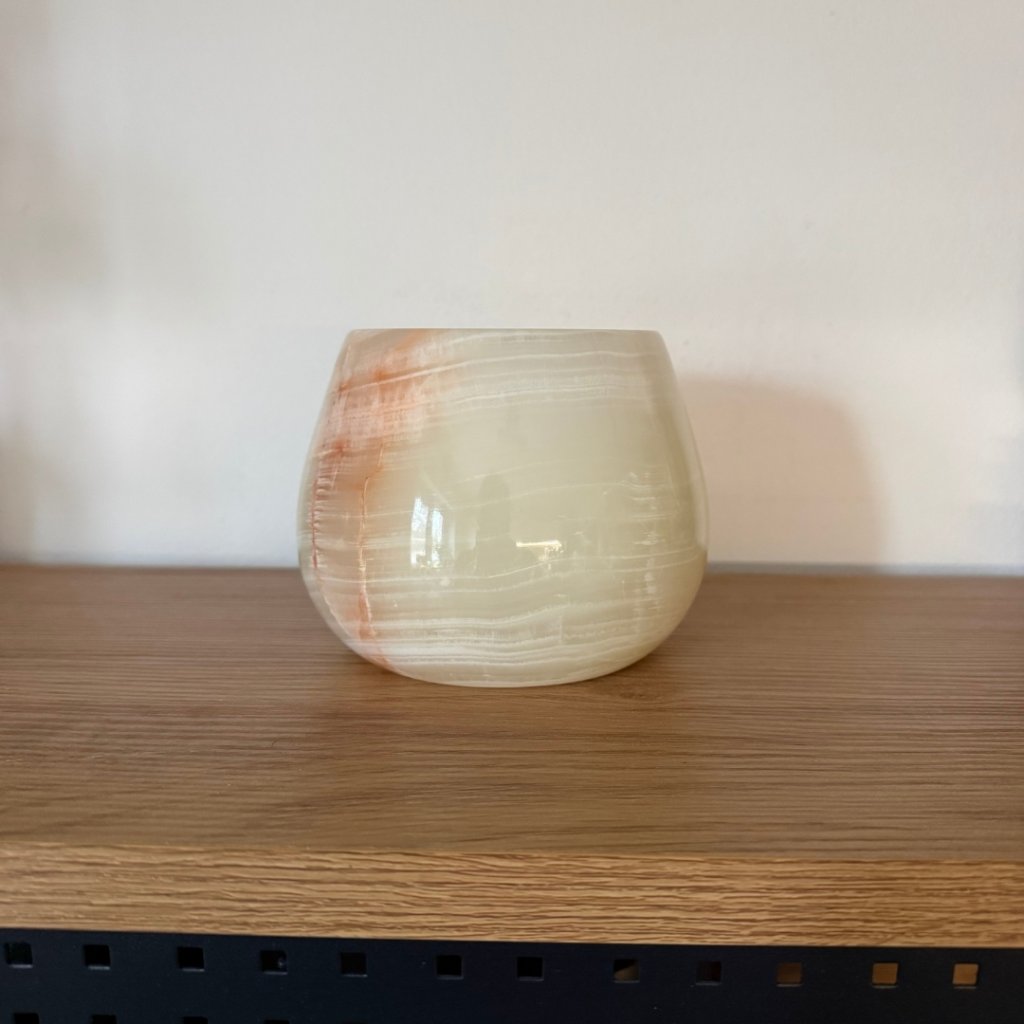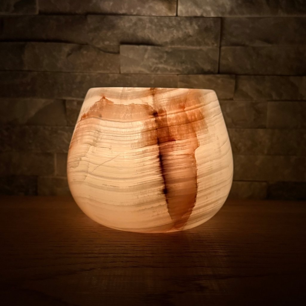 Svícen je vyroben z přírodního aragonitu, známého také jako pákistánský onyx. Tento kámen vyniká pevností, jemným leskem a přirozenou kresbou, která vznikala po tisíce let. Kupujete přesně ten svícen, který vidíte na fotografiích, žádný náhodný výběr, ale konkrétní originální kus.
