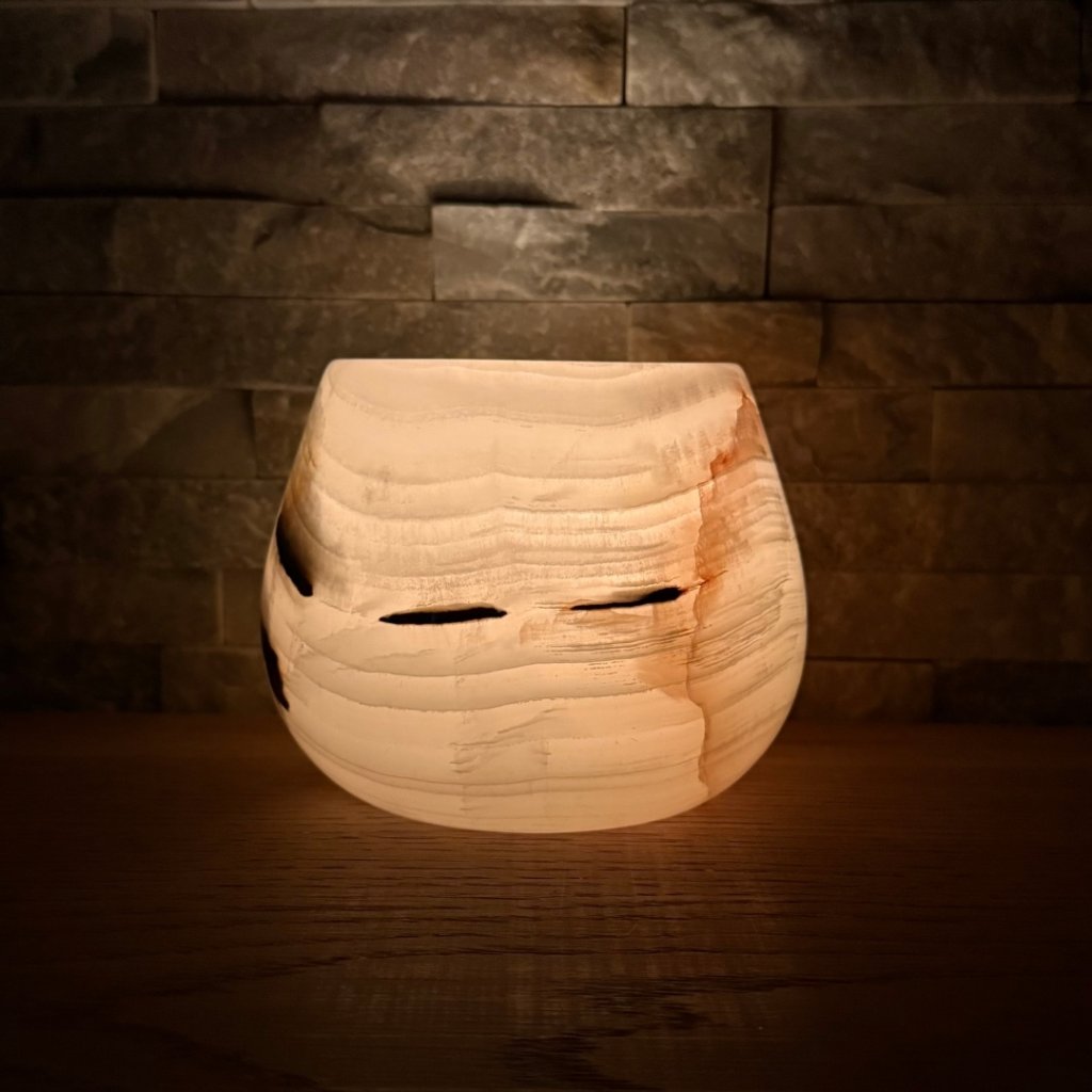 Každý svícen z aragonitu je jedinečný svým vzhledem. Tento konkrétní kus má přesně takovou strukturu, žilkování a barevnost, jakou vidíte na fotkách. Doporučujeme si fotogalerii projít opravdu pečlivě, abyste věděli, jaký svícen si domů vybíráte. Po zapálení čajové svíčky začne světlo jemně prosvítat kamenem a zvýrazní jeho přirozenou kresbu.