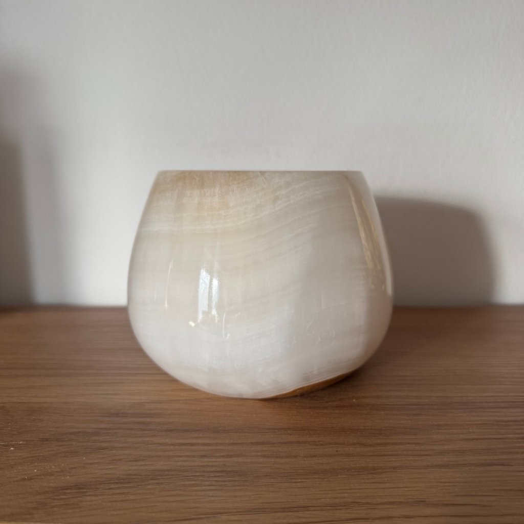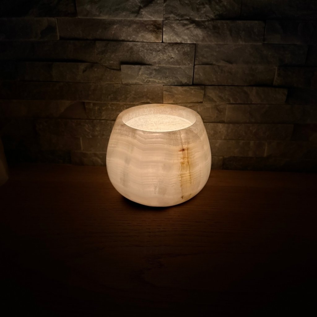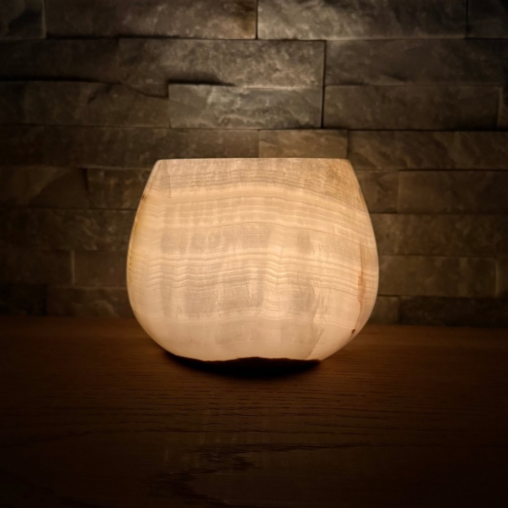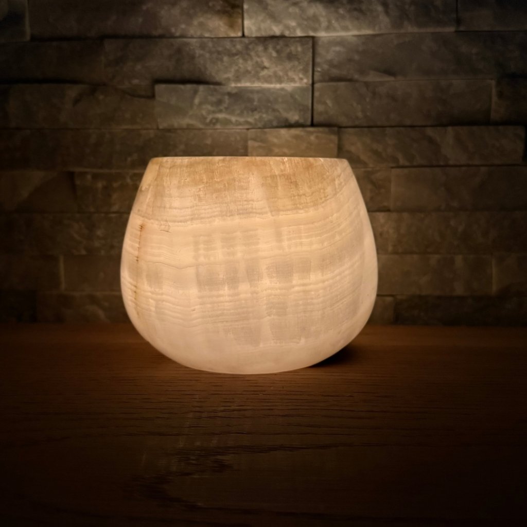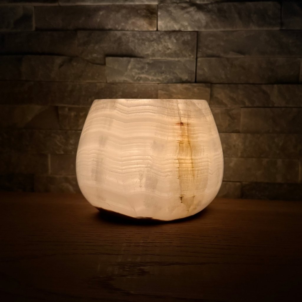 Svícen je vyroben z přírodního aragonitu, známého také jako pákistánský onyx. Tento kámen vyniká pevností, jemným leskem a přirozenou kresbou, která vznikala po tisíce let. Kupujete přesně ten svícen, který vidíte na fotografiích, žádný náhodný výběr, ale konkrétní originální kus.