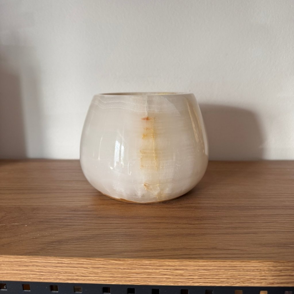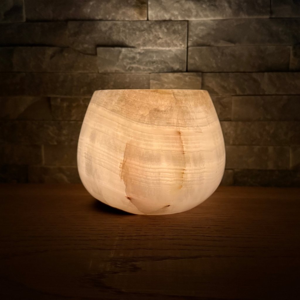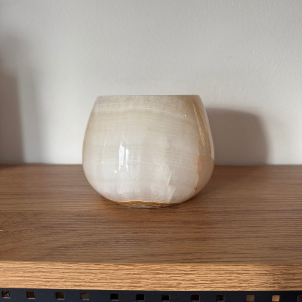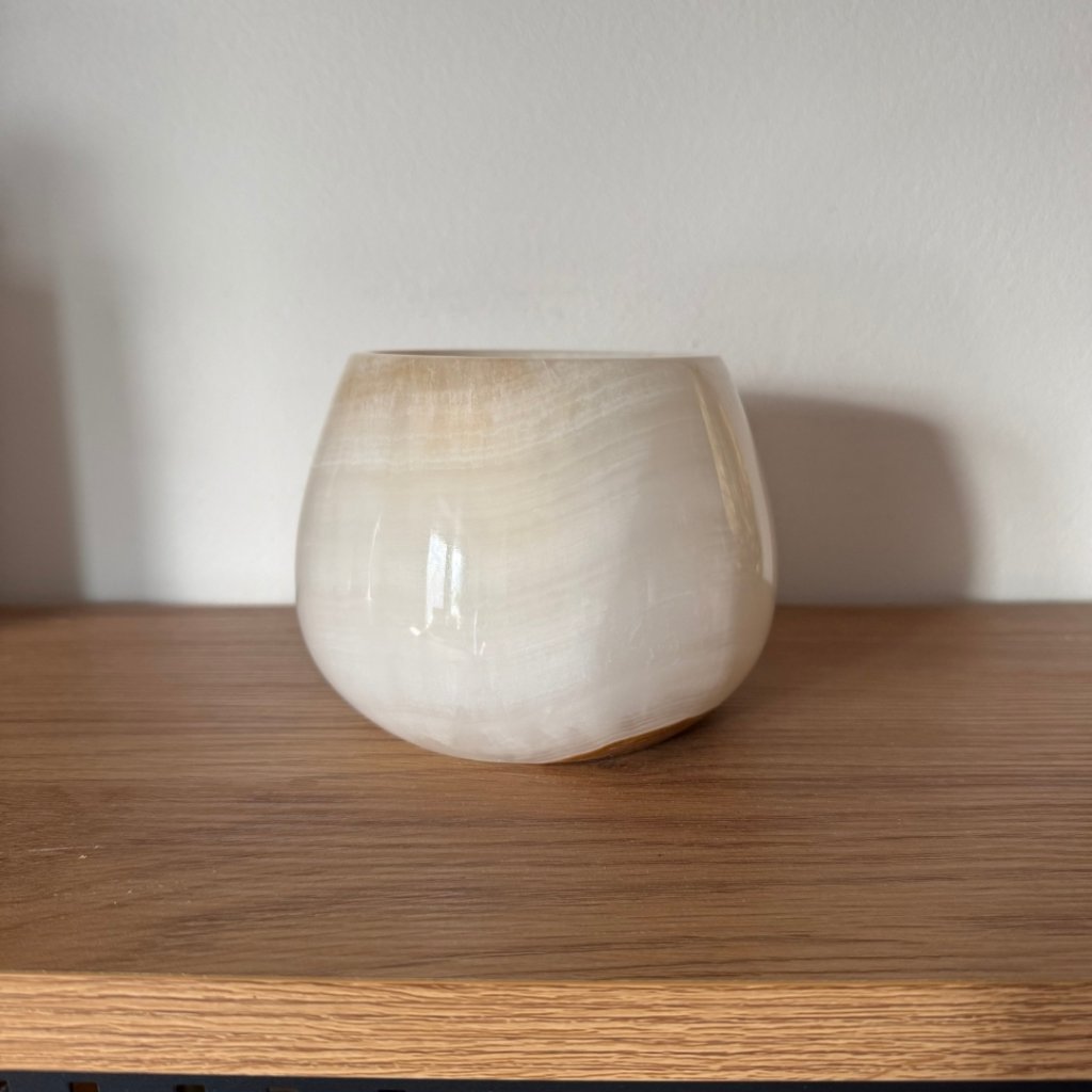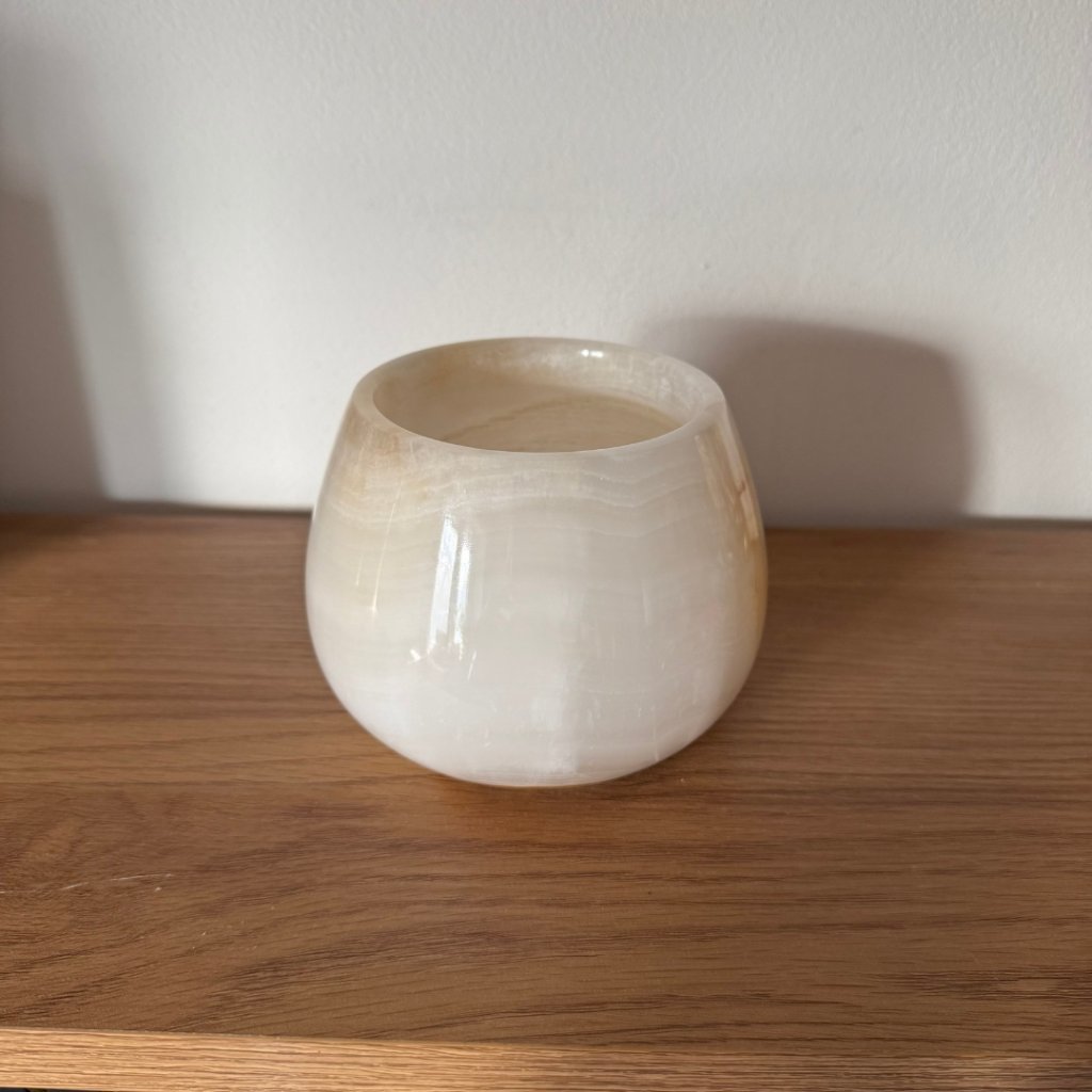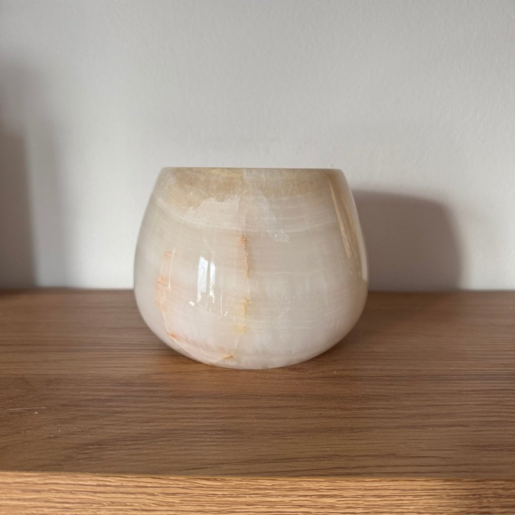 Svícen je vyroben z přírodního aragonitu, známého také jako pákistánský onyx. Tento kámen vyniká pevností, jemným leskem a přirozenou kresbou, která vznikala po tisíce let. Kupujete přesně ten svícen, který vidíte na fotografiích, žádný náhodný výběr, ale konkrétní originální kus.