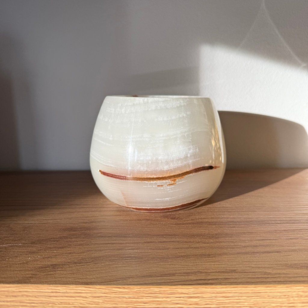 Svícen je vyroben z přírodního aragonitu, známého také jako pákistánský onyx. Tento kámen vyniká pevností, jemným leskem a přirozenou kresbou, která vznikala po tisíce let. Kupujete přesně ten svícen, který vidíte na fotografiích, žádný náhodný výběr, ale konkrétní originální kus.