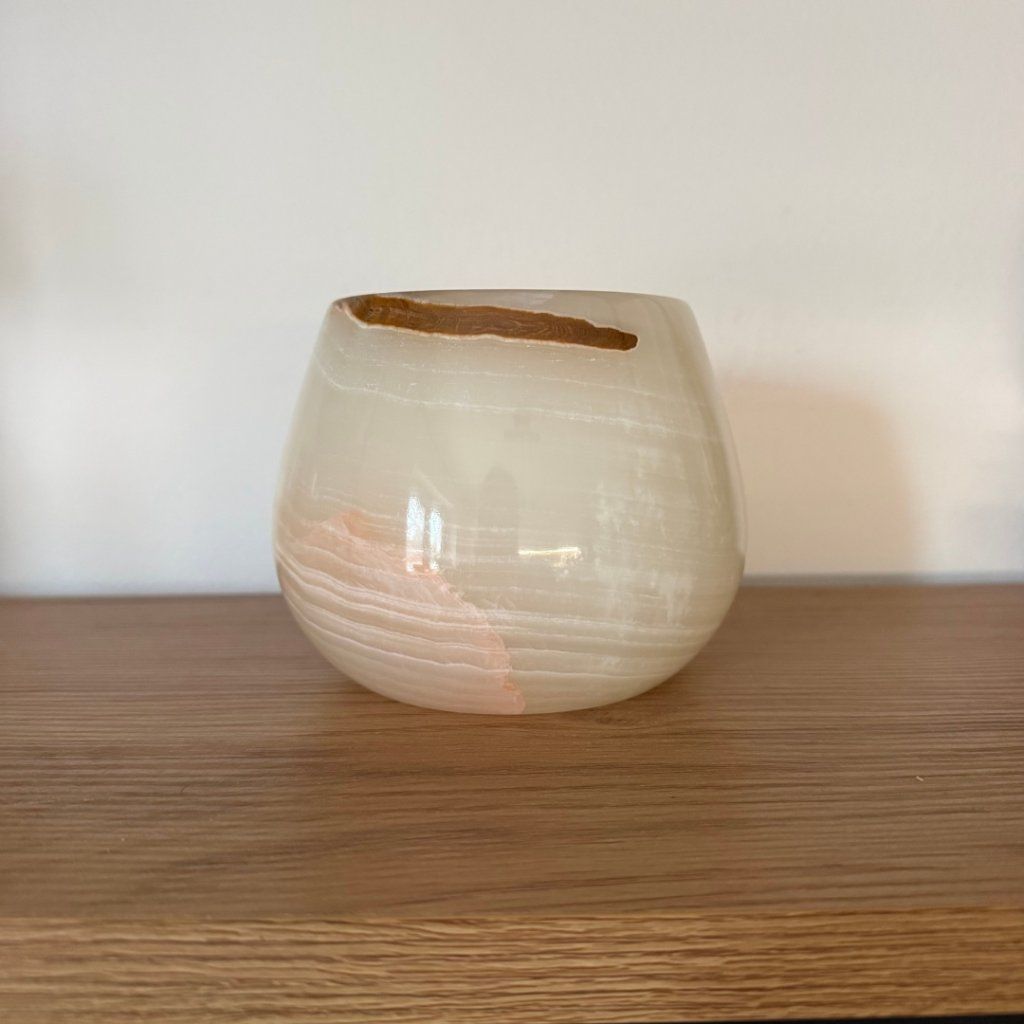 Svícen je vyroben z přírodního aragonitu, známého také jako pákistánský onyx. Tento kámen vyniká pevností, jemným leskem a přirozenou kresbou, která vznikala po tisíce let. Kupujete přesně ten svícen, který vidíte na fotografiích, žádný náhodný výběr, ale konkrétní originální kus.