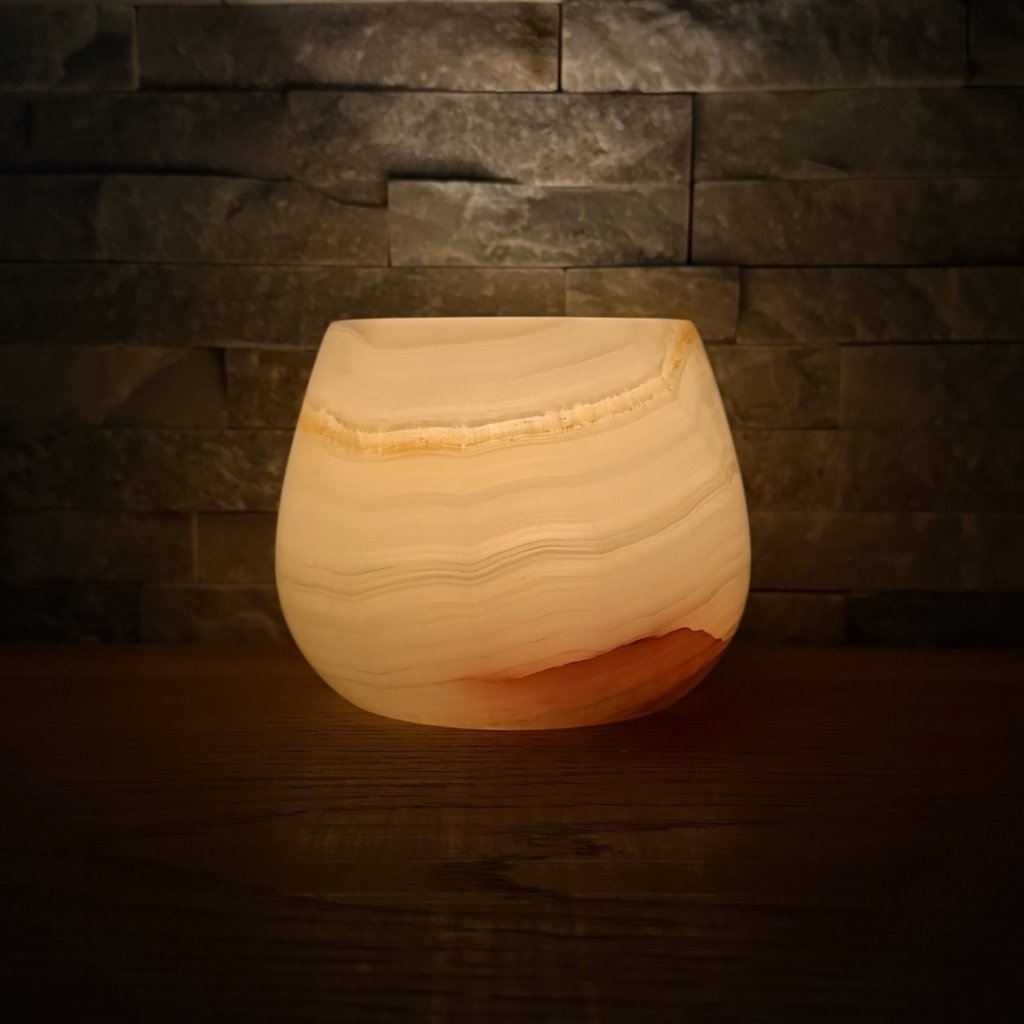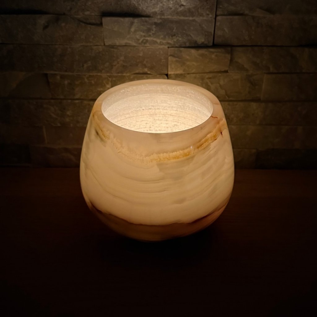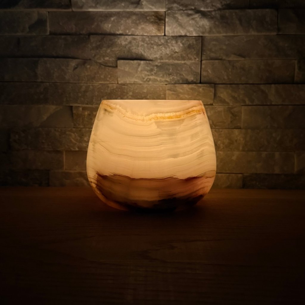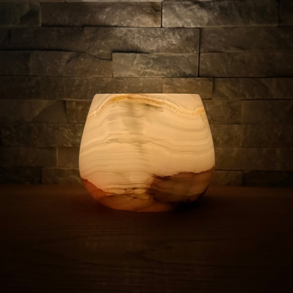 Svícen je vyroben z přírodního aragonitu, známého také jako pákistánský onyx. Tento kámen vyniká pevností, jemným leskem a přirozenou kresbou, která vznikala po tisíce let. Kupujete přesně ten svícen, který vidíte na fotografiích, žádný náhodný výběr, ale konkrétní originální kus.