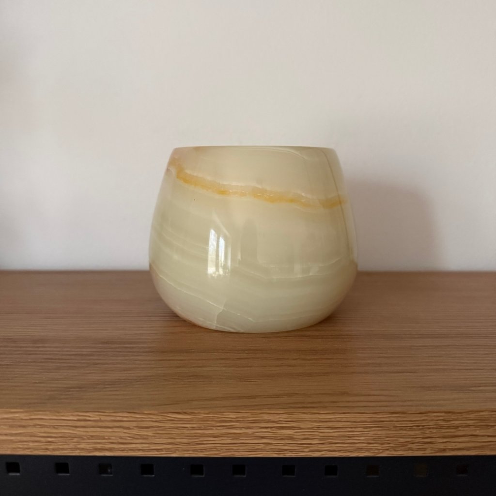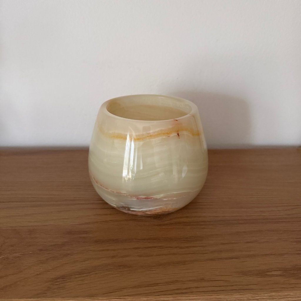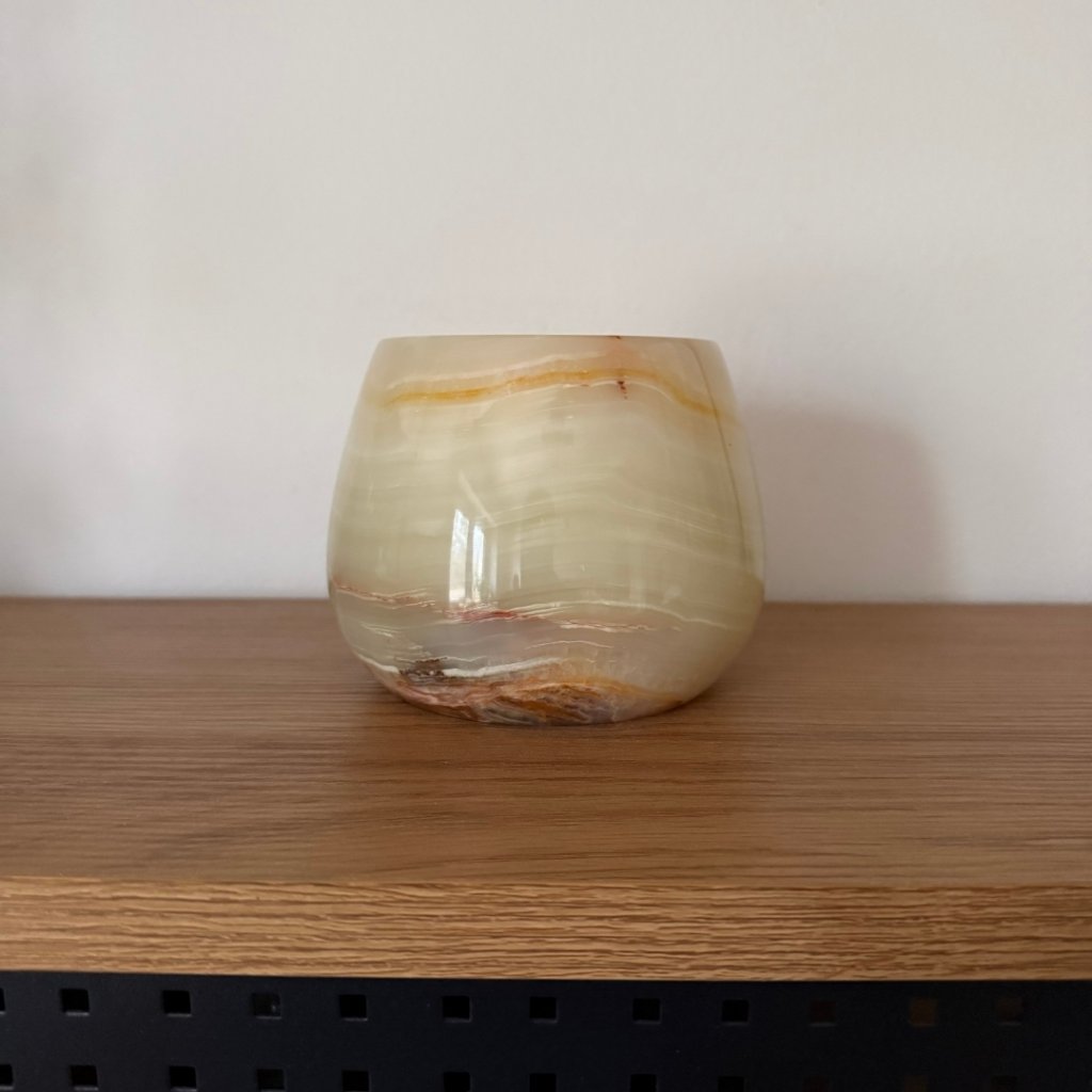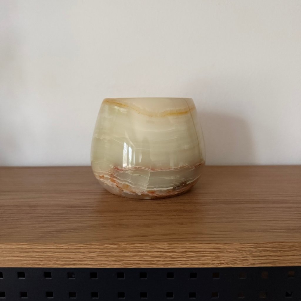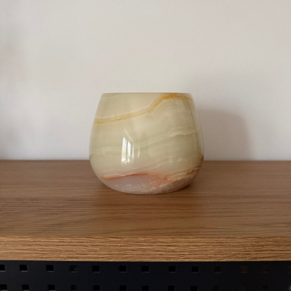Svícen je vyroben z přírodního aragonitu, známého také jako pákistánský onyx. Tento kámen vyniká pevností, jemným leskem a přirozenou kresbou, která vznikala po tisíce let. Kupujete přesně ten svícen, který vidíte na fotografiích, žádný náhodný výběr, ale konkrétní originální kus.