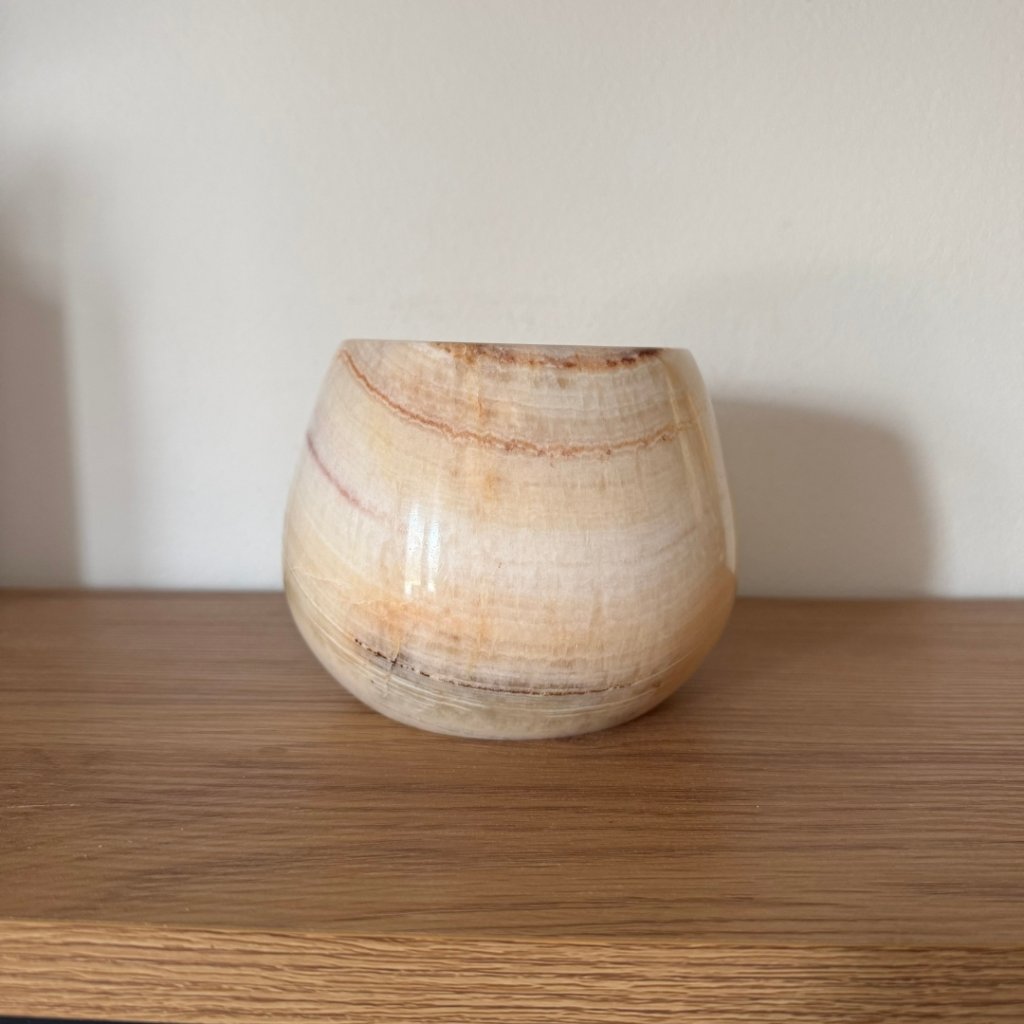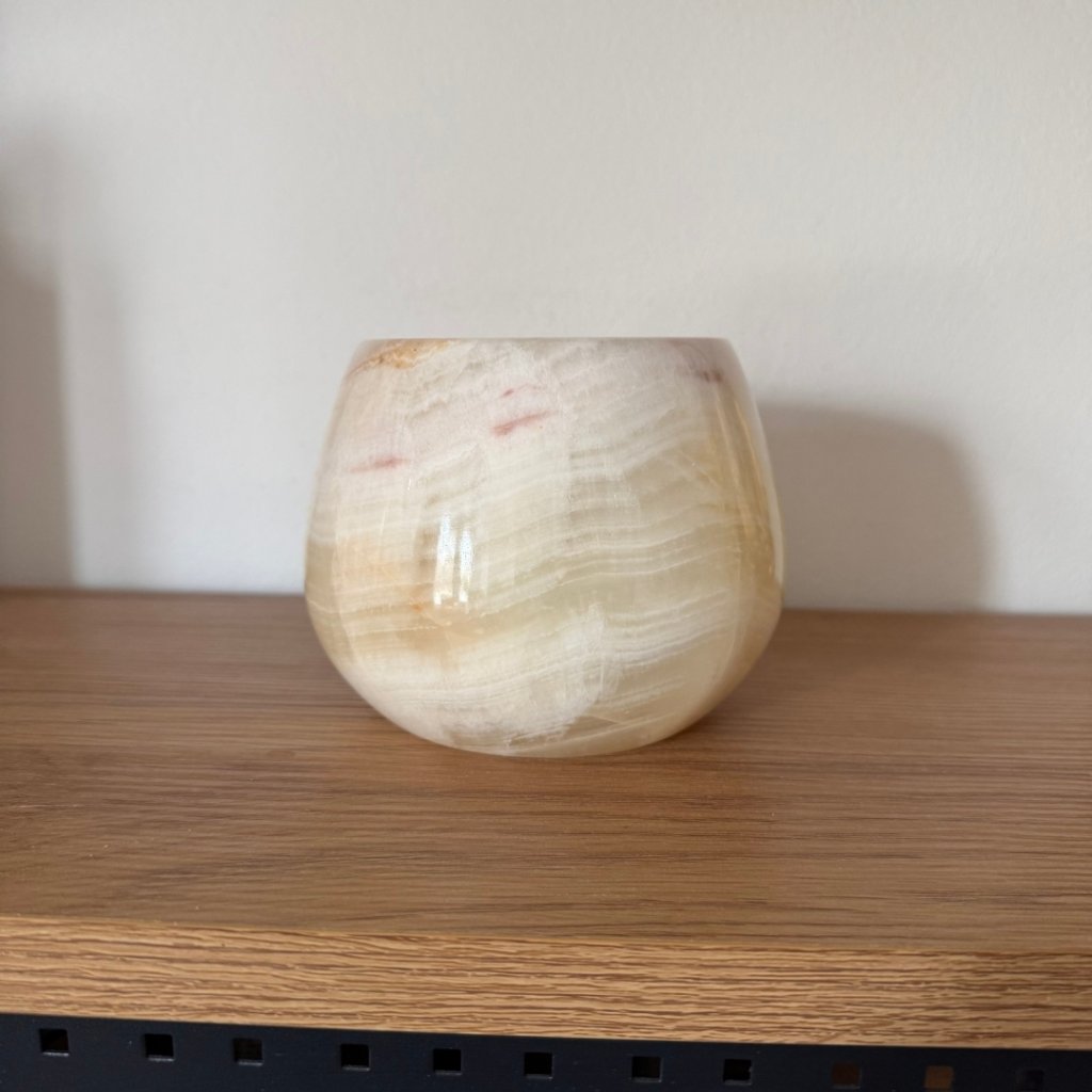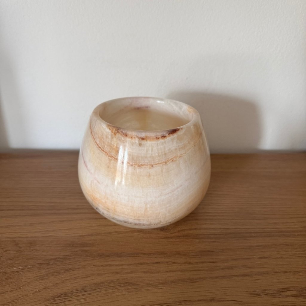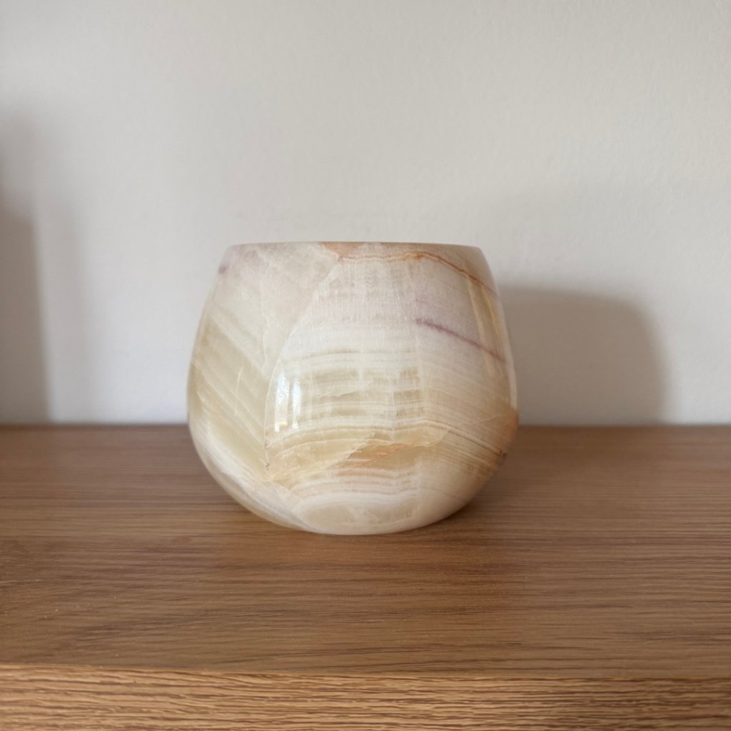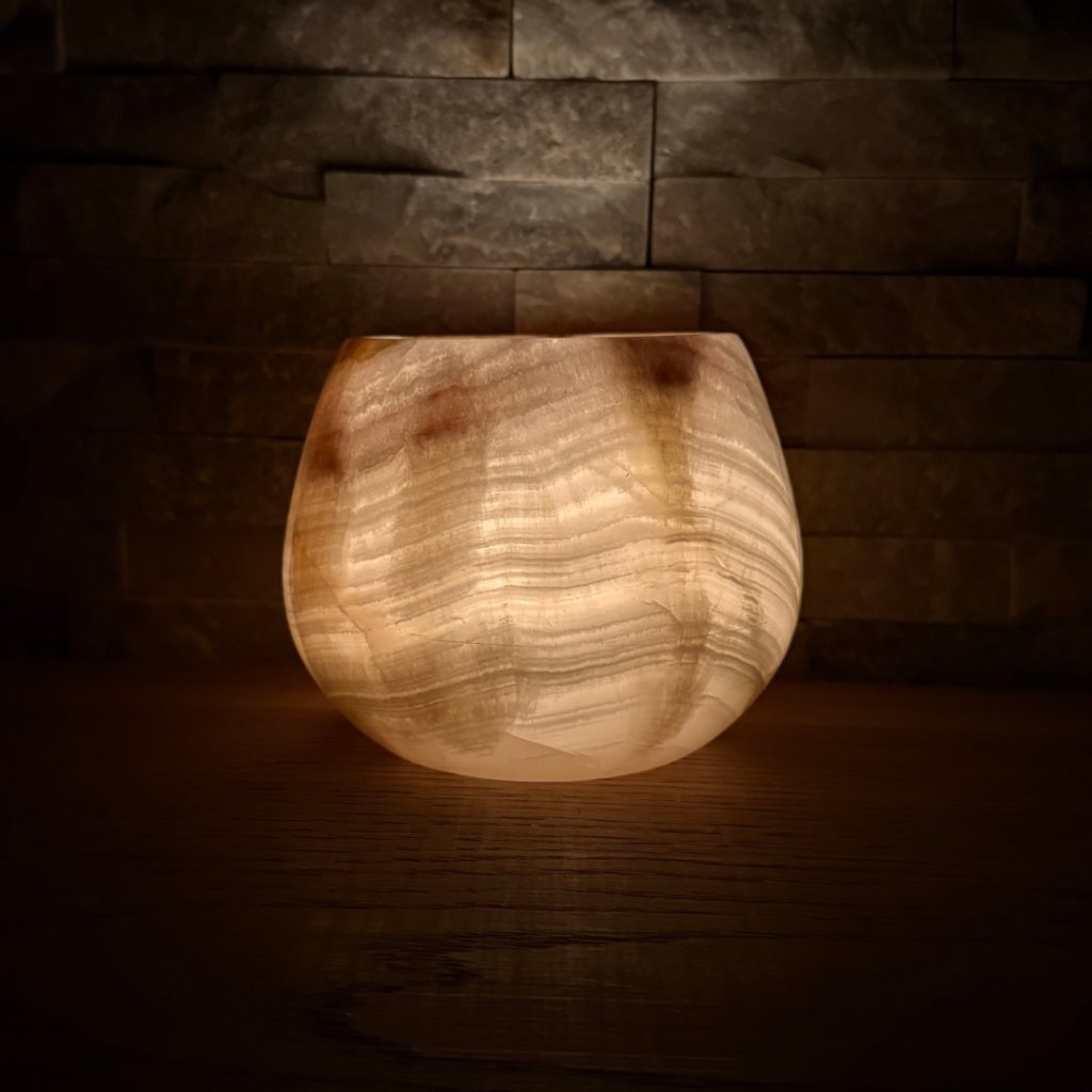 Svícen je vyroben z přírodního aragonitu, známého také jako pákistánský onyx. Tento kámen vyniká pevností, jemným leskem a přirozenou kresbou, která vznikala po tisíce let. Kupujete přesně ten svícen, který vidíte na fotografiích, žádný náhodný výběr, ale konkrétní originální kus.