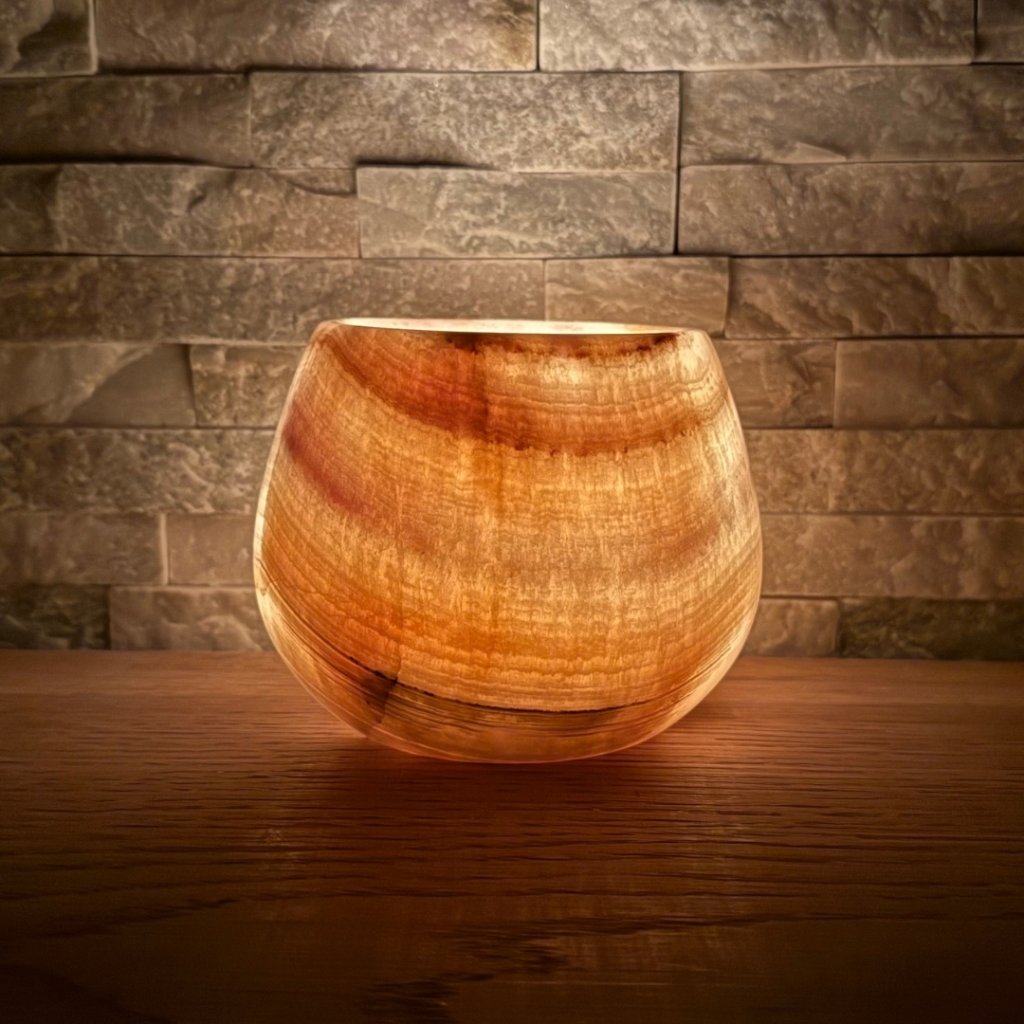 Každý svícen z aragonitu je jedinečný svým vzhledem. Tento konkrétní kus má přesně takovou strukturu, žilkování a barevnost, jakou vidíte na fotkách. Doporučujeme si fotogalerii projít opravdu pečlivě, abyste věděli, jaký svícen si domů vybíráte. Po zapálení čajové svíčky začne světlo jemně prosvítat kamenem a zvýrazní jeho přirozenou kresbu.