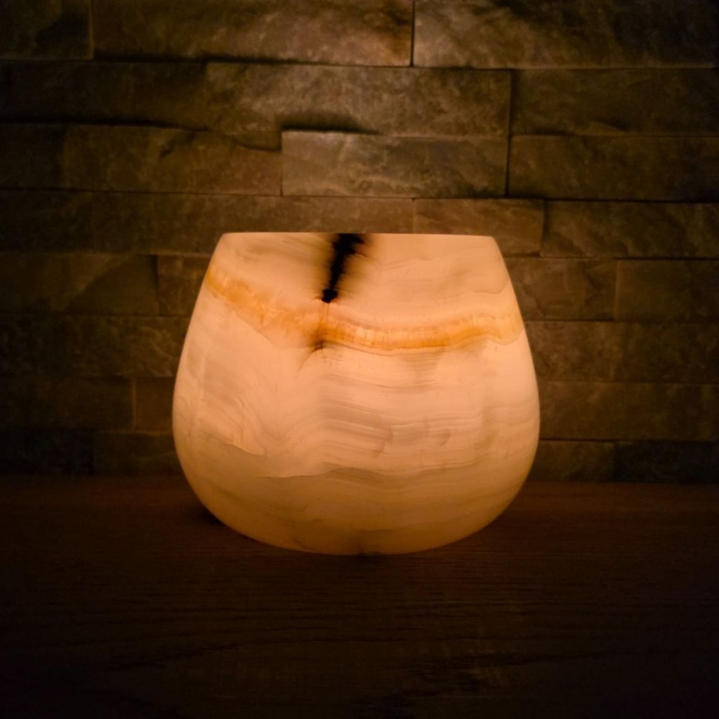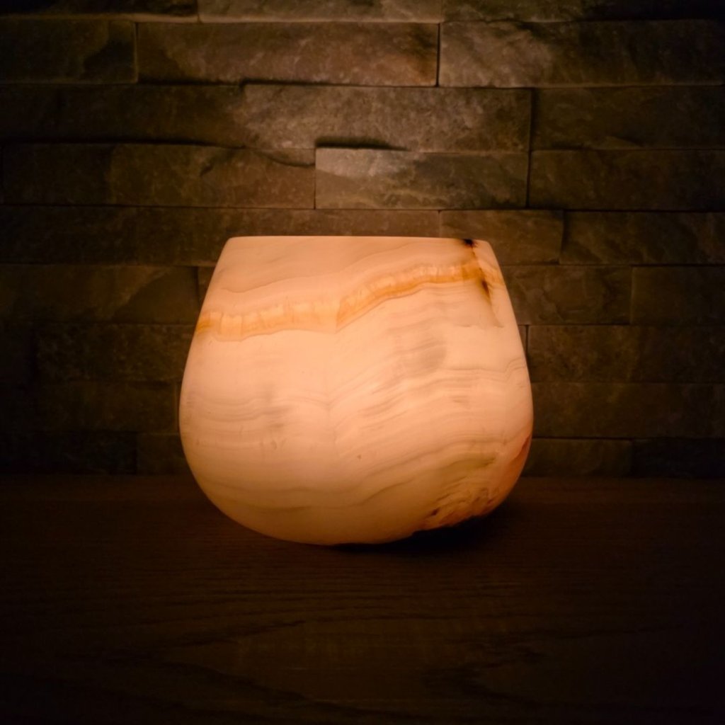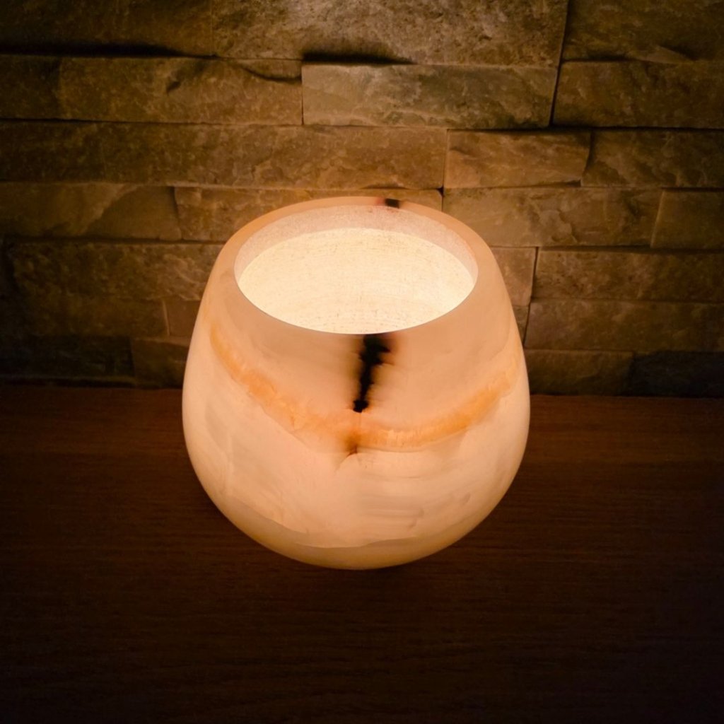 Svícen je vyroben z přírodního aragonitu, známého také jako pákistánský onyx. Tento kámen vyniká pevností, jemným leskem a přirozenou kresbou, která vznikala po tisíce let. Kupujete přesně ten svícen, který vidíte na fotografiích, žádný náhodný výběr, ale konkrétní originální kus.