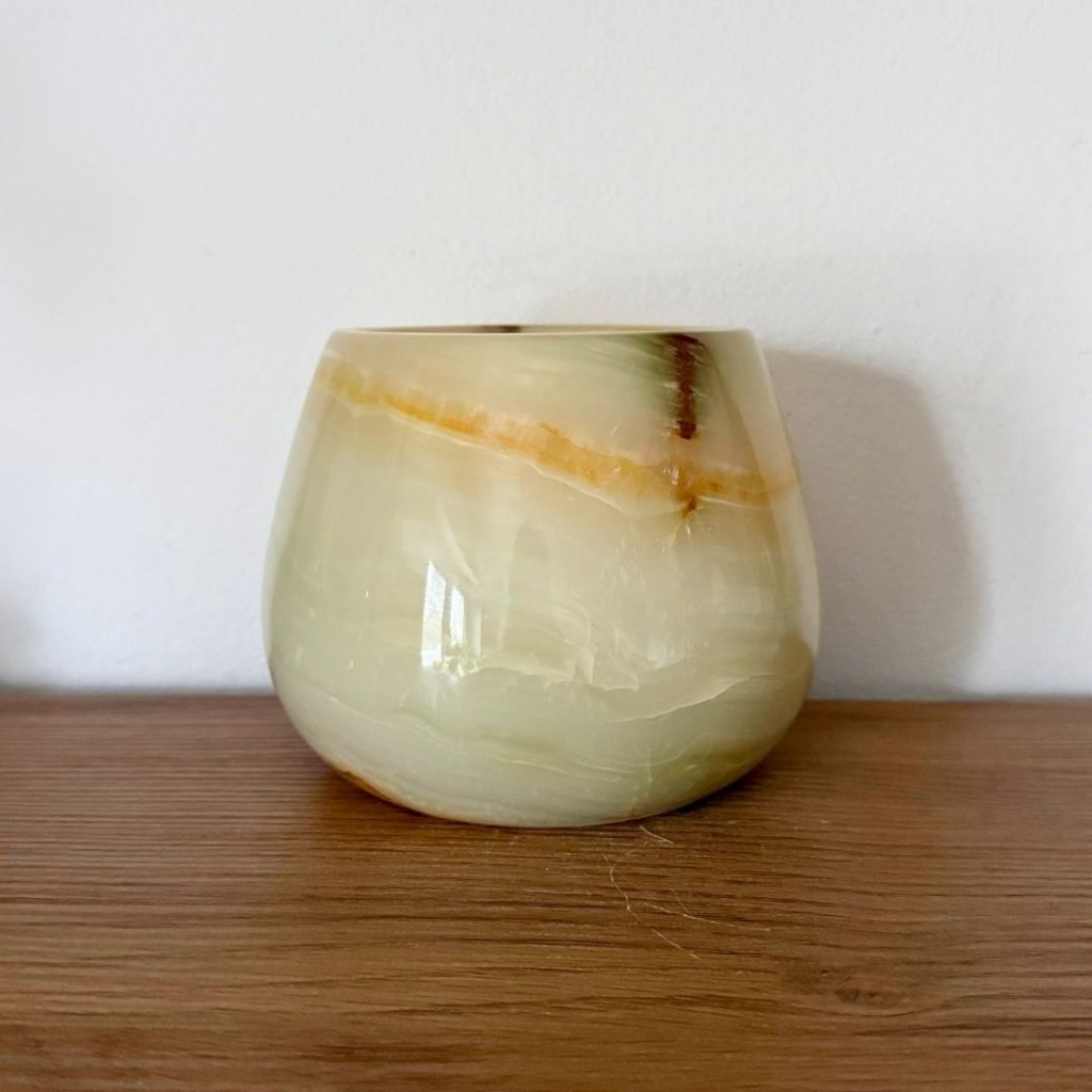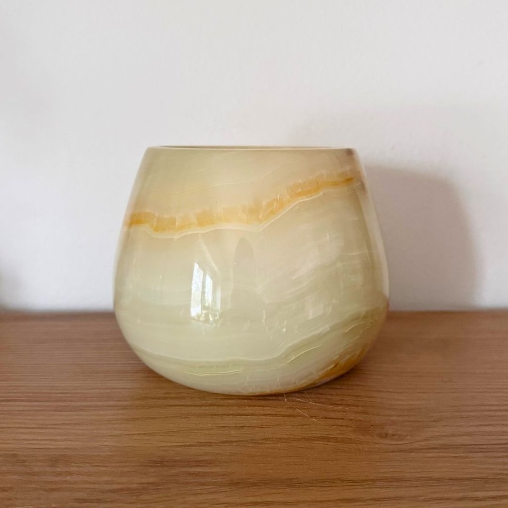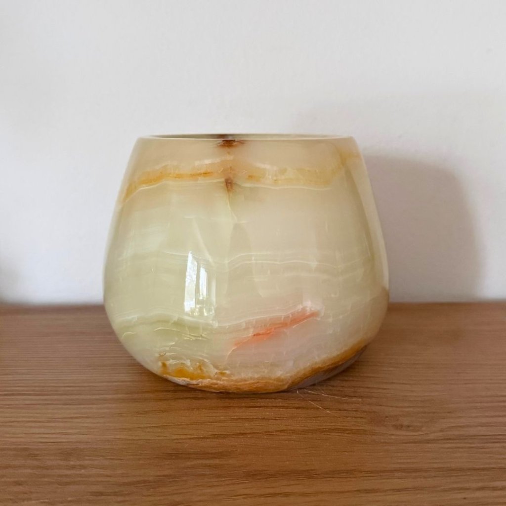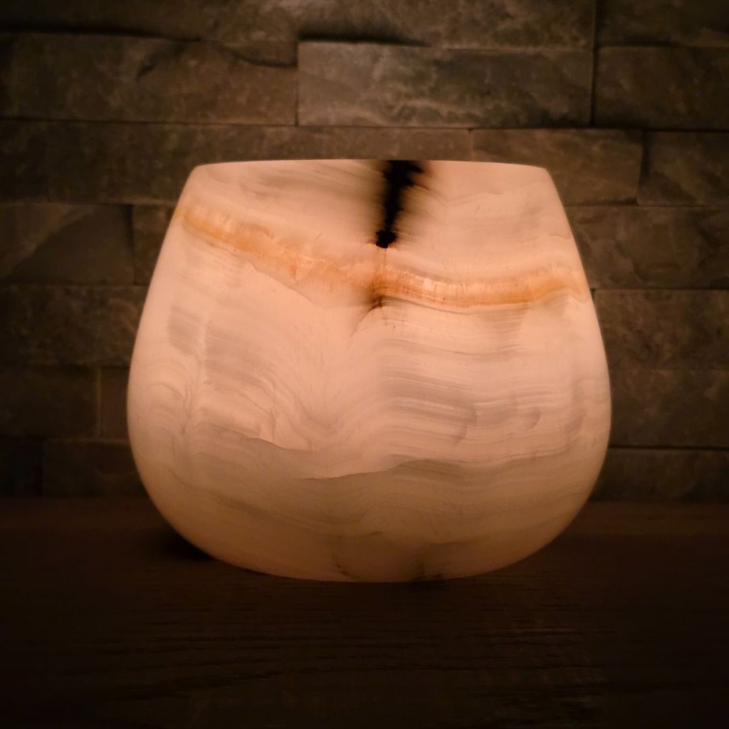 Svícen je vyroben z přírodního aragonitu, známého také jako pákistánský onyx. Tento kámen vyniká pevností, jemným leskem a přirozenou kresbou, která vznikala po tisíce let. Kupujete přesně ten svícen, který vidíte na fotografiích, žádný náhodný výběr, ale konkrétní originální kus.