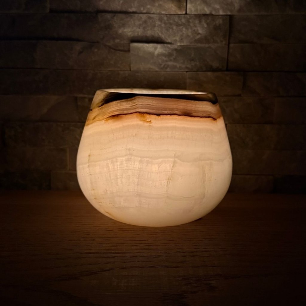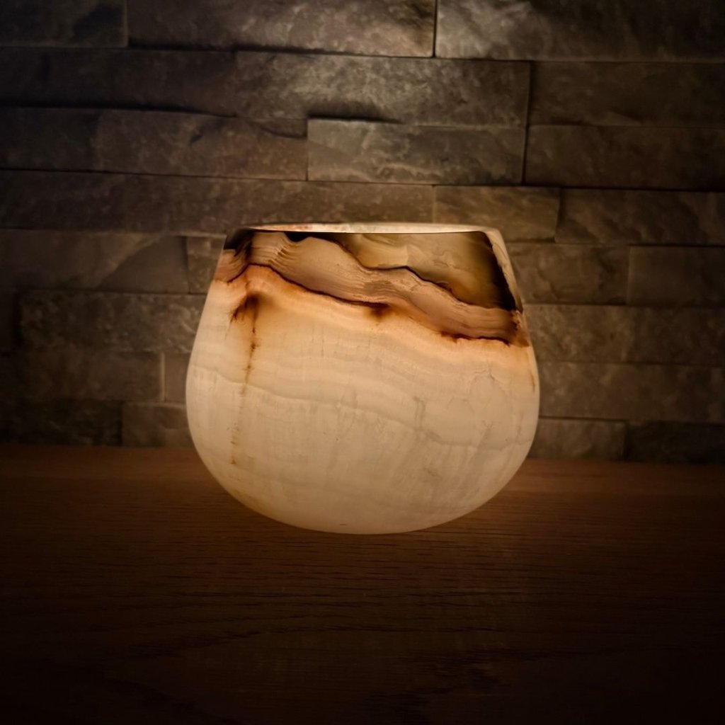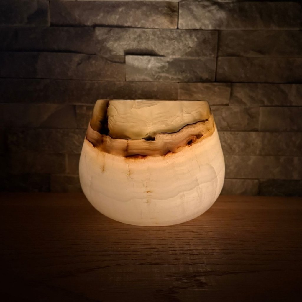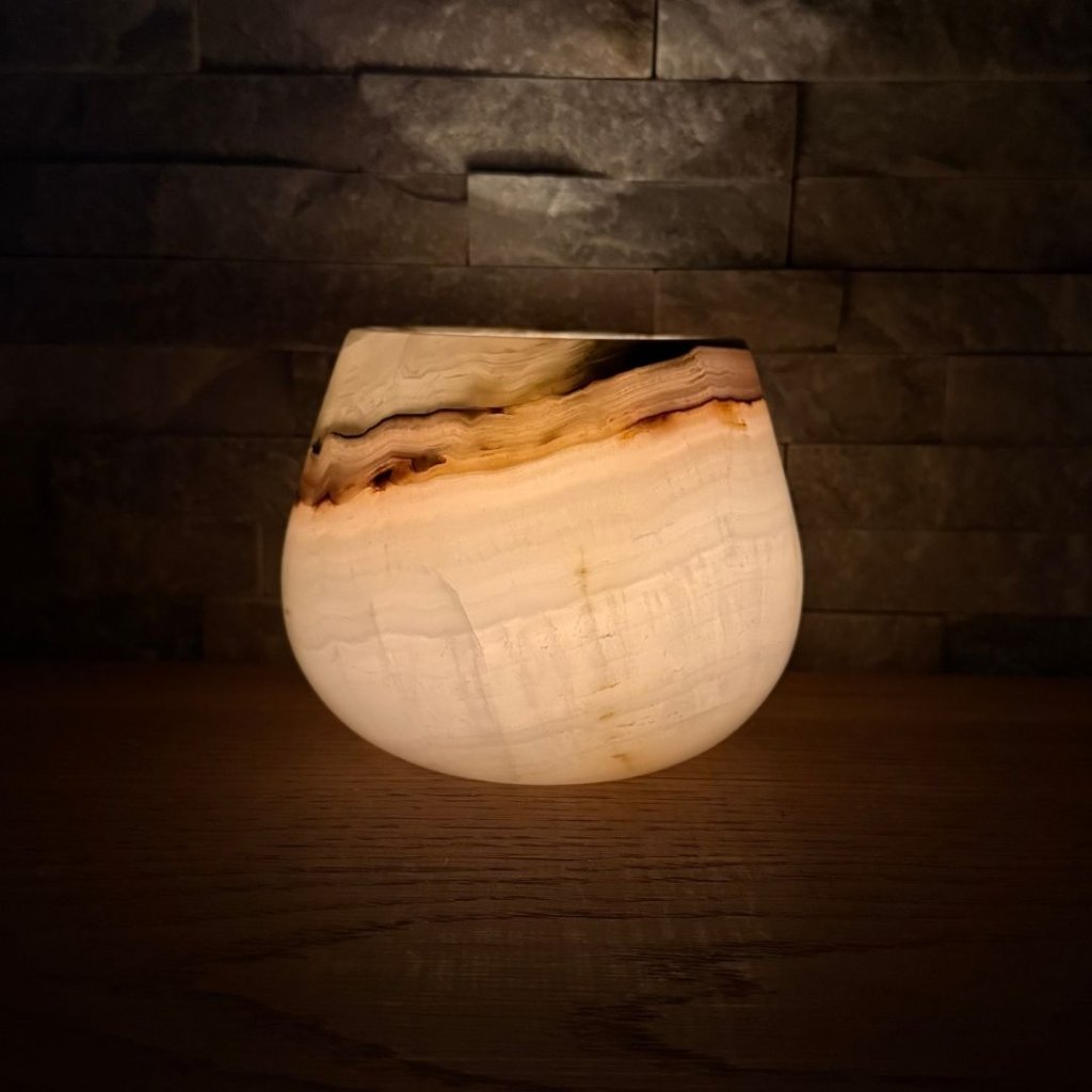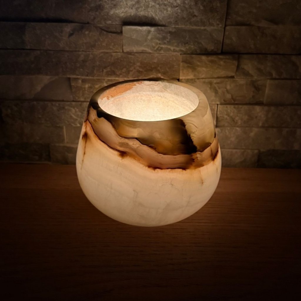 Svícen je vyroben z přírodního aragonitu, známého také jako pákistánský onyx. Tento kámen vyniká pevností, jemným leskem a přirozenou kresbou, která vznikala po tisíce let. Kupujete přesně ten svícen, který vidíte na fotografiích, žádný náhodný výběr, ale konkrétní originální kus.