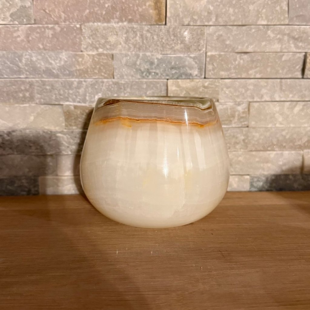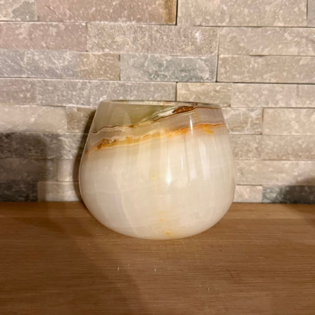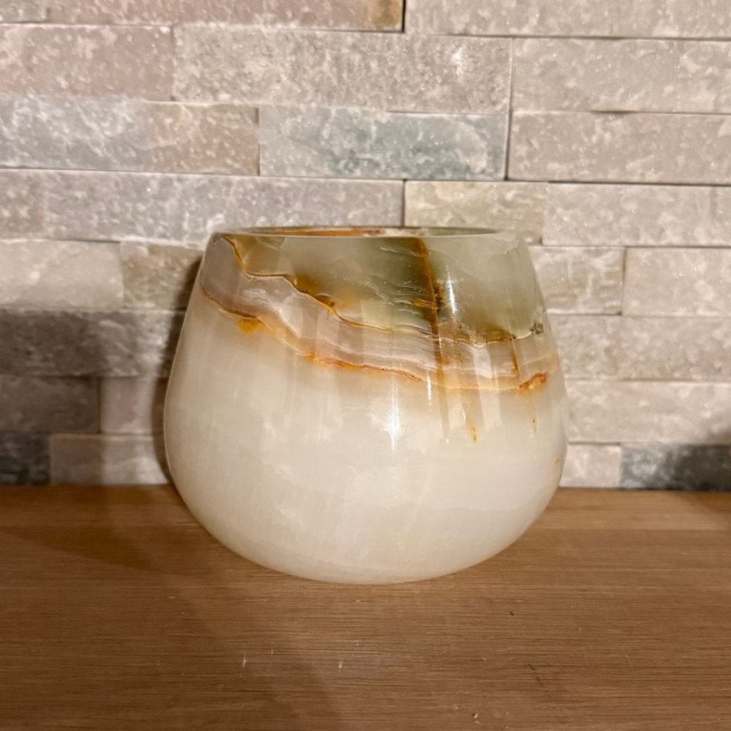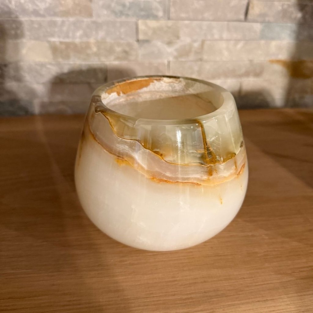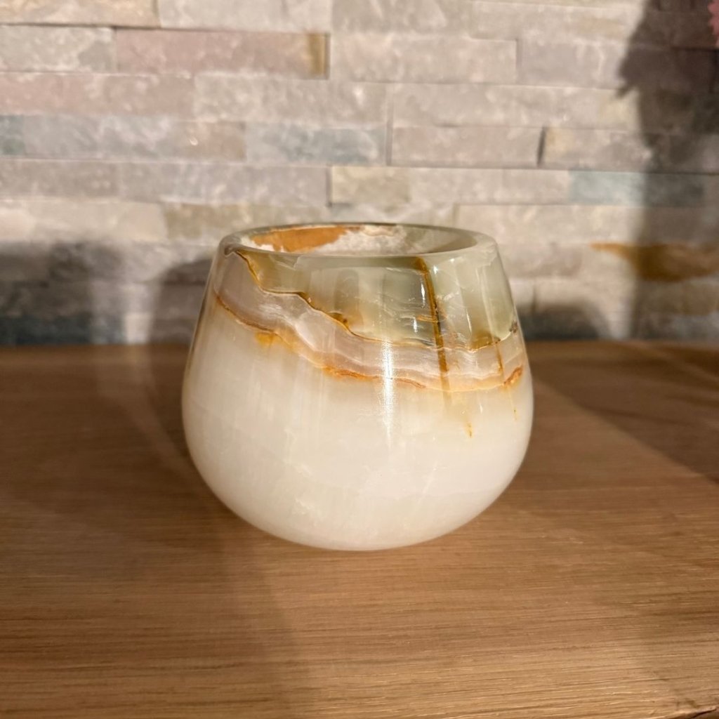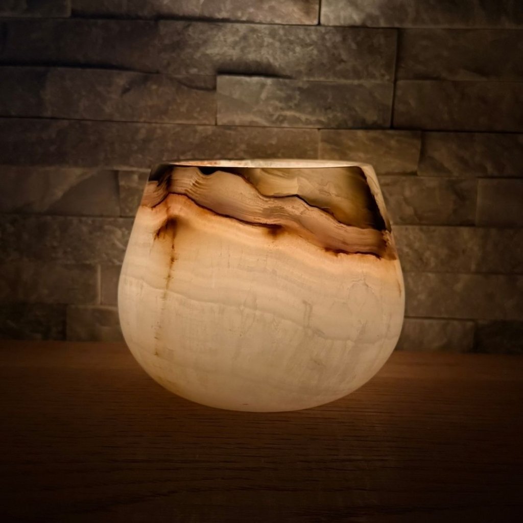 Svícen je vyroben z přírodního aragonitu, známého také jako pákistánský onyx. Tento kámen vyniká pevností, jemným leskem a přirozenou kresbou, která vznikala po tisíce let. Kupujete přesně ten svícen, který vidíte na fotografiích, žádný náhodný výběr, ale konkrétní originální kus.