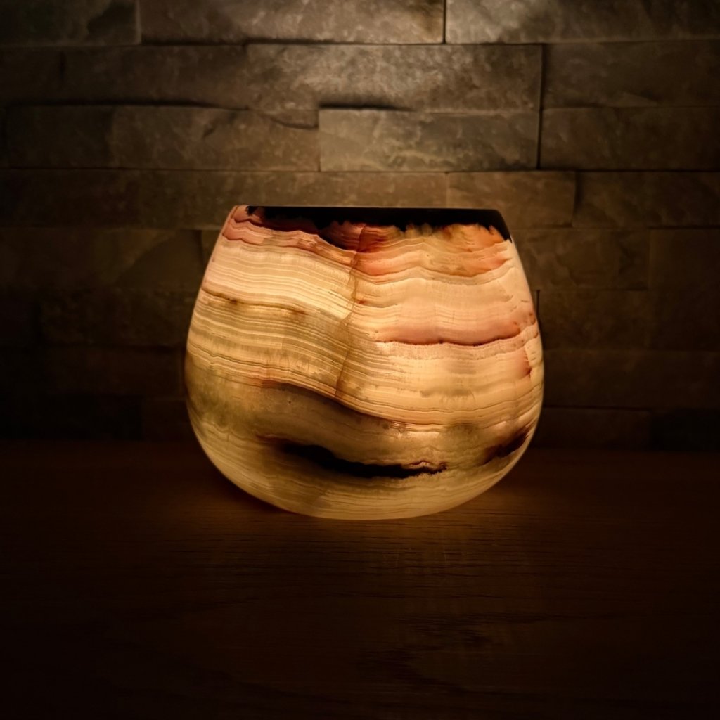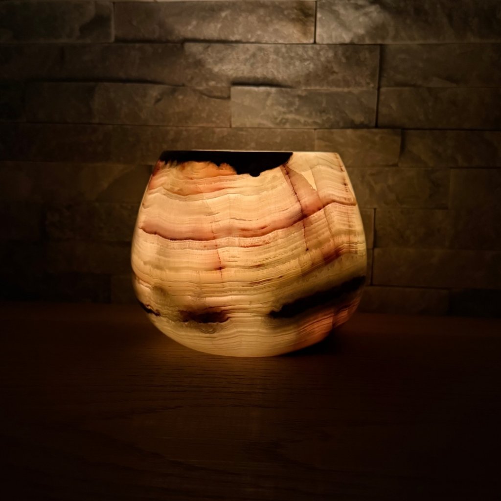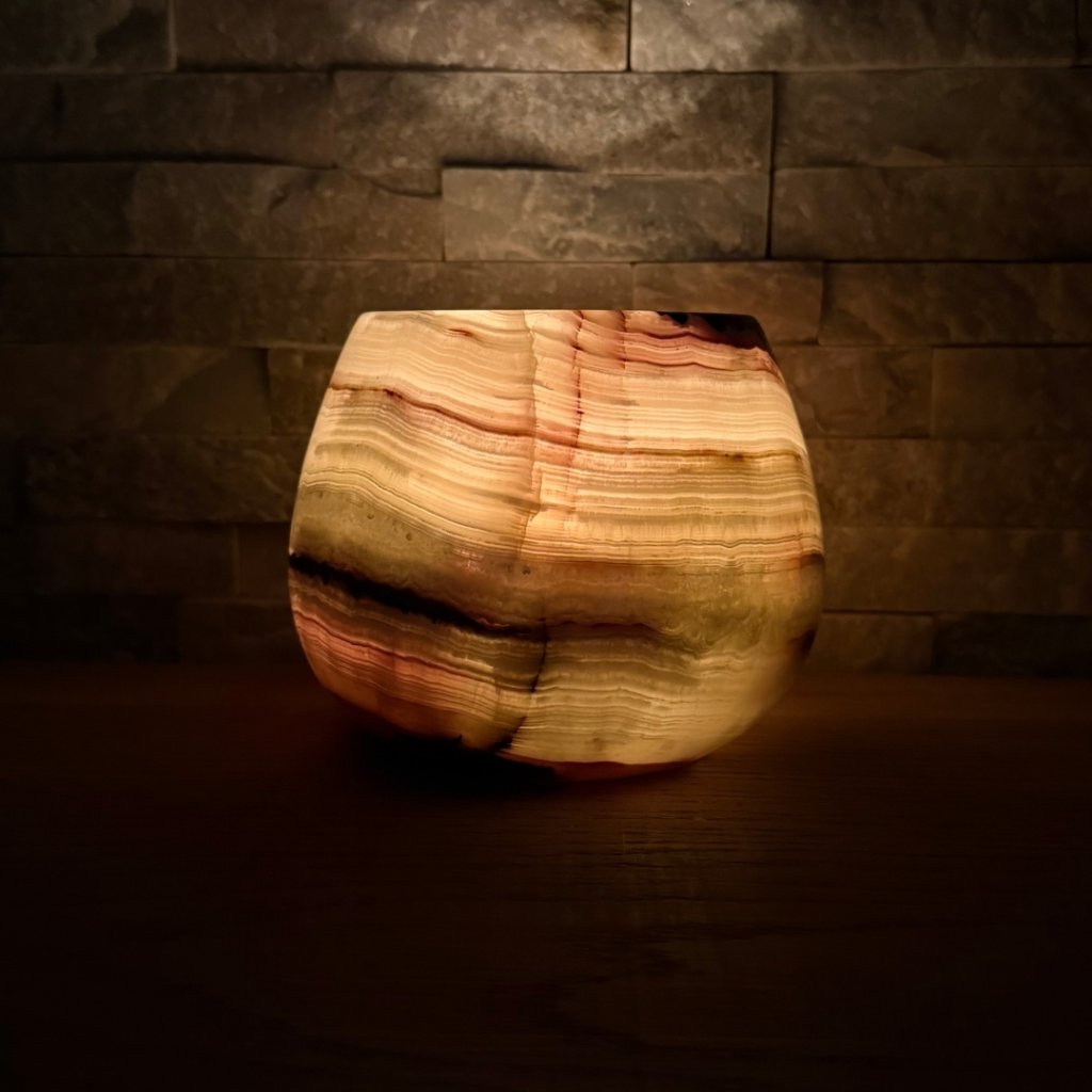 Svícen je vyroben z přírodního aragonitu, známého také jako pákistánský onyx. Tento kámen vyniká pevností, jemným leskem a přirozenou kresbou, která vznikala po tisíce let. Kupujete přesně ten svícen, který vidíte na fotografiích, žádný náhodný výběr, ale konkrétní originální kus.