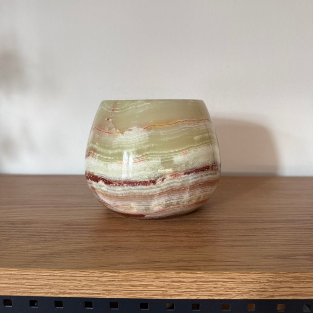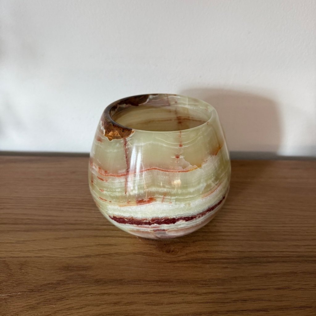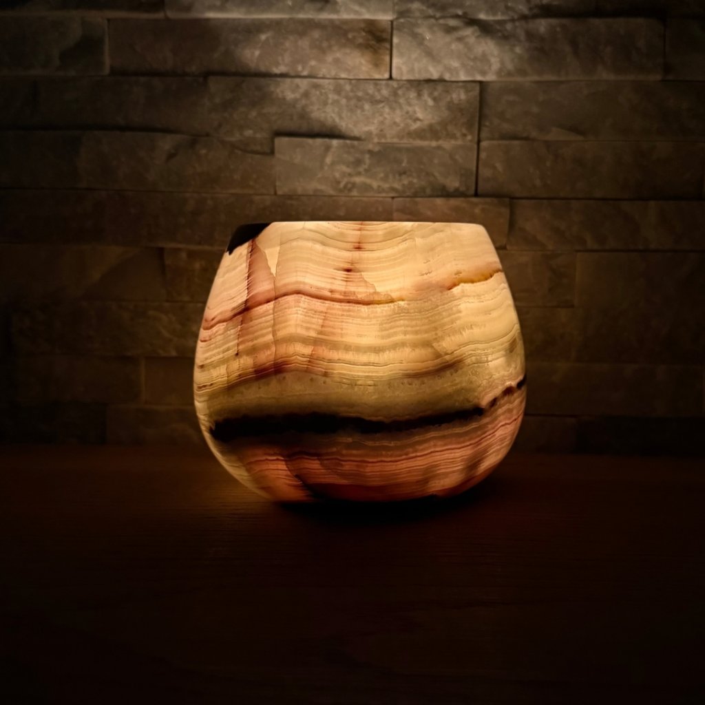 Svícen je vyroben z přírodního aragonitu, známého také jako pákistánský onyx. Tento kámen vyniká pevností, jemným leskem a přirozenou kresbou, která vznikala po tisíce let. Kupujete přesně ten svícen, který vidíte na fotografiích, žádný náhodný výběr, ale konkrétní originální kus.