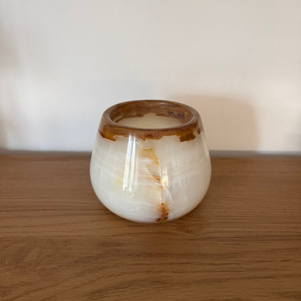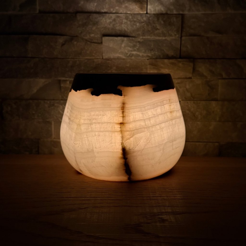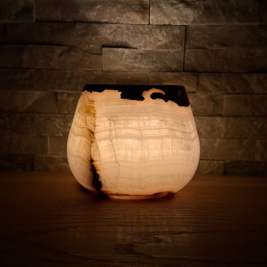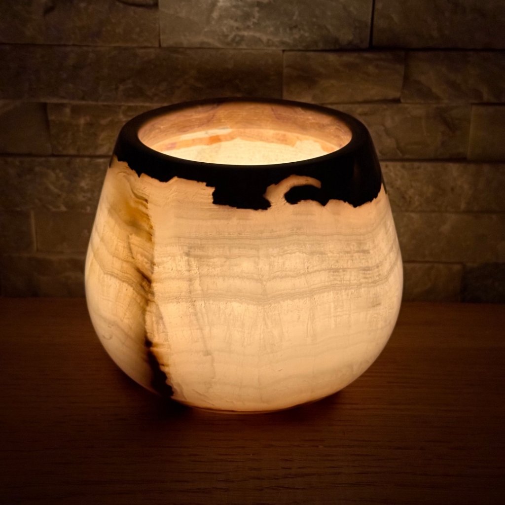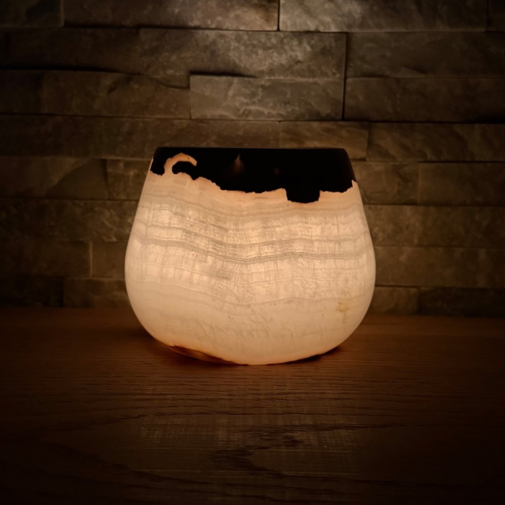 Svícen je vyroben z přírodního aragonitu, známého také jako pákistánský onyx. Tento kámen vyniká pevností, jemným leskem a přirozenou kresbou, která vznikala po tisíce let. Kupujete přesně ten svícen, který vidíte na fotografiích, žádný náhodný výběr, ale konkrétní originální kus.