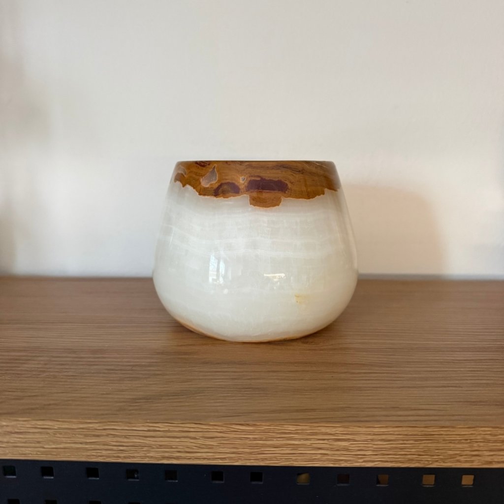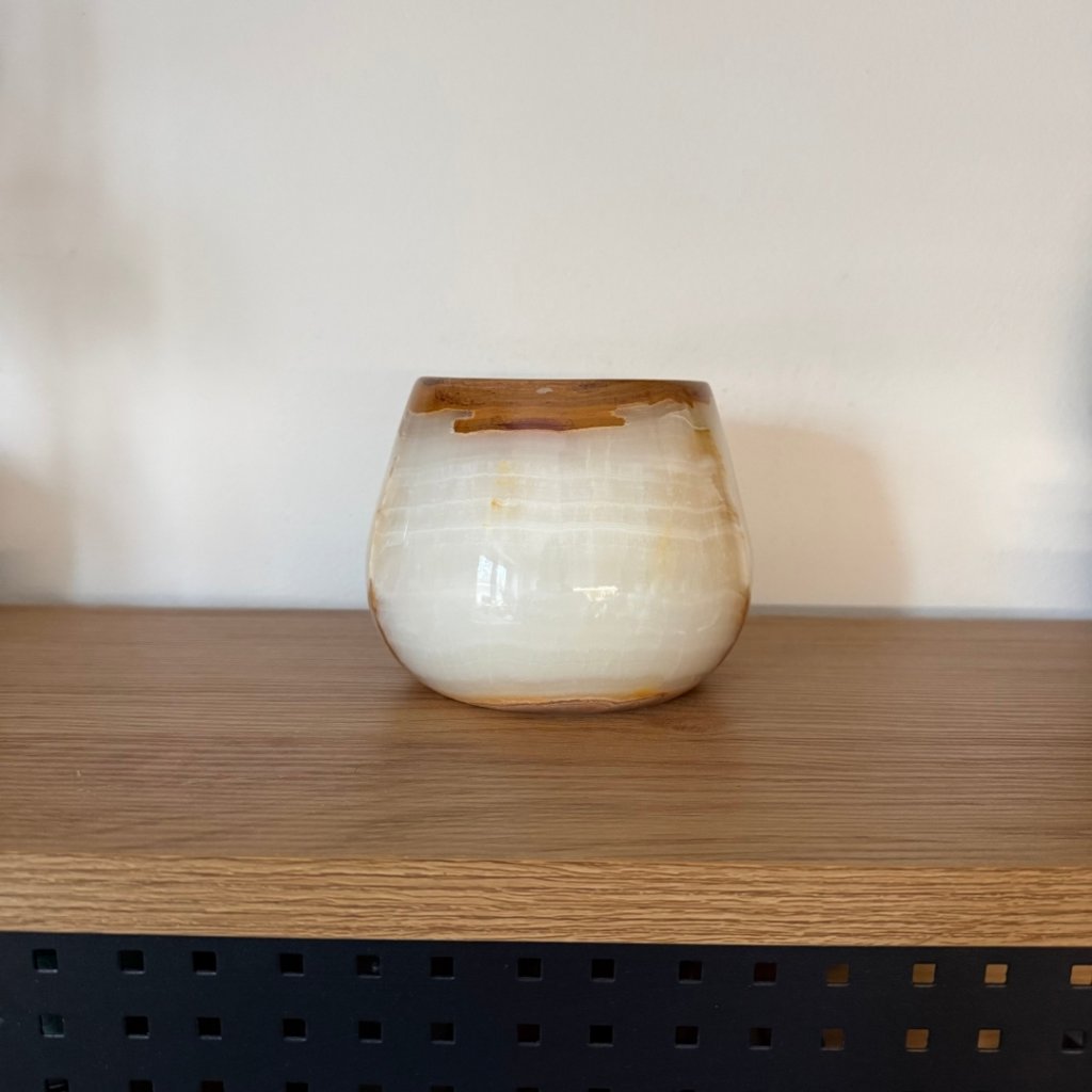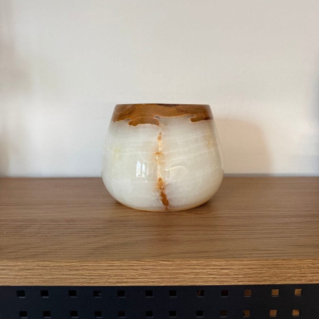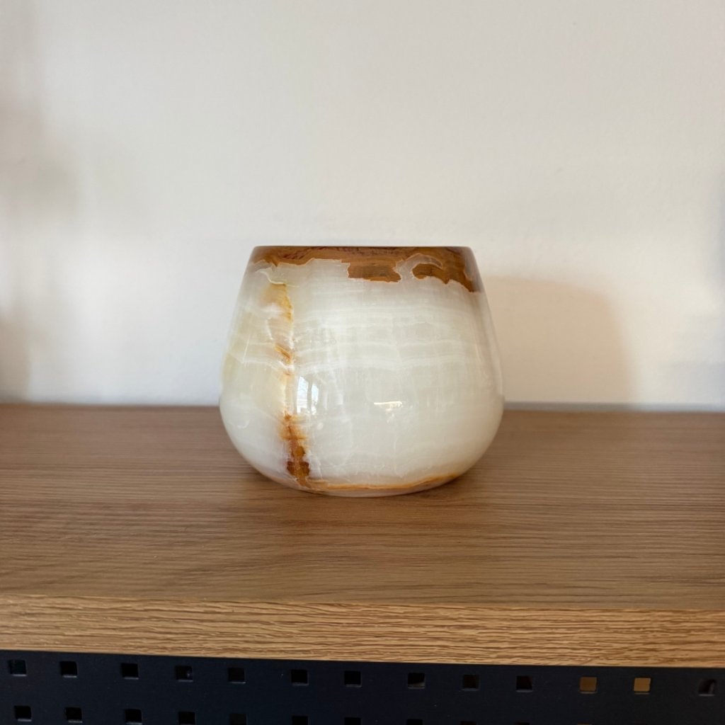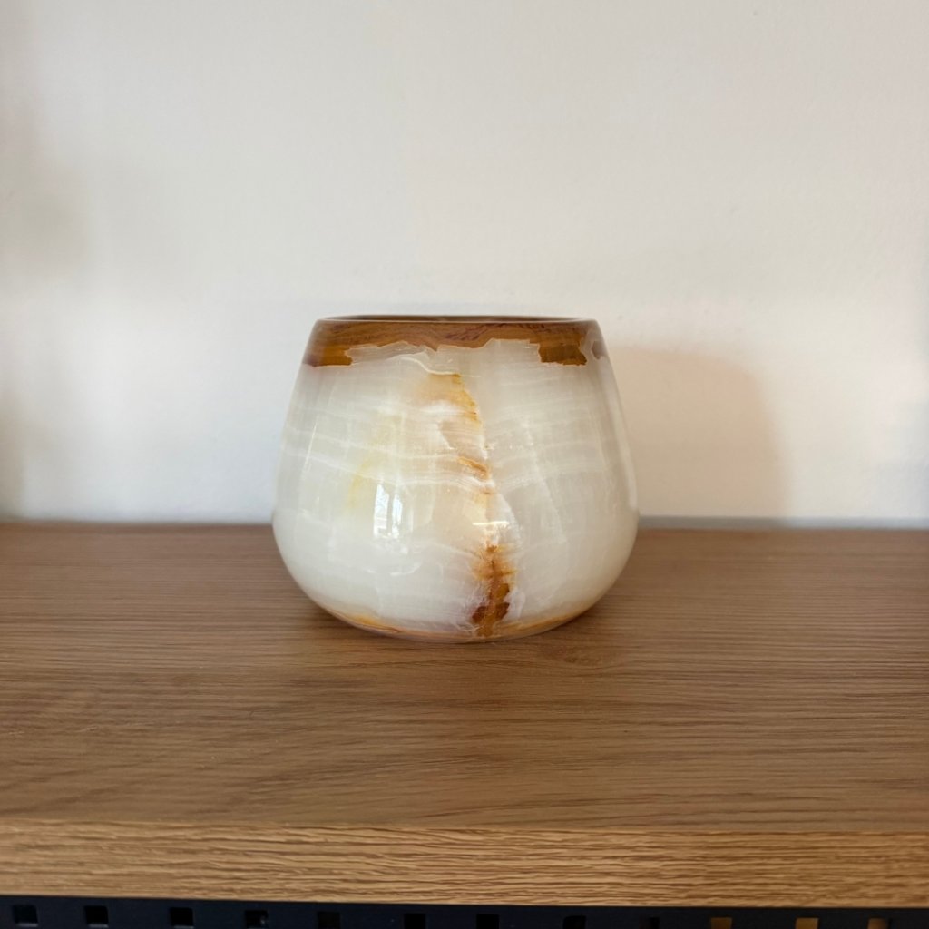 Svícen je vyroben z přírodního aragonitu, známého také jako pákistánský onyx. Tento kámen vyniká pevností, jemným leskem a přirozenou kresbou, která vznikala po tisíce let. Kupujete přesně ten svícen, který vidíte na fotografiích, žádný náhodný výběr, ale konkrétní originální kus.