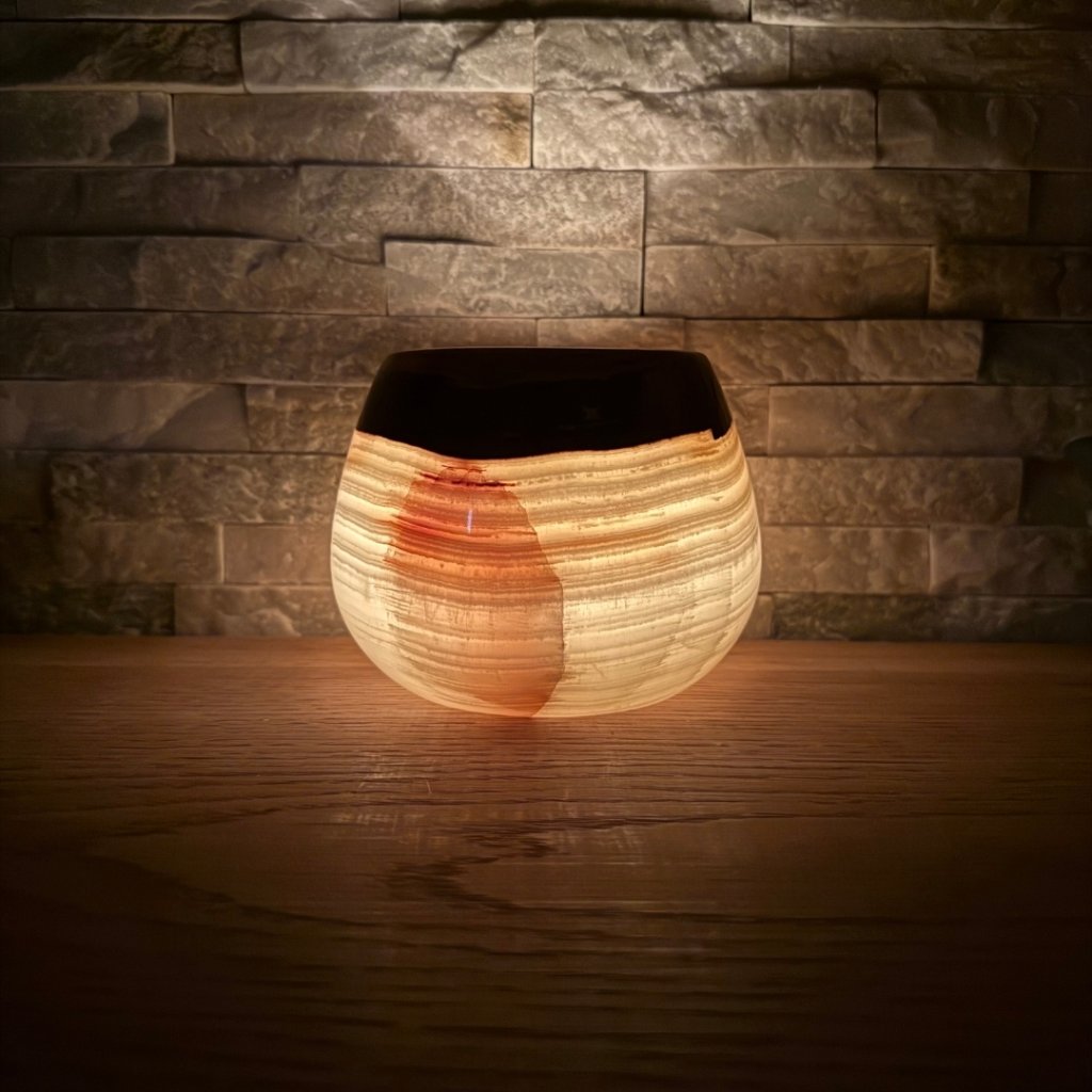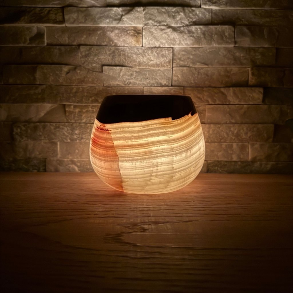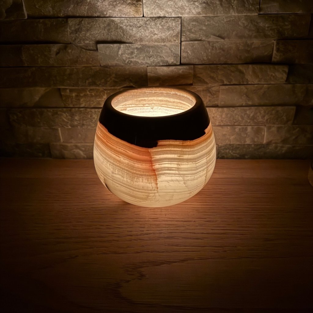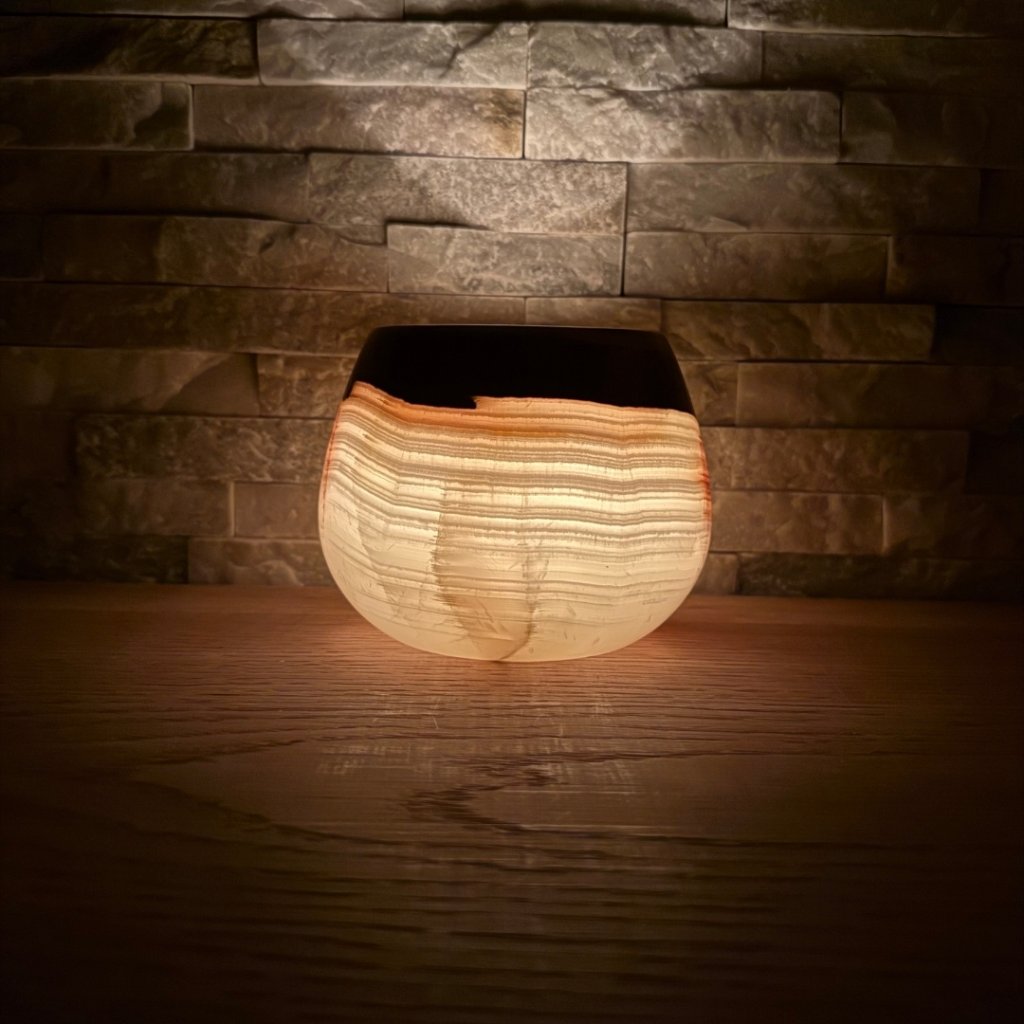 Svícen je vyroben z přírodního aragonitu, známého také jako pákistánský onyx. Tento kámen vyniká pevností, jemným leskem a přirozenou kresbou, která vznikala po tisíce let. Kupujete přesně ten svícen, který vidíte na fotografiích, žádný náhodný výběr, ale konkrétní originální kus.