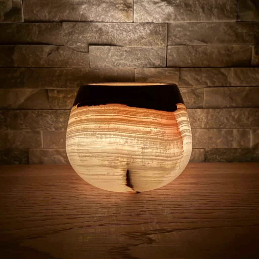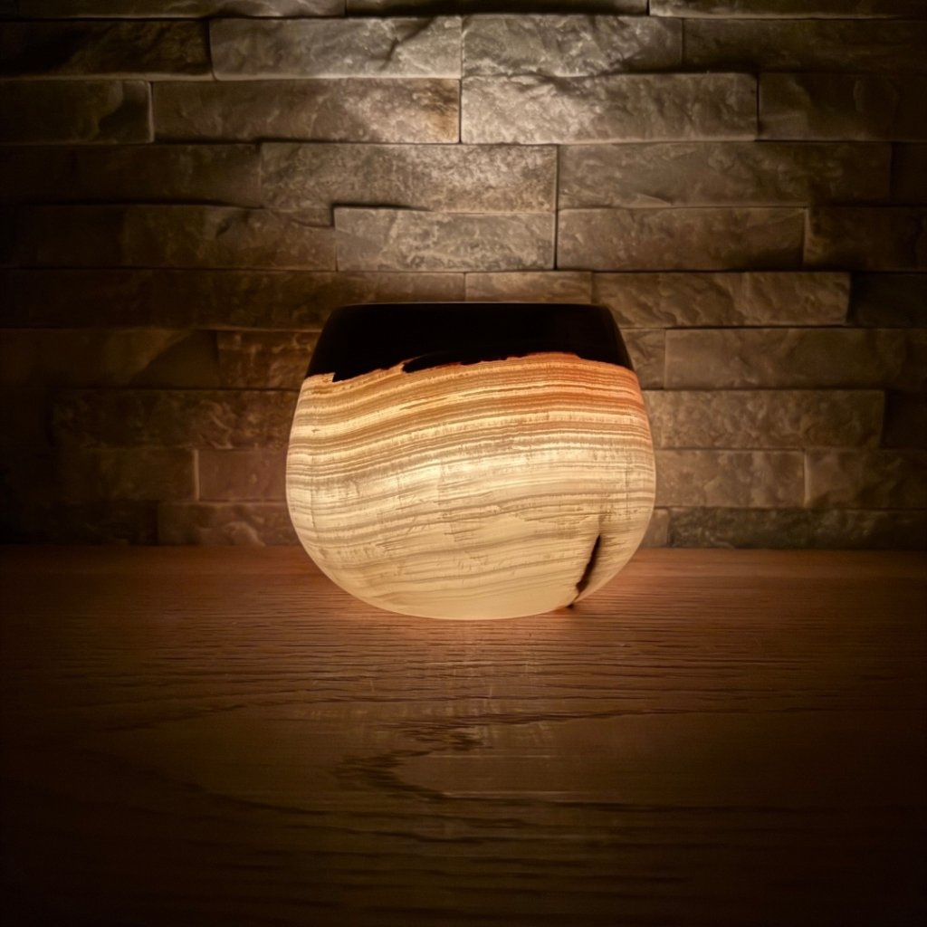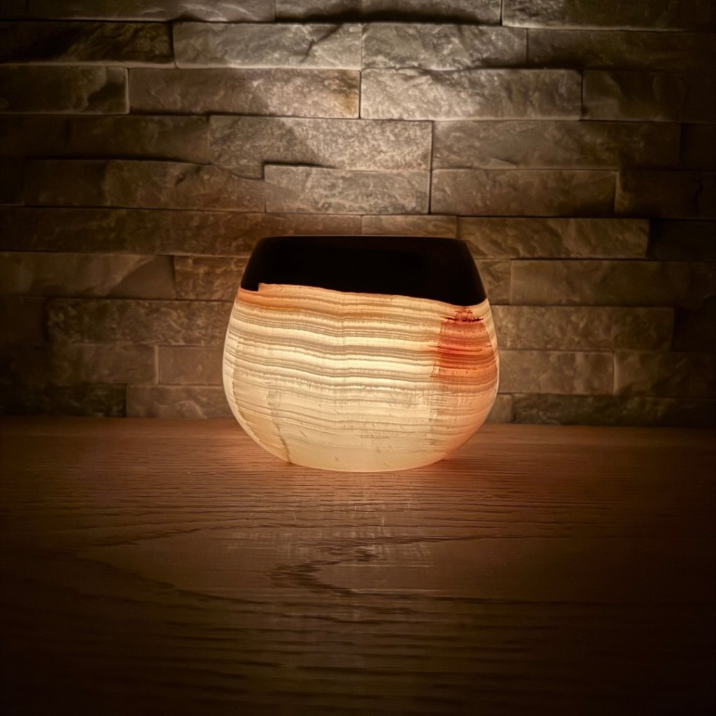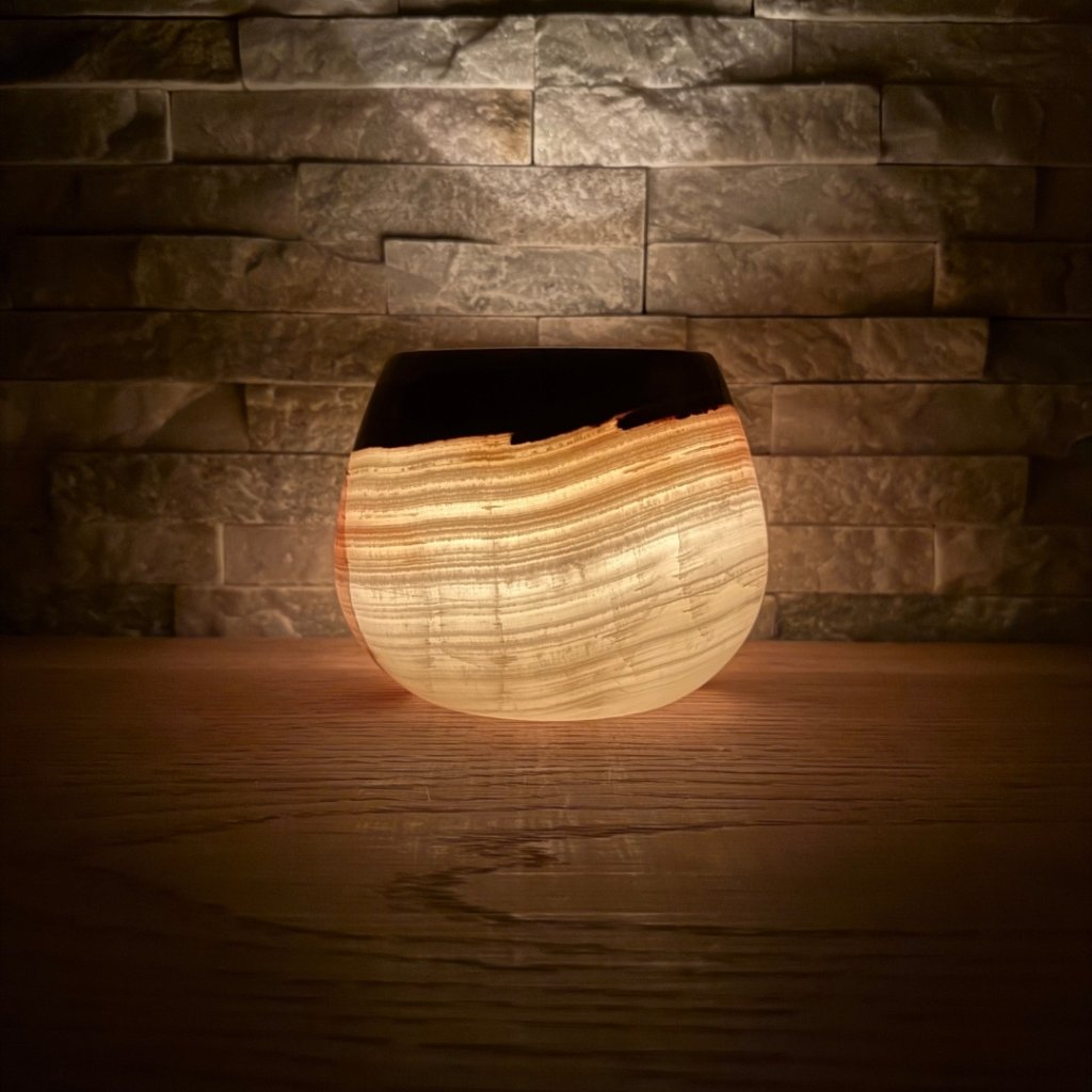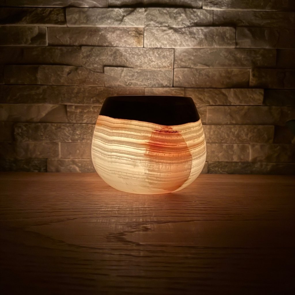 Svícen je vyroben z přírodního aragonitu, známého také jako pákistánský onyx. Tento kámen vyniká pevností, jemným leskem a přirozenou kresbou, která vznikala po tisíce let. Kupujete přesně ten svícen, který vidíte na fotografiích, žádný náhodný výběr, ale konkrétní originální kus.