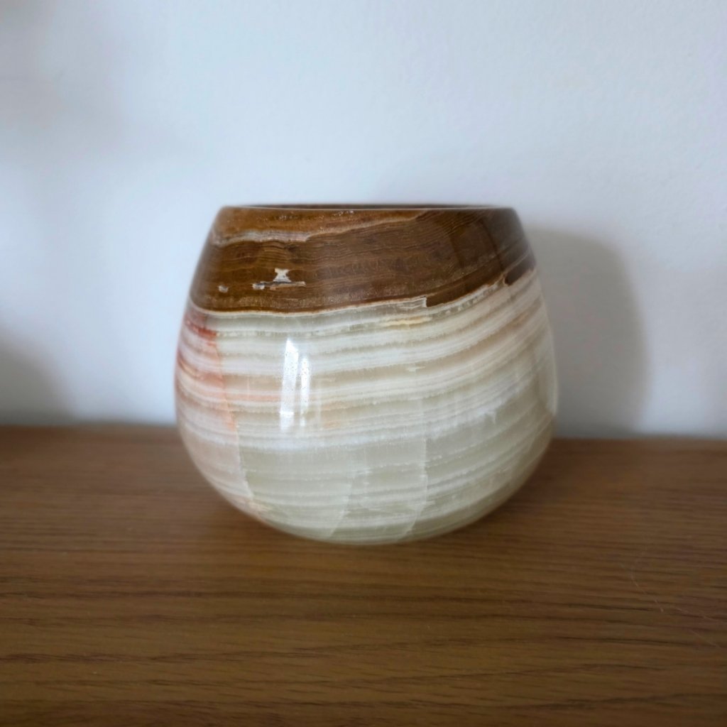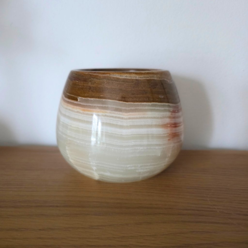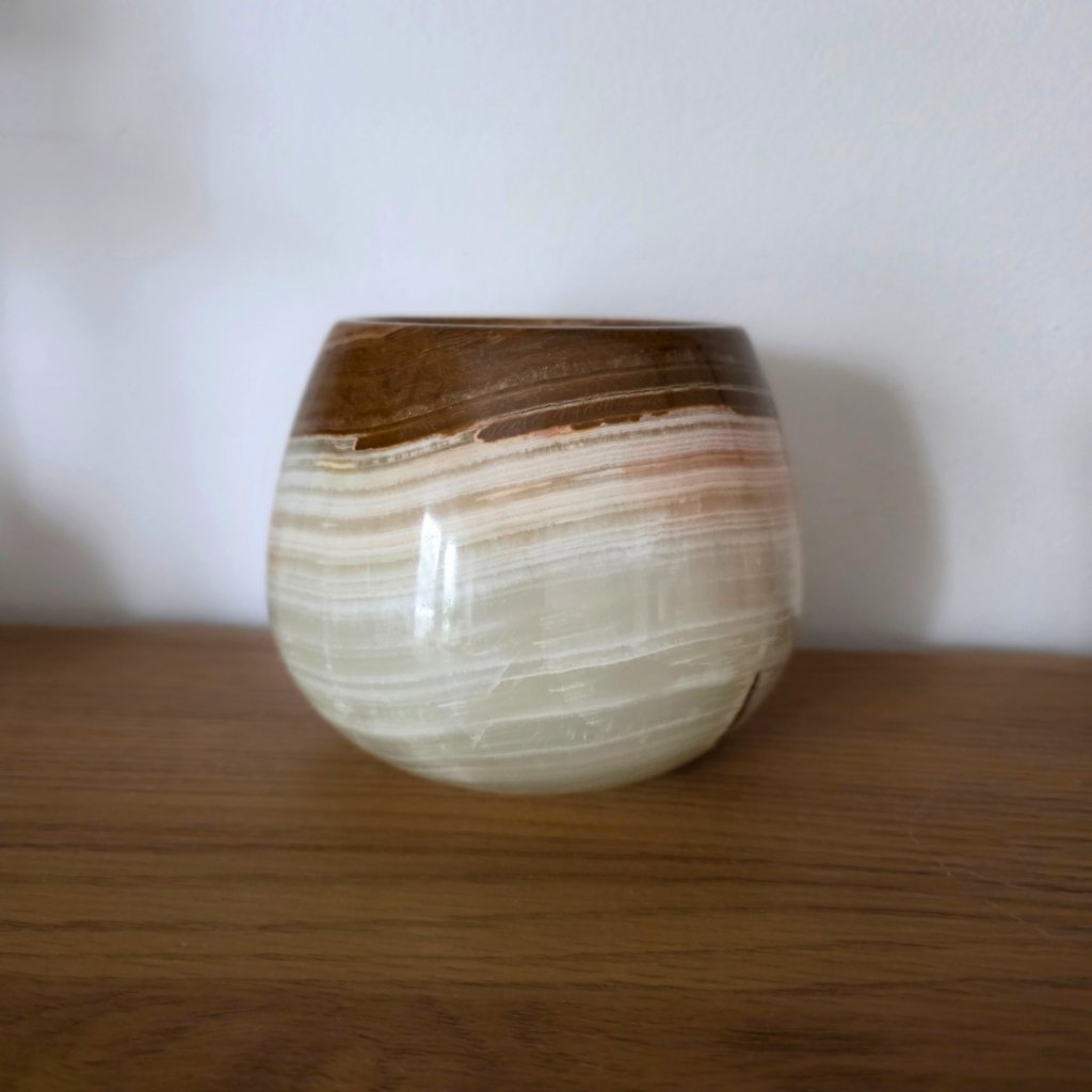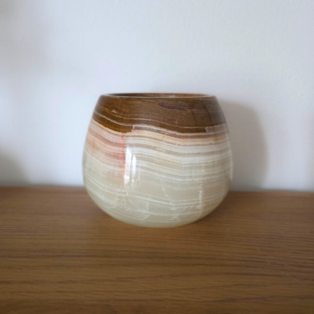 Svícen je vyroben z přírodního aragonitu, známého také jako pákistánský onyx. Tento kámen vyniká pevností, jemným leskem a přirozenou kresbou, která vznikala po tisíce let. Kupujete přesně ten svícen, který vidíte na fotografiích, žádný náhodný výběr, ale konkrétní originální kus.