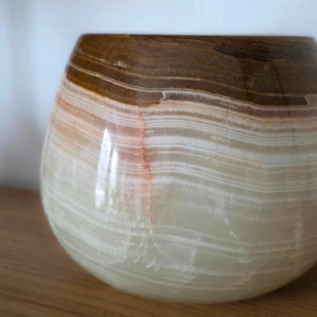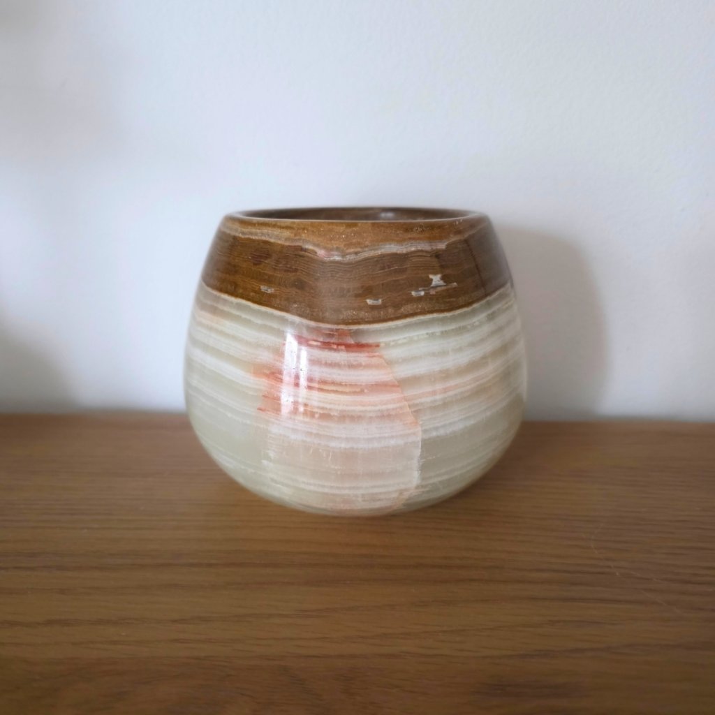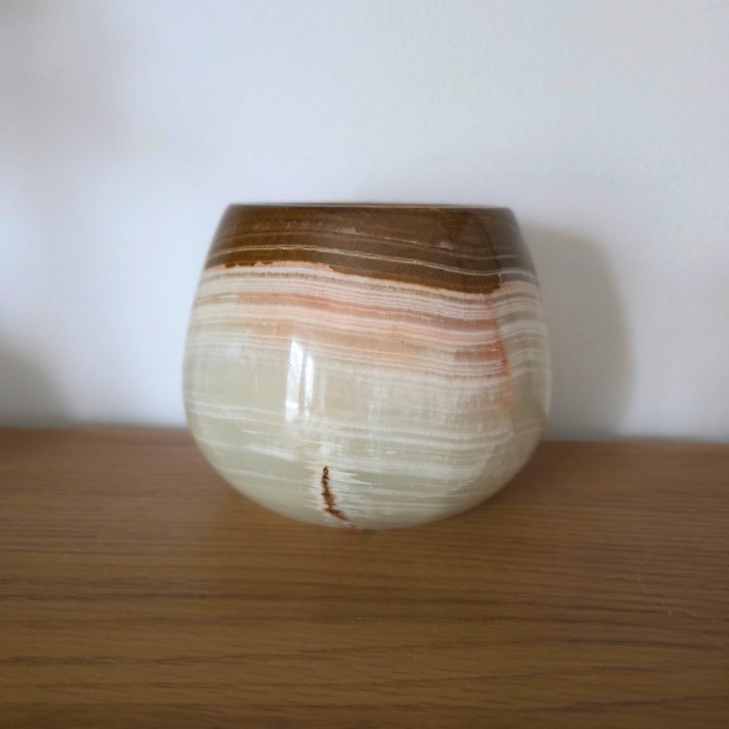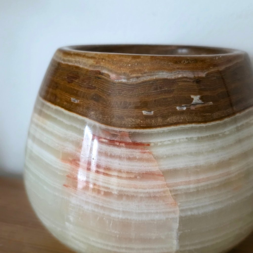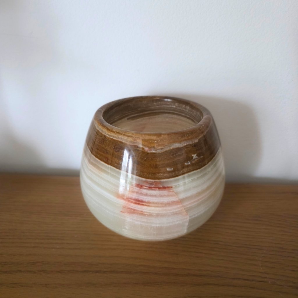 Svícen je vyroben z přírodního aragonitu, známého také jako pákistánský onyx. Tento kámen vyniká pevností, jemným leskem a přirozenou kresbou, která vznikala po tisíce let. Kupujete přesně ten svícen, který vidíte na fotografiích, žádný náhodný výběr, ale konkrétní originální kus.