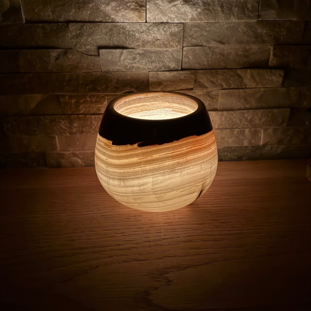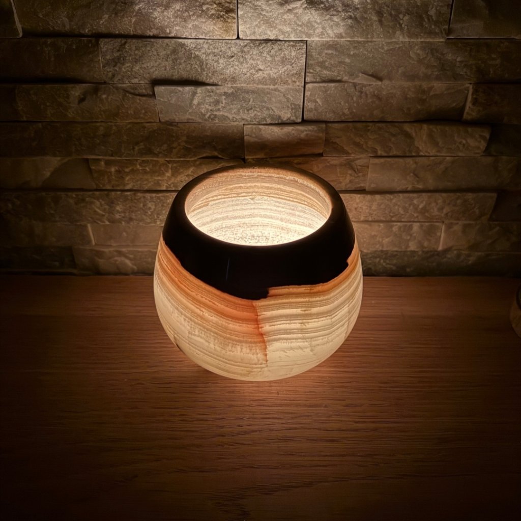 Každý svícen z aragonitu je jedinečný svým vzhledem. Tento konkrétní kus má přesně takovou strukturu, žilkování a barevnost, jakou vidíte na fotkách. Doporučujeme si fotogalerii projít opravdu pečlivě, abyste věděli, jaký svícen si domů vybíráte. Po zapálení čajové svíčky začne světlo jemně prosvítat kamenem a zvýrazní jeho přirozenou kresbu.