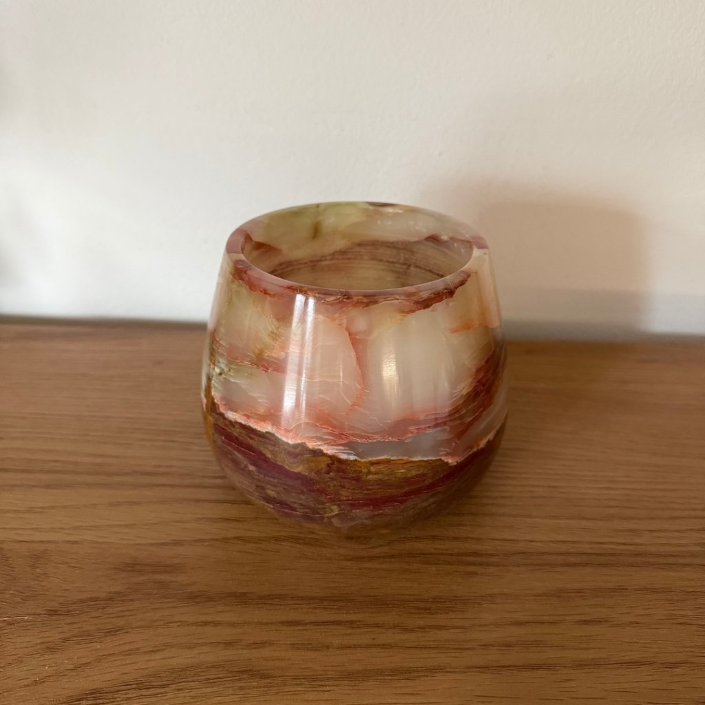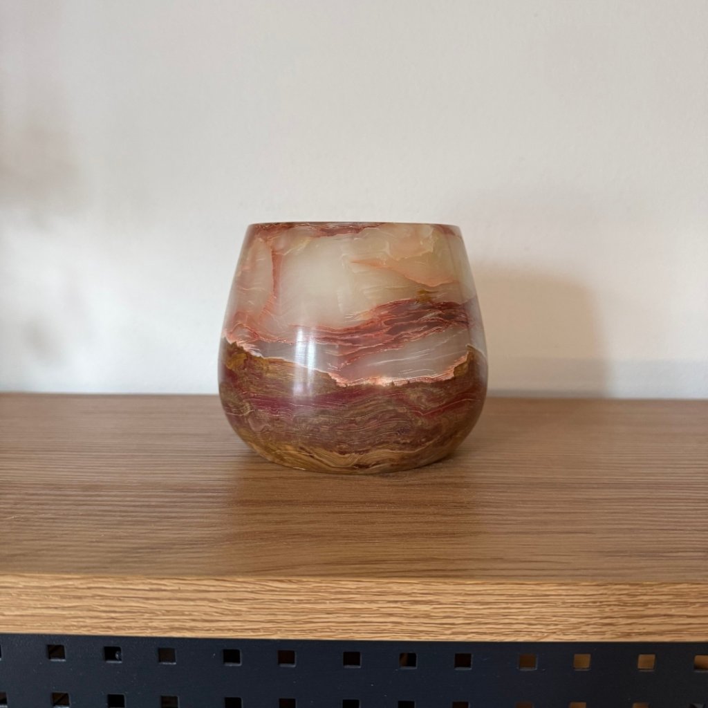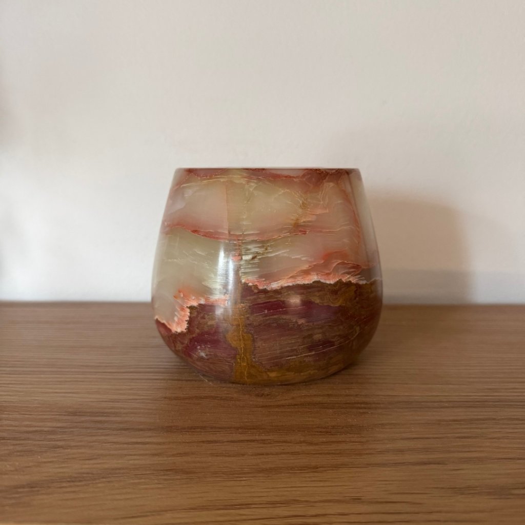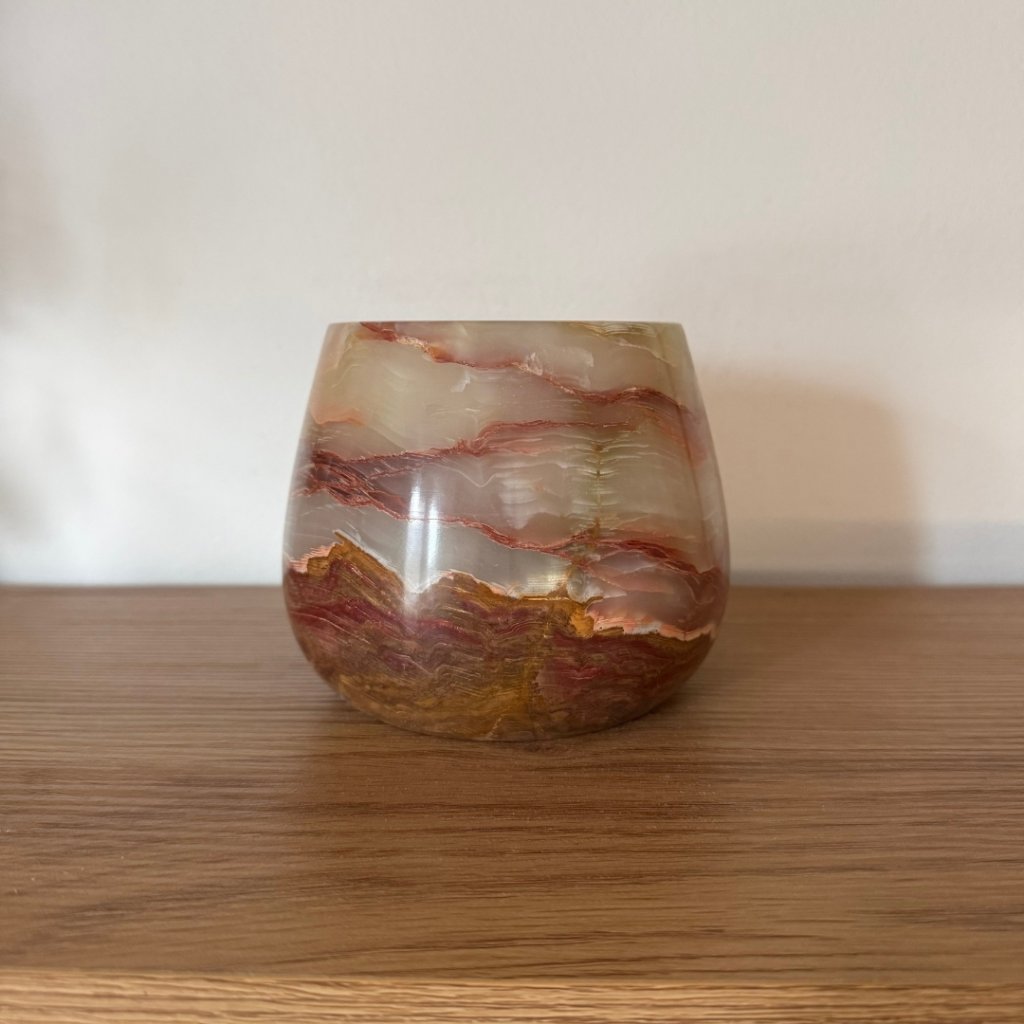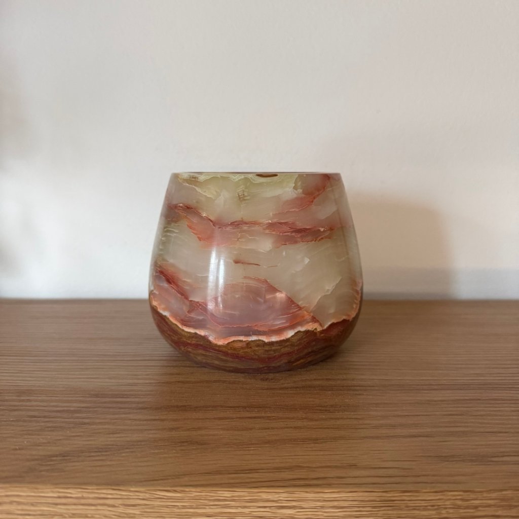 Svícen je vyroben z přírodního aragonitu, známého také jako pákistánský onyx. Tento kámen vyniká pevností, jemným leskem a přirozenou kresbou, která vznikala po tisíce let. Kupujete přesně ten svícen, který vidíte na fotografiích, žádný náhodný výběr, ale konkrétní originální kus.