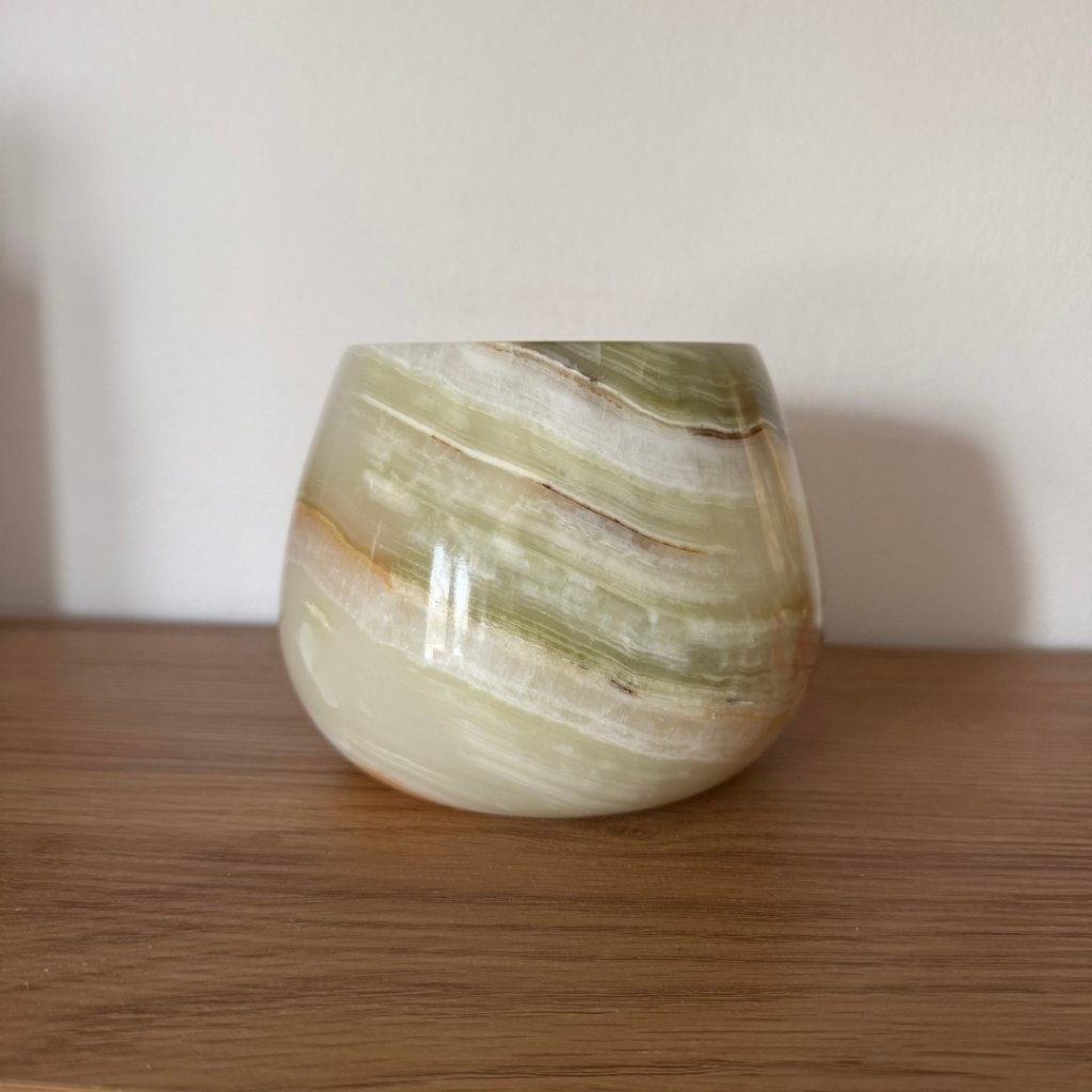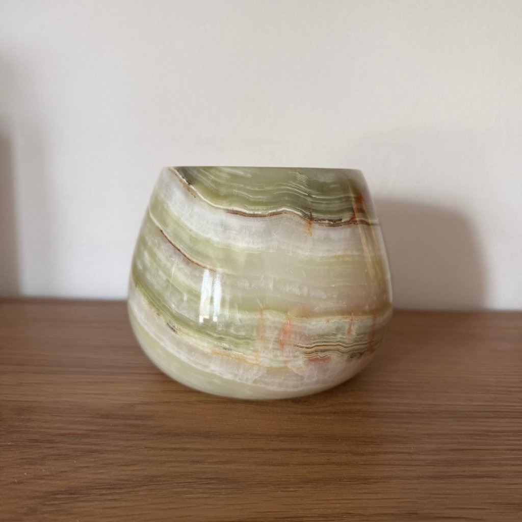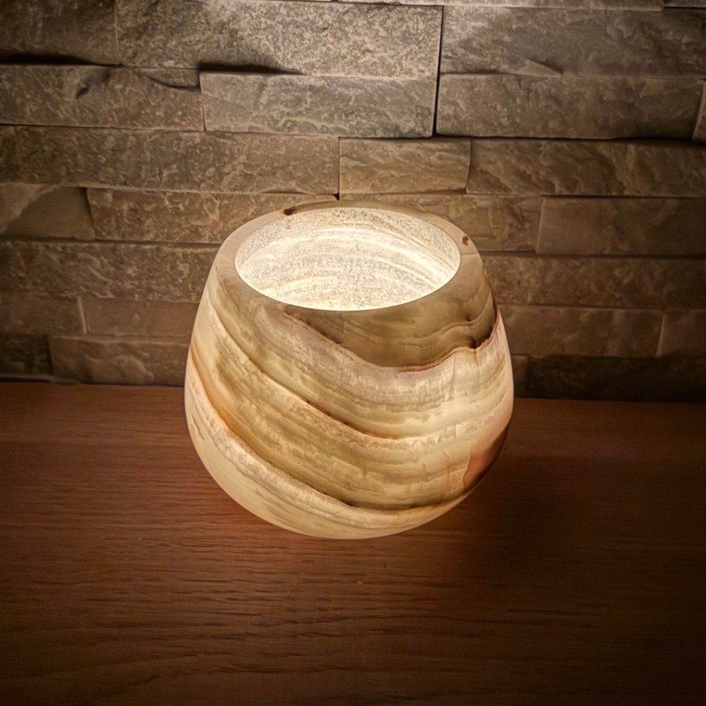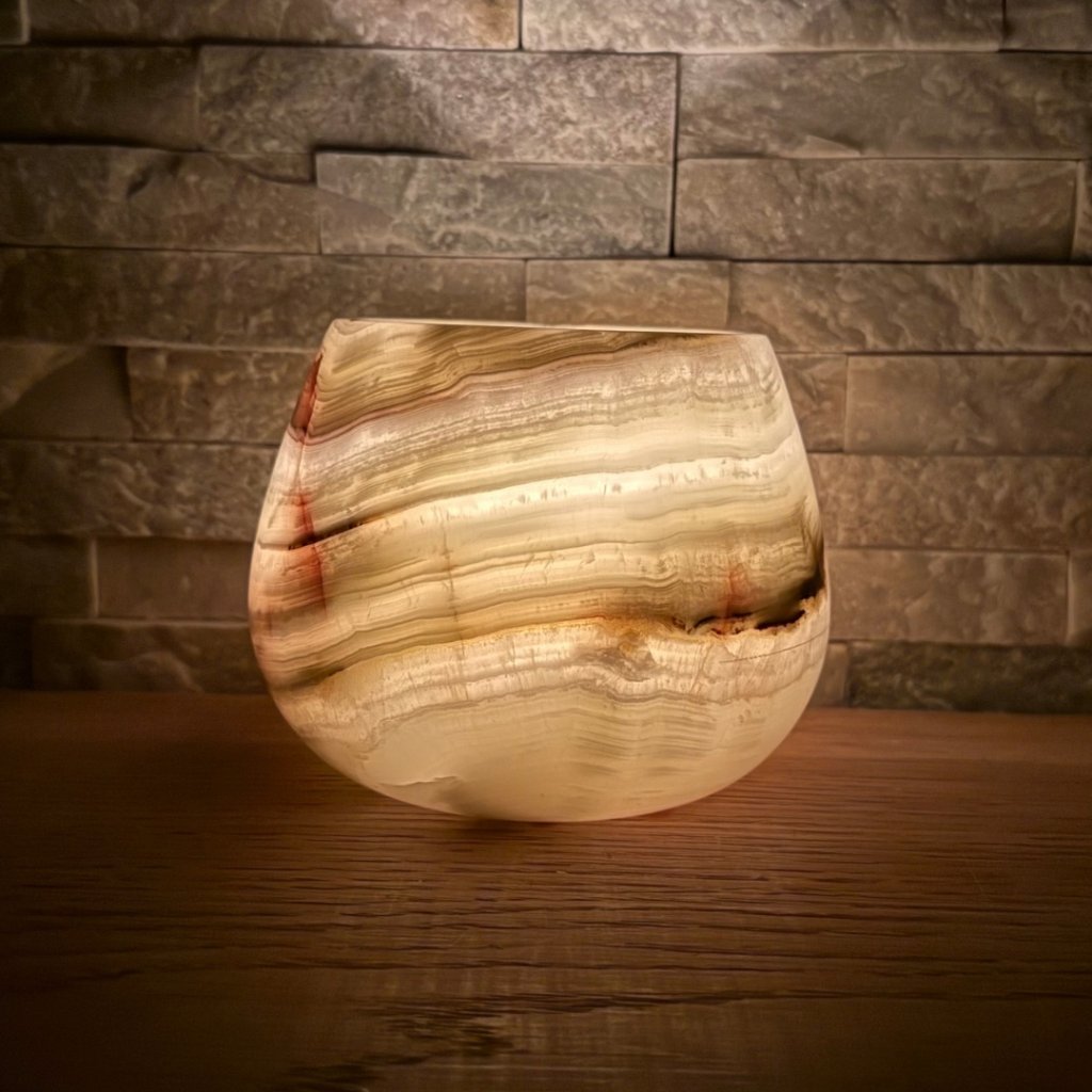 Svícen je vyroben z přírodního aragonitu, známého také jako pákistánský onyx. Tento kámen vyniká pevností, jemným leskem a přirozenou kresbou, která vznikala po tisíce let. Kupujete přesně ten svícen, který vidíte na fotografiích, žádný náhodný výběr, ale konkrétní originální kus.
