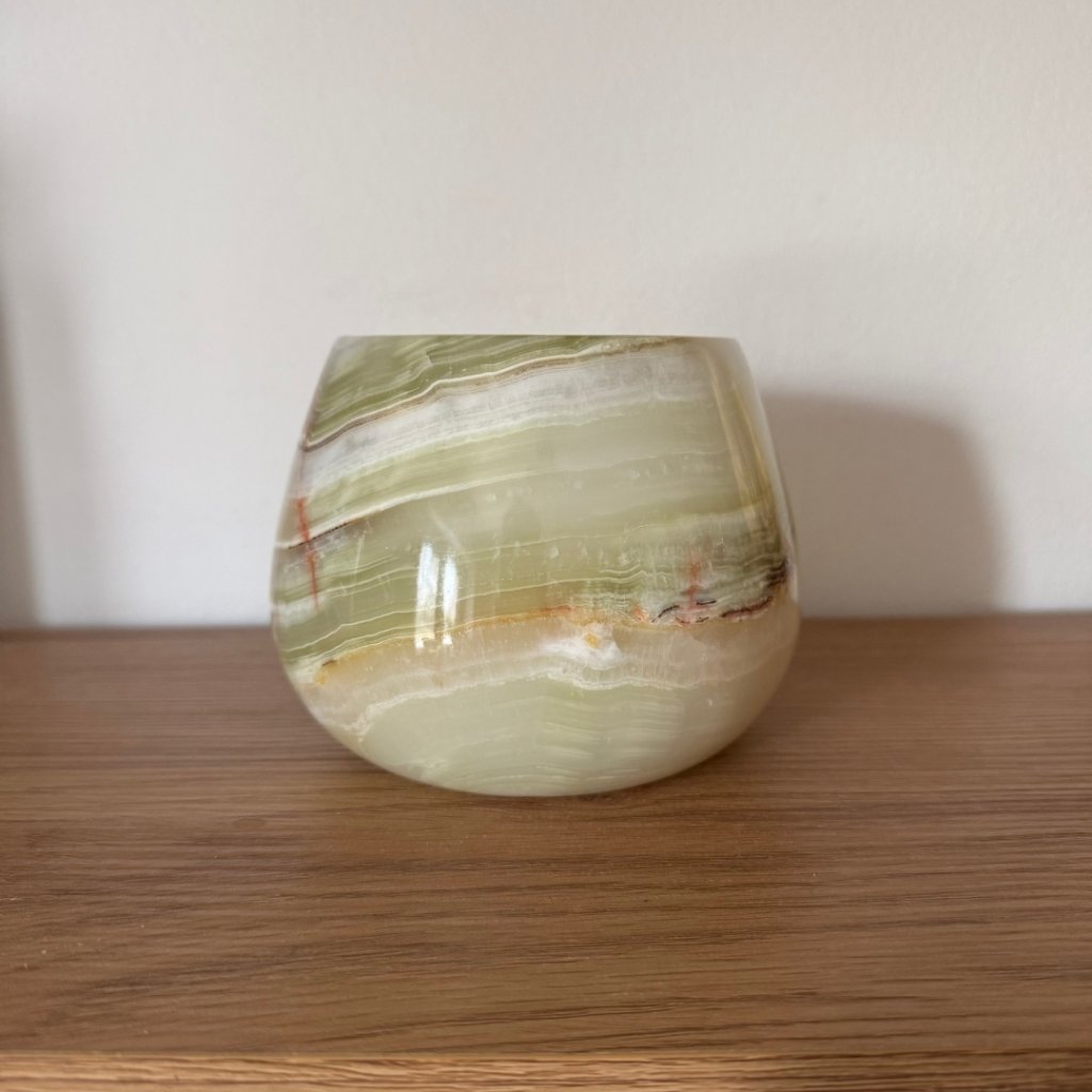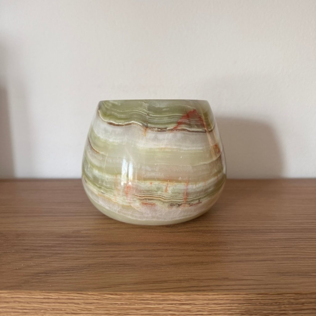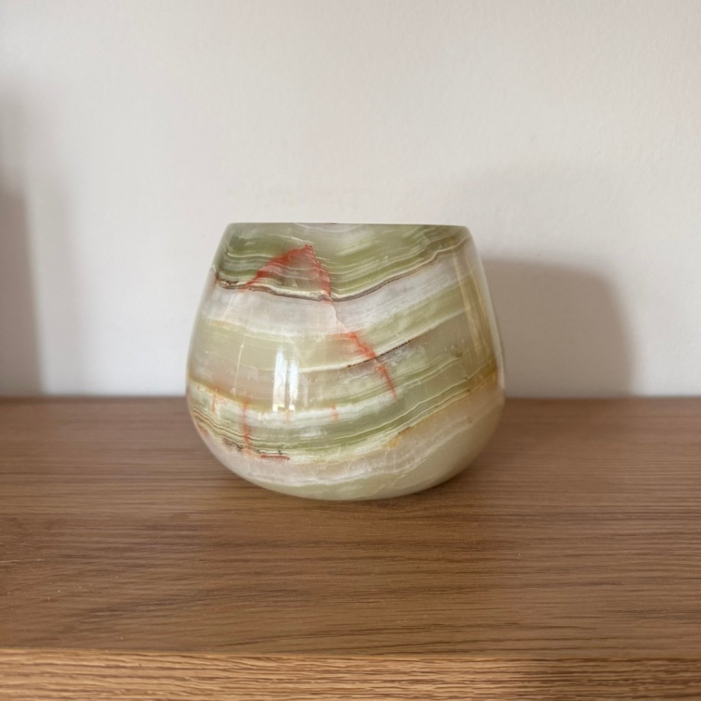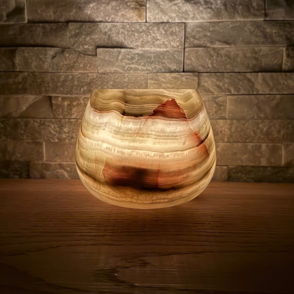 Svícen je vyroben z přírodního aragonitu, známého také jako pákistánský onyx. Tento kámen vyniká pevností, jemným leskem a přirozenou kresbou, která vznikala po tisíce let. Kupujete přesně ten svícen, který vidíte na fotografiích, žádný náhodný výběr, ale konkrétní originální kus.