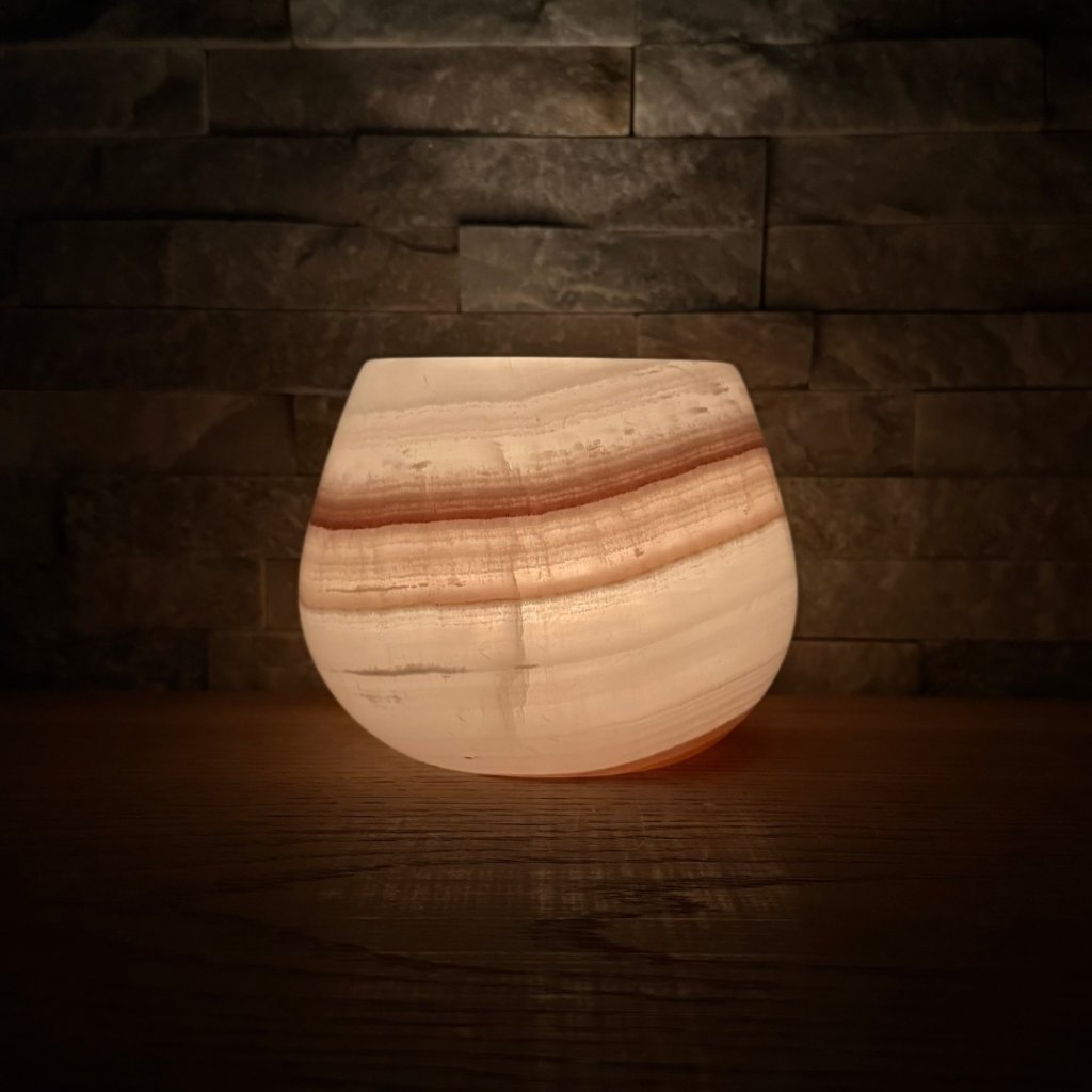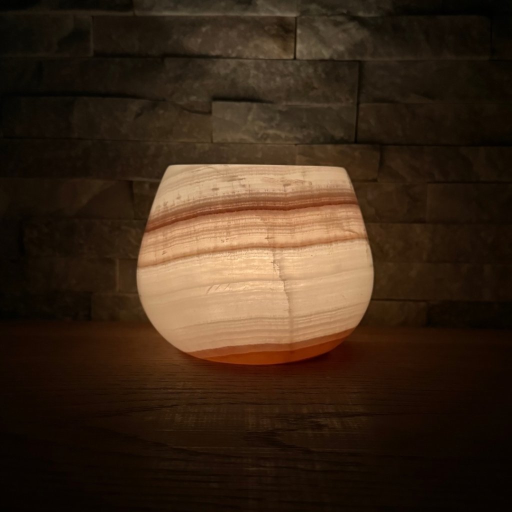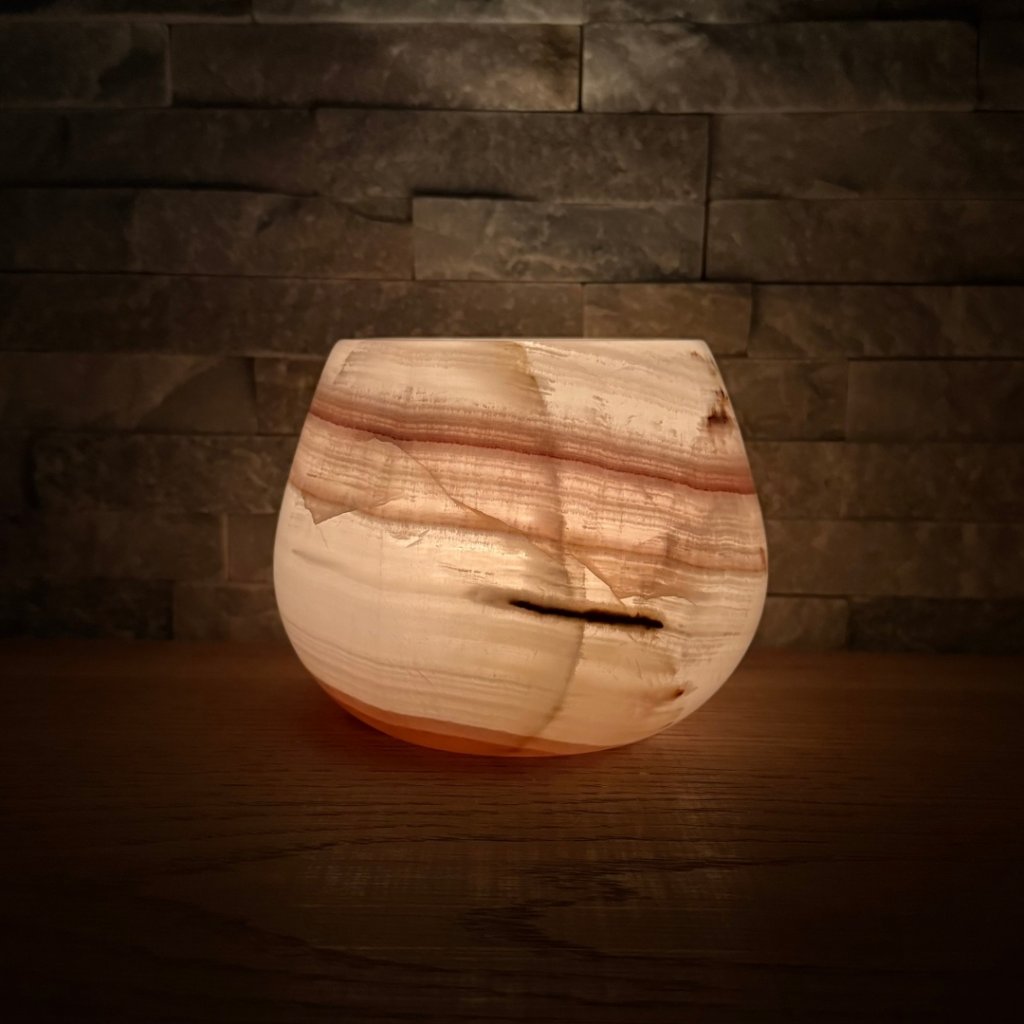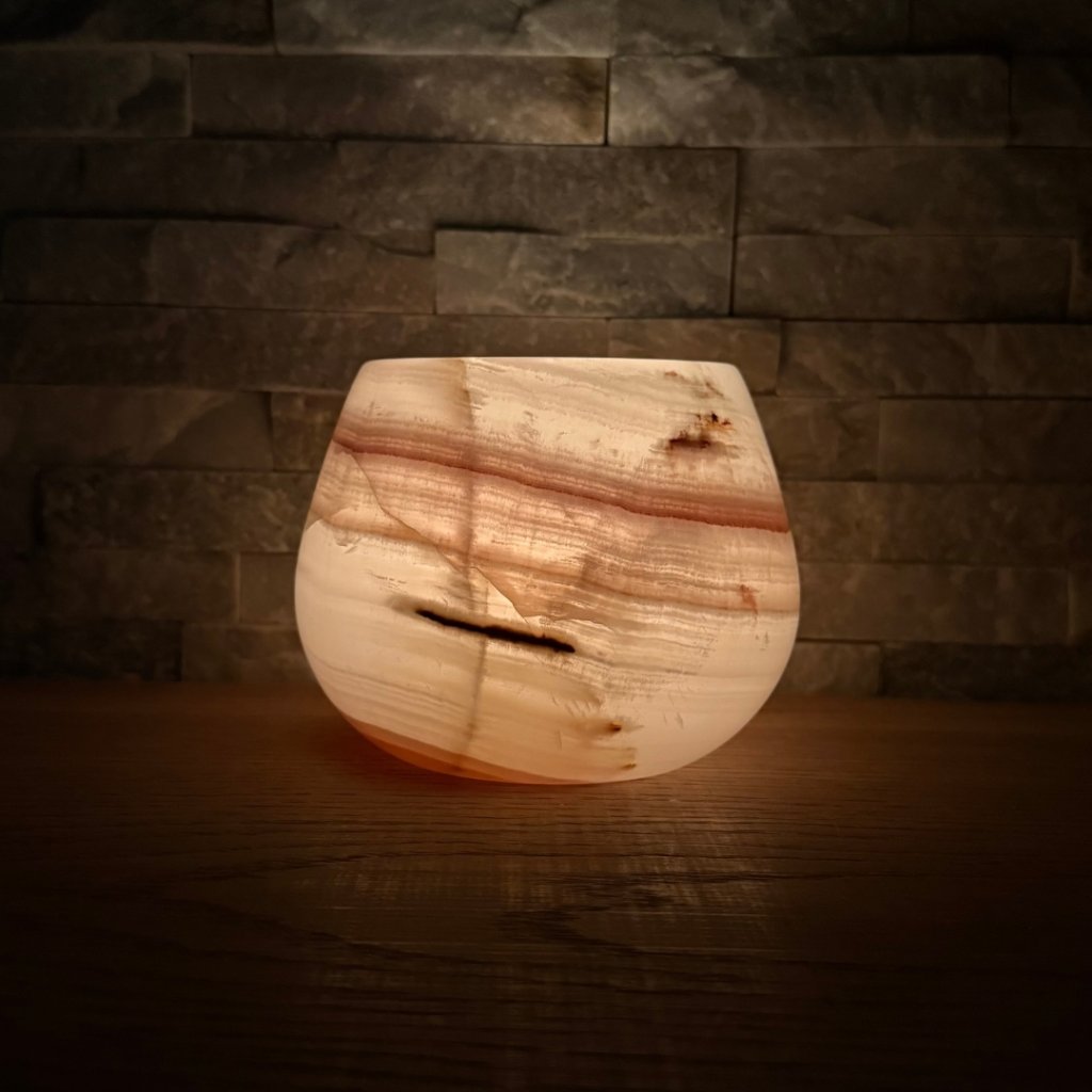 Svícen je vyroben z přírodního aragonitu, známého také jako pákistánský onyx. Tento kámen vyniká pevností, jemným leskem a přirozenou kresbou, která vznikala po tisíce let. Kupujete přesně ten svícen, který vidíte na fotografiích, žádný náhodný výběr, ale konkrétní originální kus.