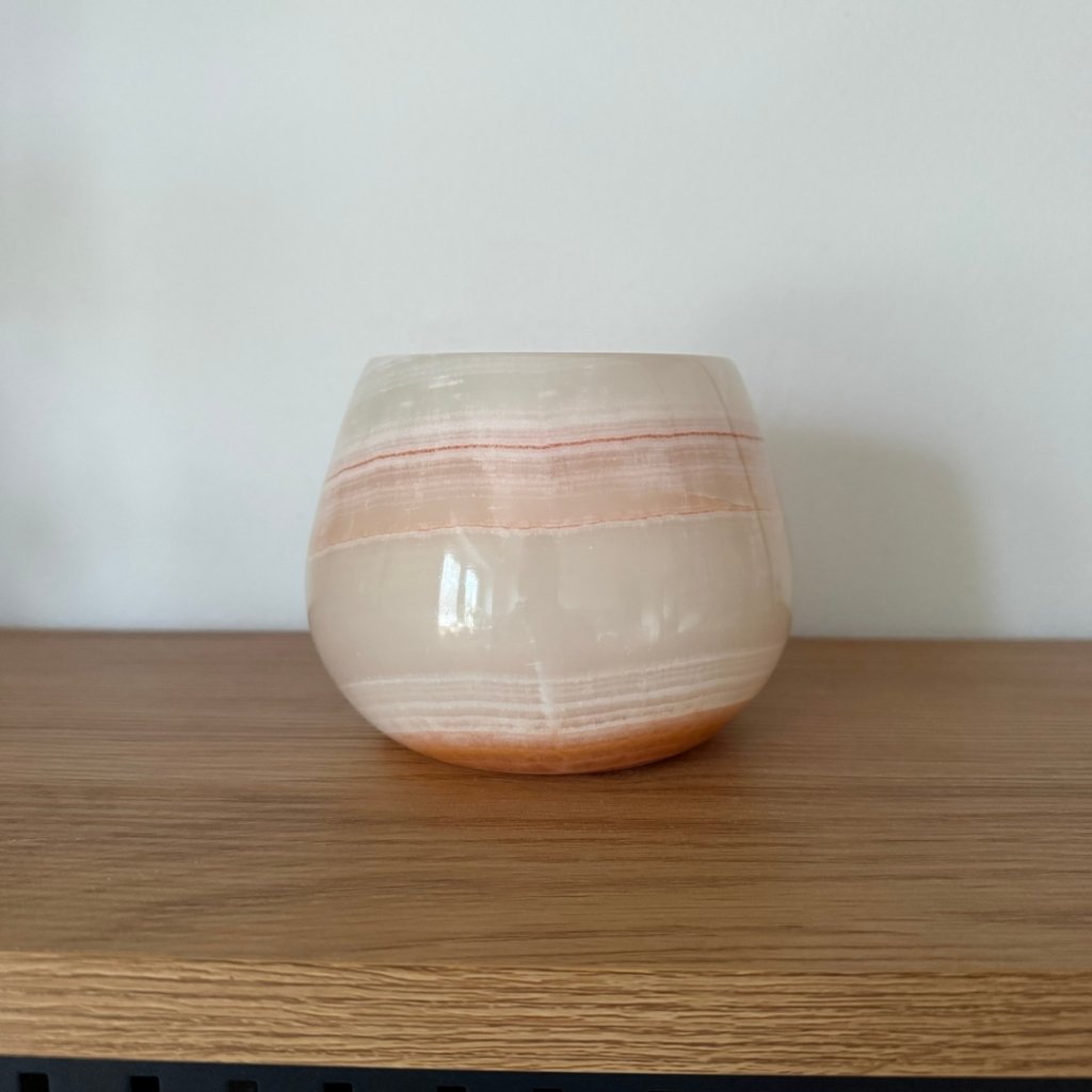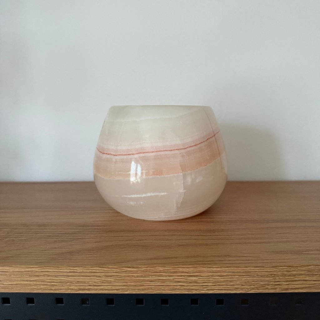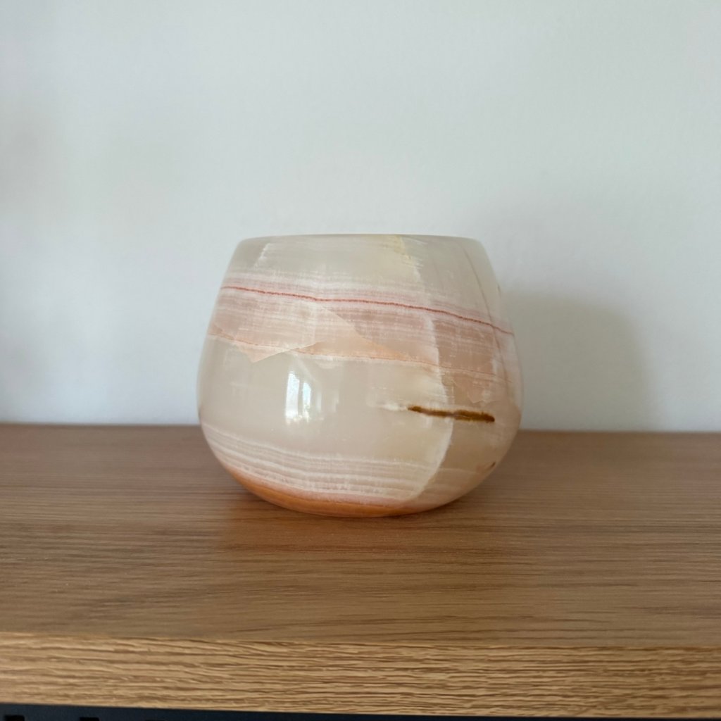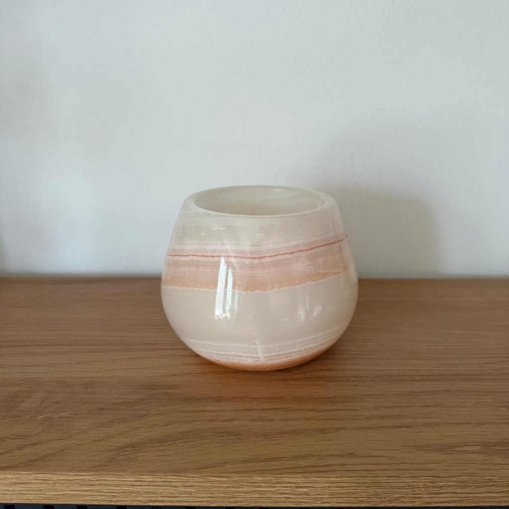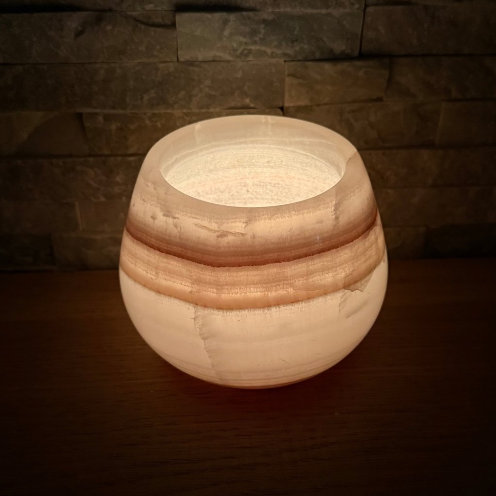 Svícen je vyroben z přírodního aragonitu, známého také jako pákistánský onyx. Tento kámen vyniká pevností, jemným leskem a přirozenou kresbou, která vznikala po tisíce let. Kupujete přesně ten svícen, který vidíte na fotografiích, žádný náhodný výběr, ale konkrétní originální kus.