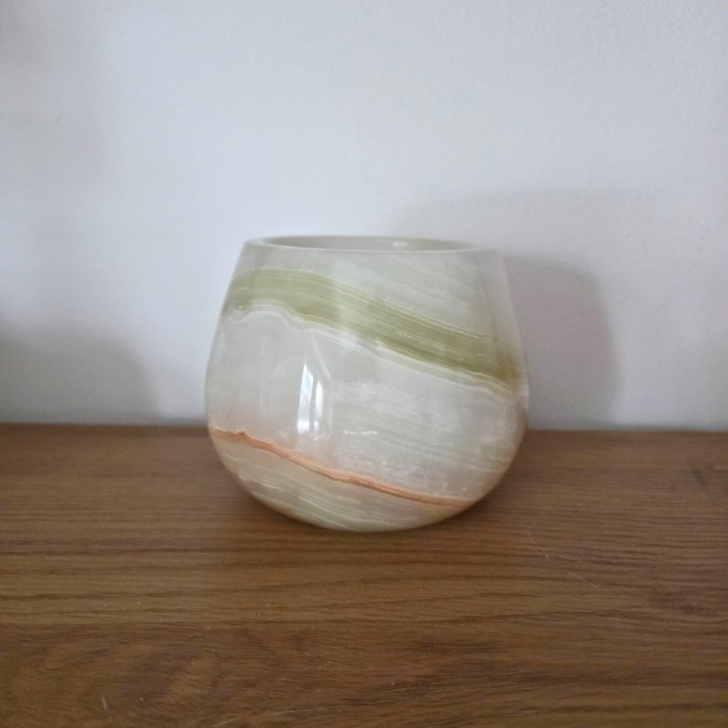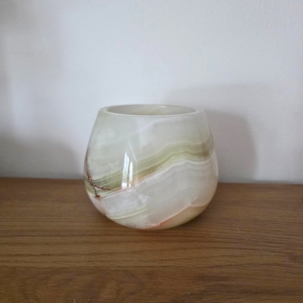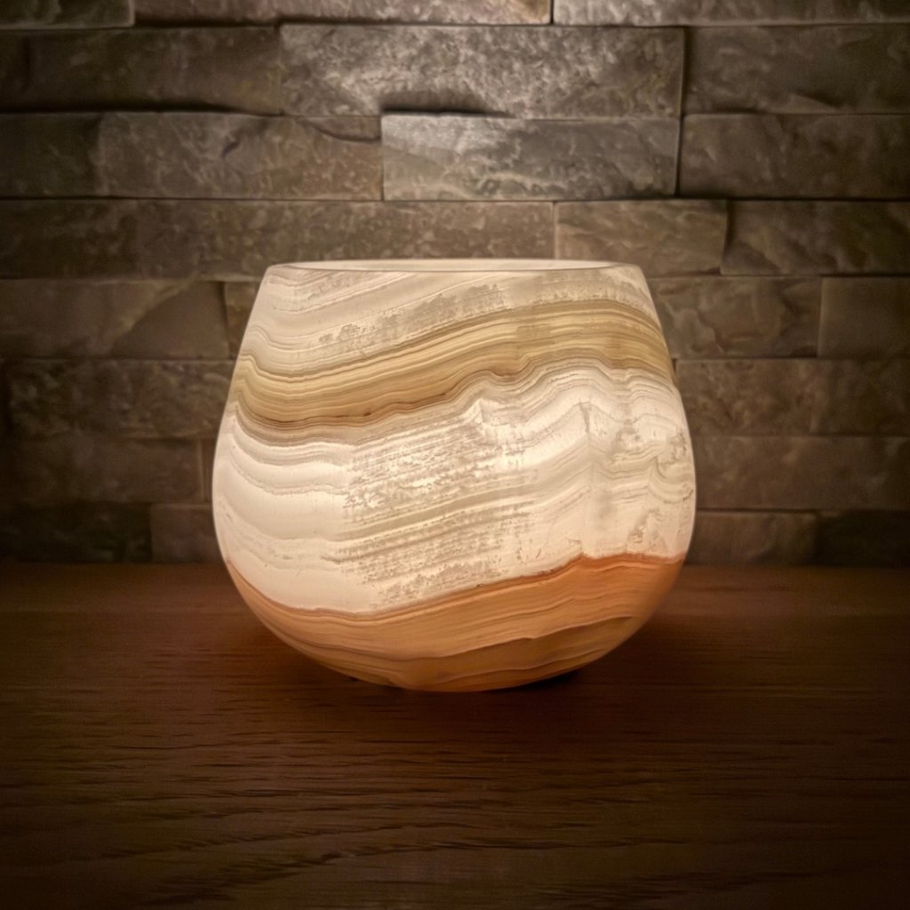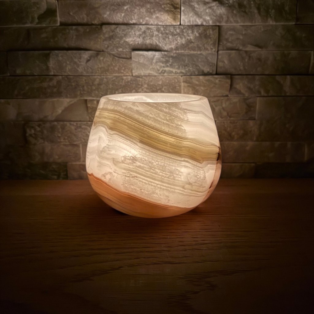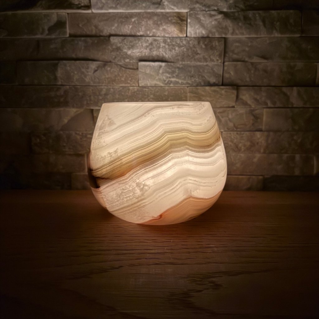 Svícen je vyroben z přírodního aragonitu, známého také jako pákistánský onyx. Tento kámen vyniká pevností, jemným leskem a přirozenou kresbou, která vznikala po tisíce let. Kupujete přesně ten svícen, který vidíte na fotografiích, žádný náhodný výběr, ale konkrétní originální kus.
