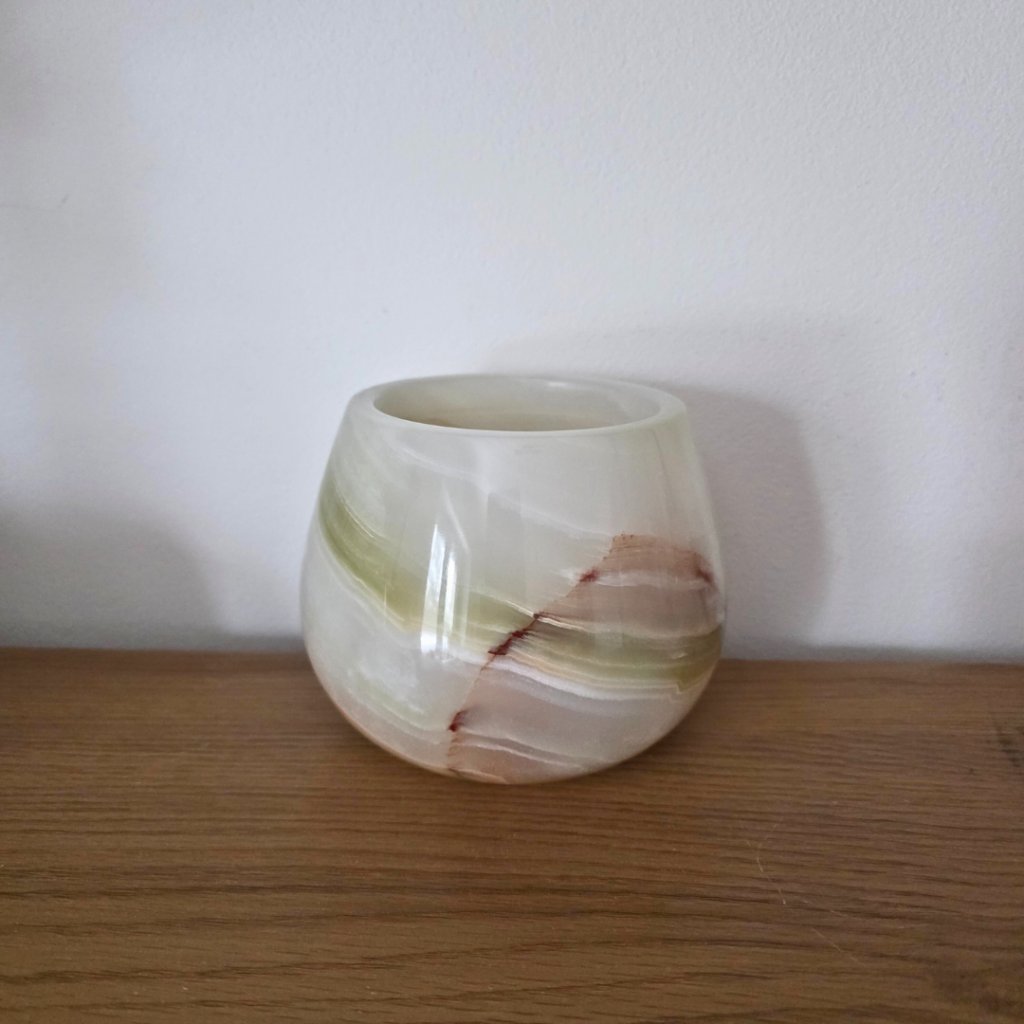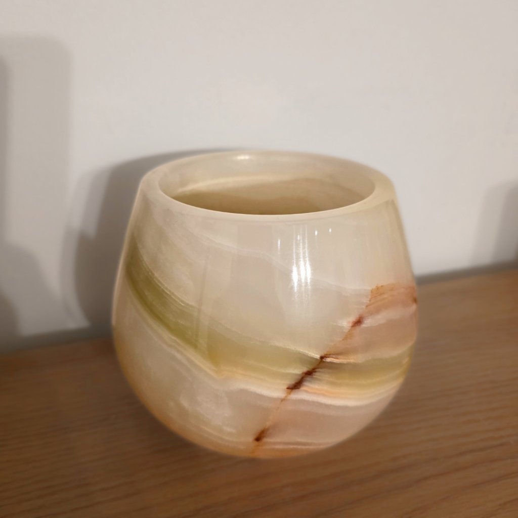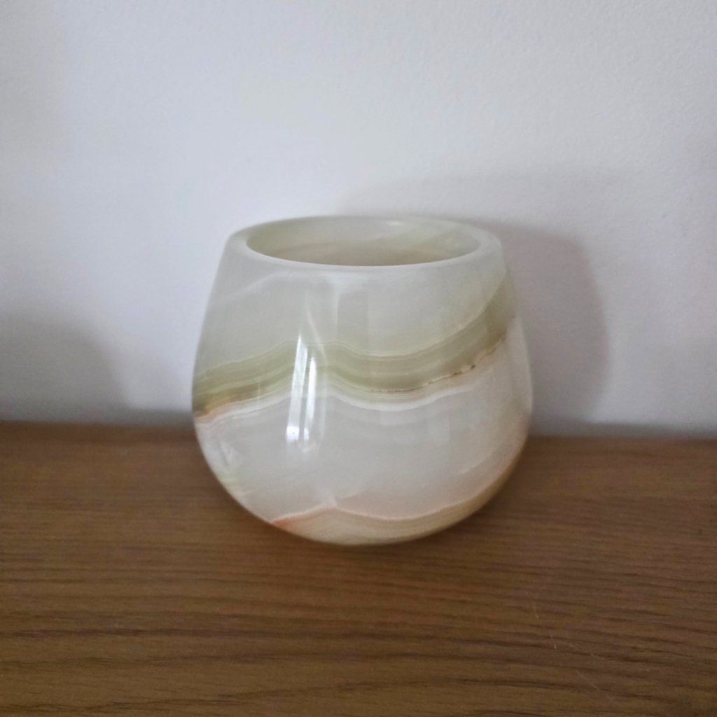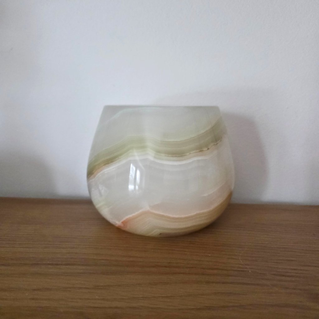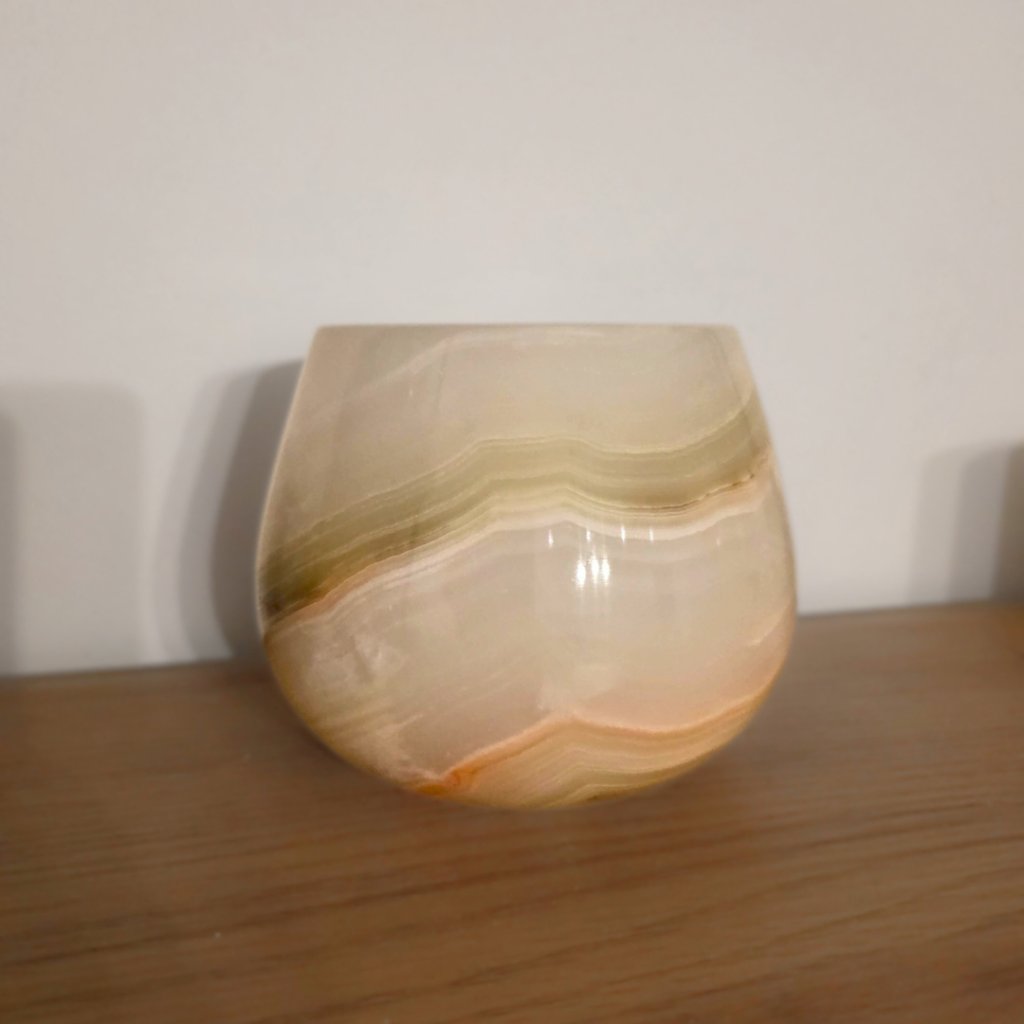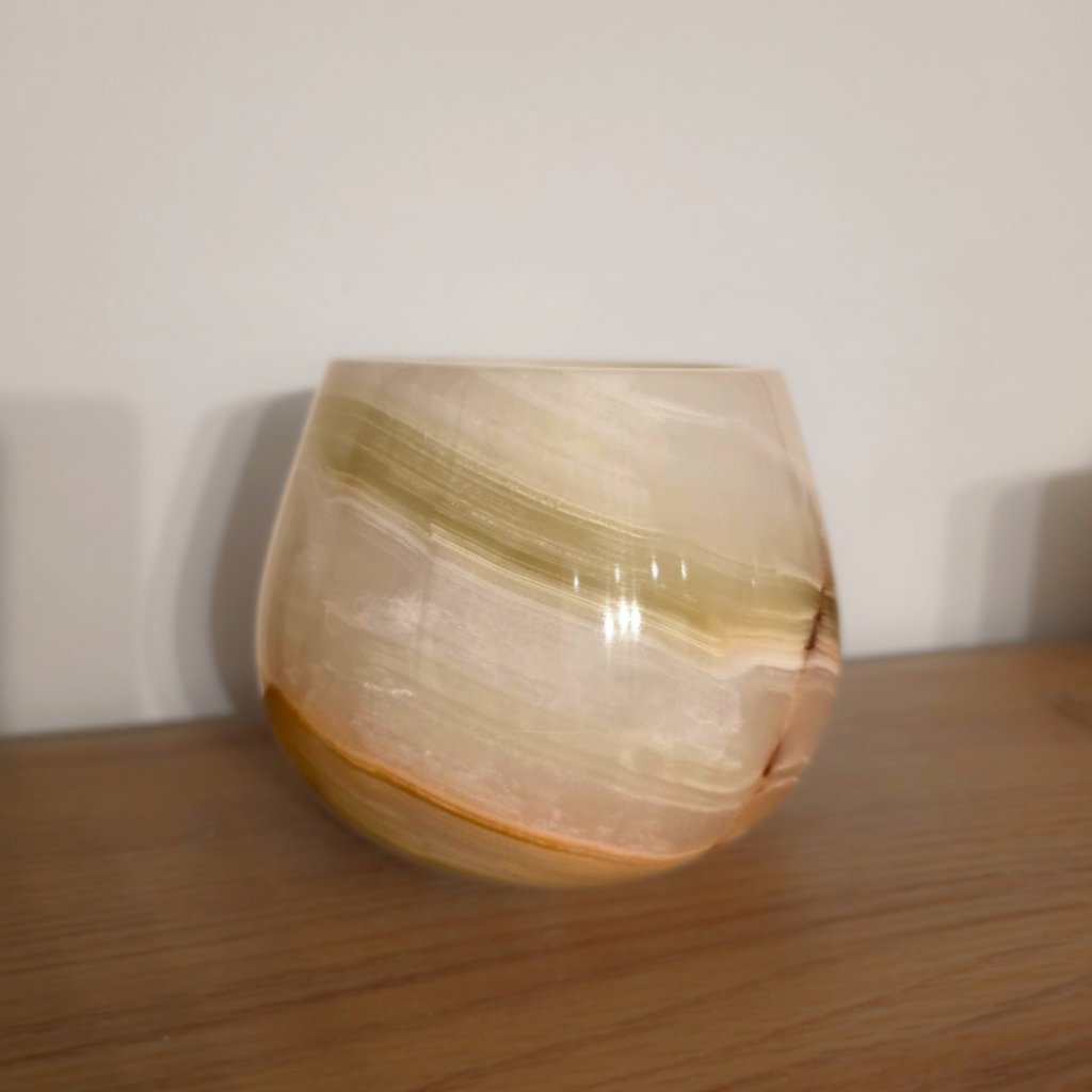 Svícen je vyroben z přírodního aragonitu, známého také jako pákistánský onyx. Tento kámen vyniká pevností, jemným leskem a přirozenou kresbou, která vznikala po tisíce let. Kupujete přesně ten svícen, který vidíte na fotografiích, žádný náhodný výběr, ale konkrétní originální kus.