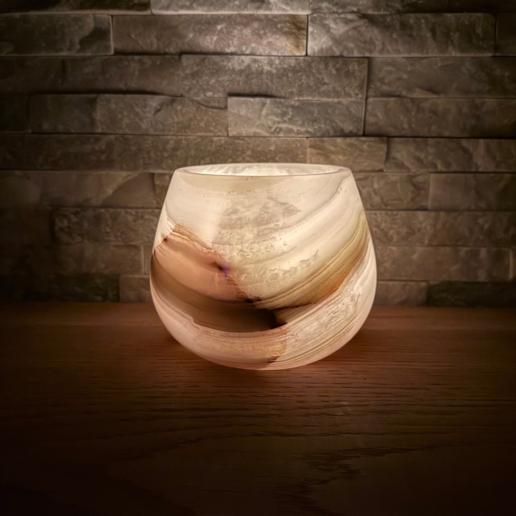 Každý svícen z aragonitu je jedinečný svým vzhledem. Tento konkrétní kus má přesně takovou strukturu, žilkování a barevnost, jakou vidíte na fotkách. Doporučujeme si fotogalerii projít opravdu pečlivě, abyste věděli, jaký svícen si domů vybíráte. Po zapálení čajové svíčky začne světlo jemně prosvítat kamenem a zvýrazní jeho přirozenou kresbu.
