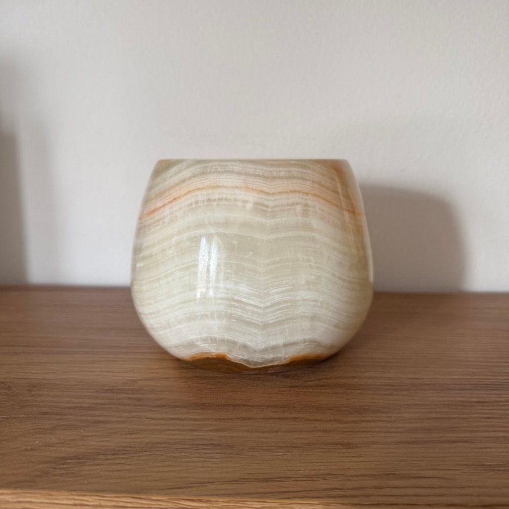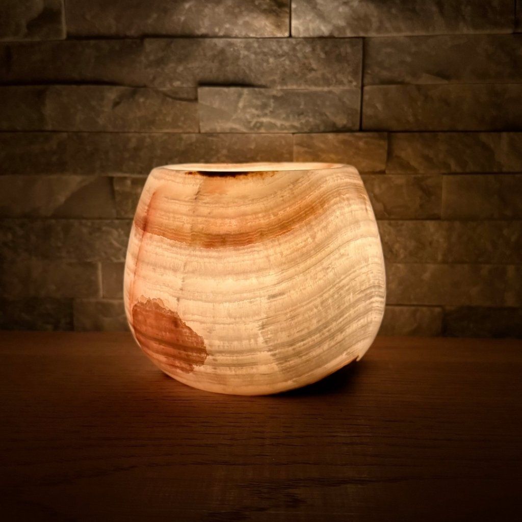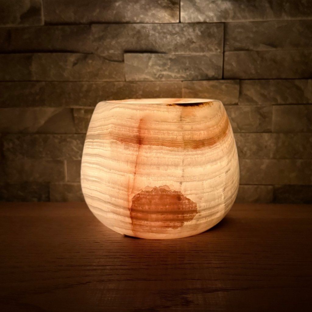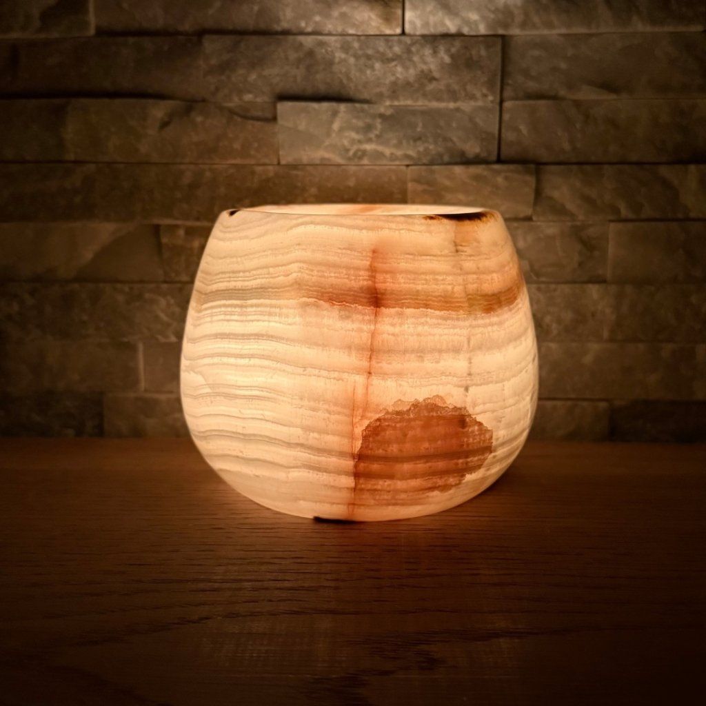 Svícen je vyroben z přírodního aragonitu, známého také jako pákistánský onyx. Tento kámen vyniká pevností, jemným leskem a přirozenou kresbou, která vznikala po tisíce let. Kupujete přesně ten svícen, který vidíte na fotografiích, žádný náhodný výběr, ale konkrétní originální kus.