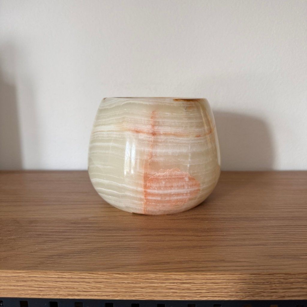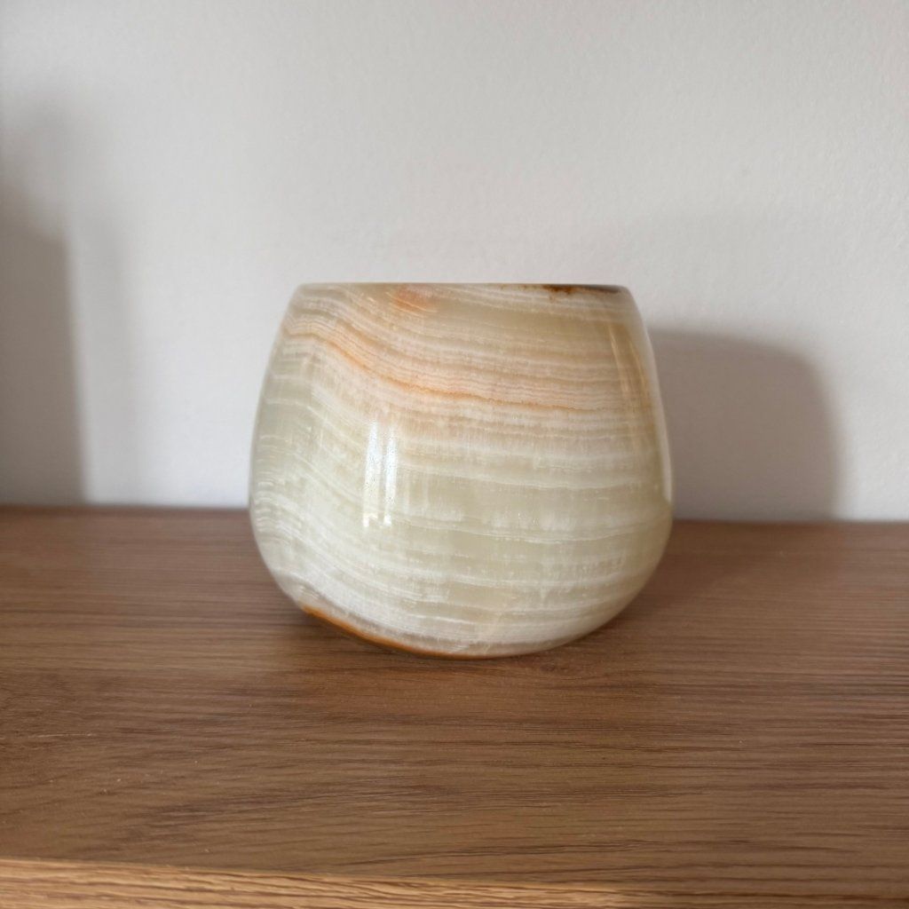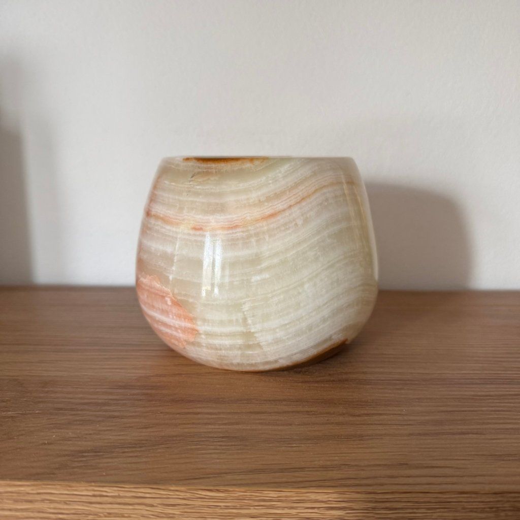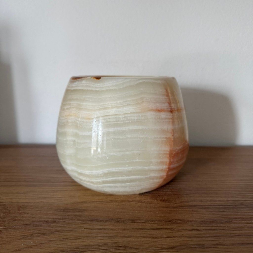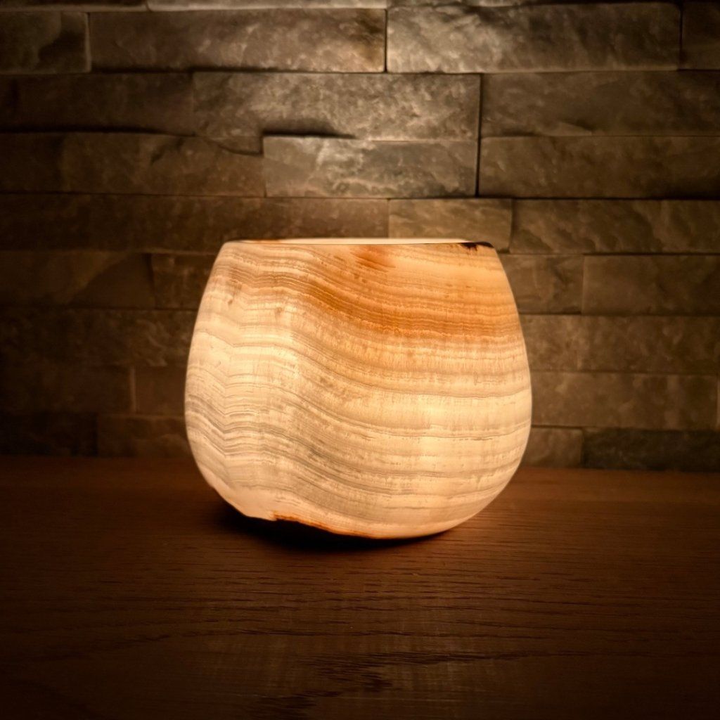 Svícen je vyroben z přírodního aragonitu, známého také jako pákistánský onyx. Tento kámen vyniká pevností, jemným leskem a přirozenou kresbou, která vznikala po tisíce let. Kupujete přesně ten svícen, který vidíte na fotografiích, žádný náhodný výběr, ale konkrétní originální kus.
