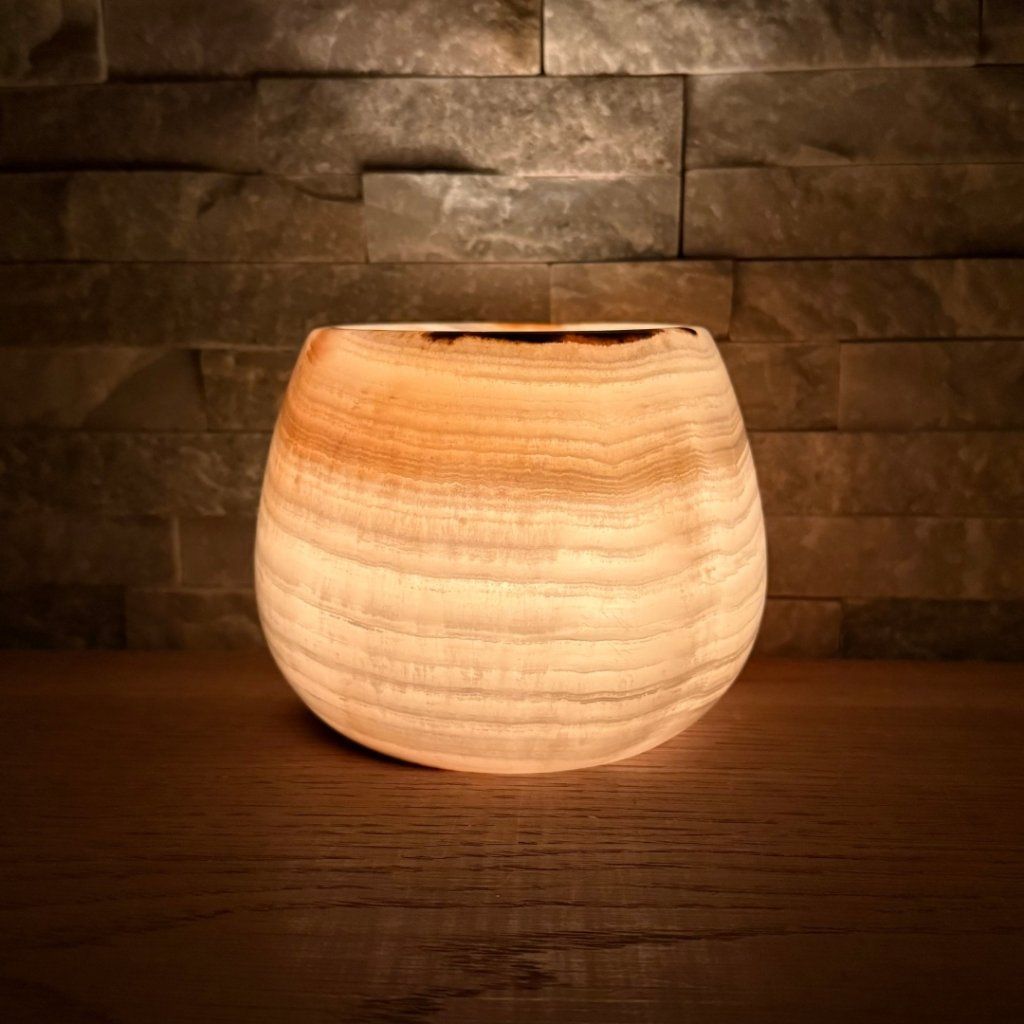 Každý svícen z aragonitu je jedinečný svým vzhledem. Tento konkrétní kus má přesně takovou strukturu, žilkování a barevnost, jakou vidíte na fotkách. Doporučujeme si fotogalerii projít opravdu pečlivě, abyste věděli, jaký svícen si domů vybíráte. Po zapálení čajové svíčky začne světlo jemně prosvítat kamenem a zvýrazní jeho přirozenou kresbu.