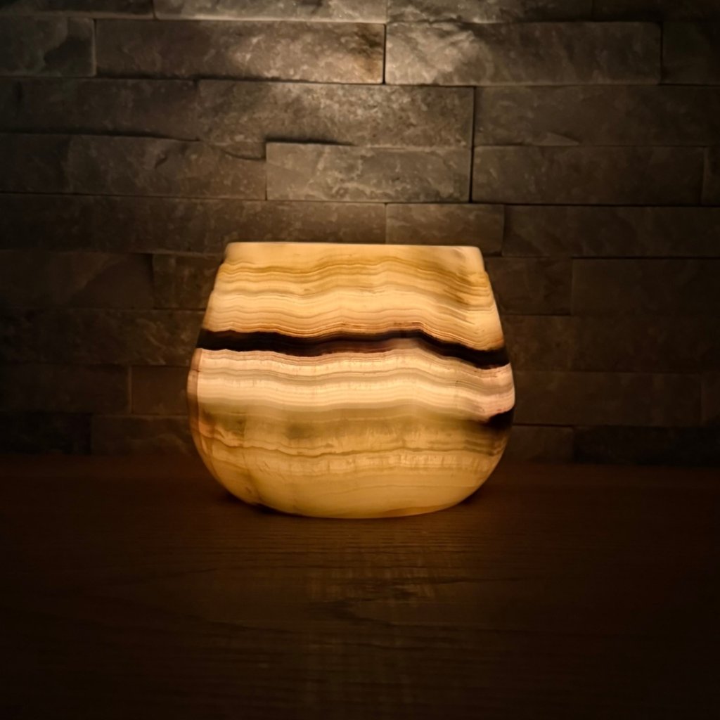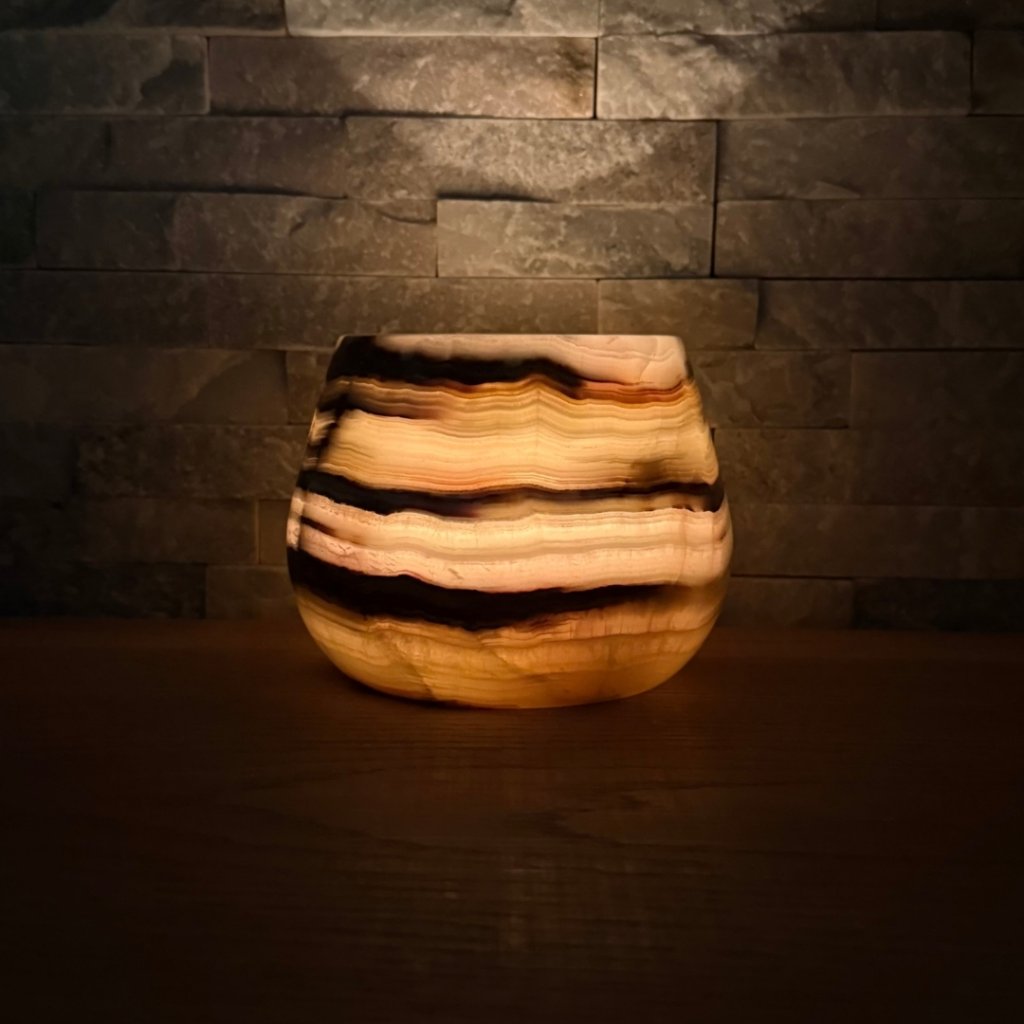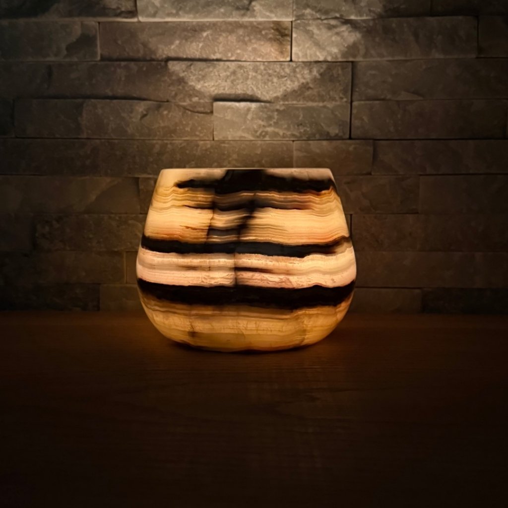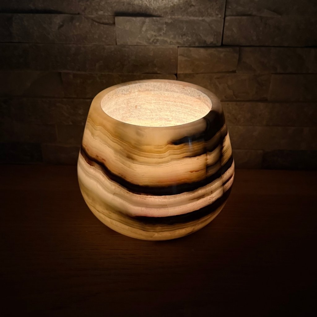 Svícen je vyroben z přírodního aragonitu, známého také jako pákistánský onyx. Tento kámen vyniká pevností, jemným leskem a přirozenou kresbou, která vznikala po tisíce let. Kupujete přesně ten svícen, který vidíte na fotografiích, žádný náhodný výběr, ale konkrétní originální kus.