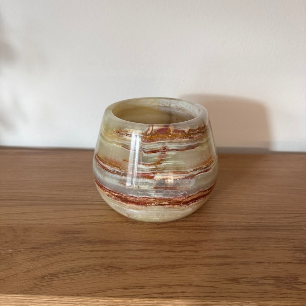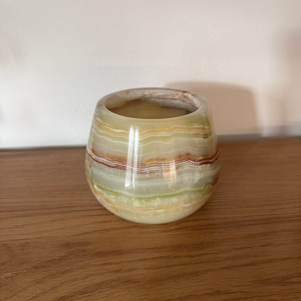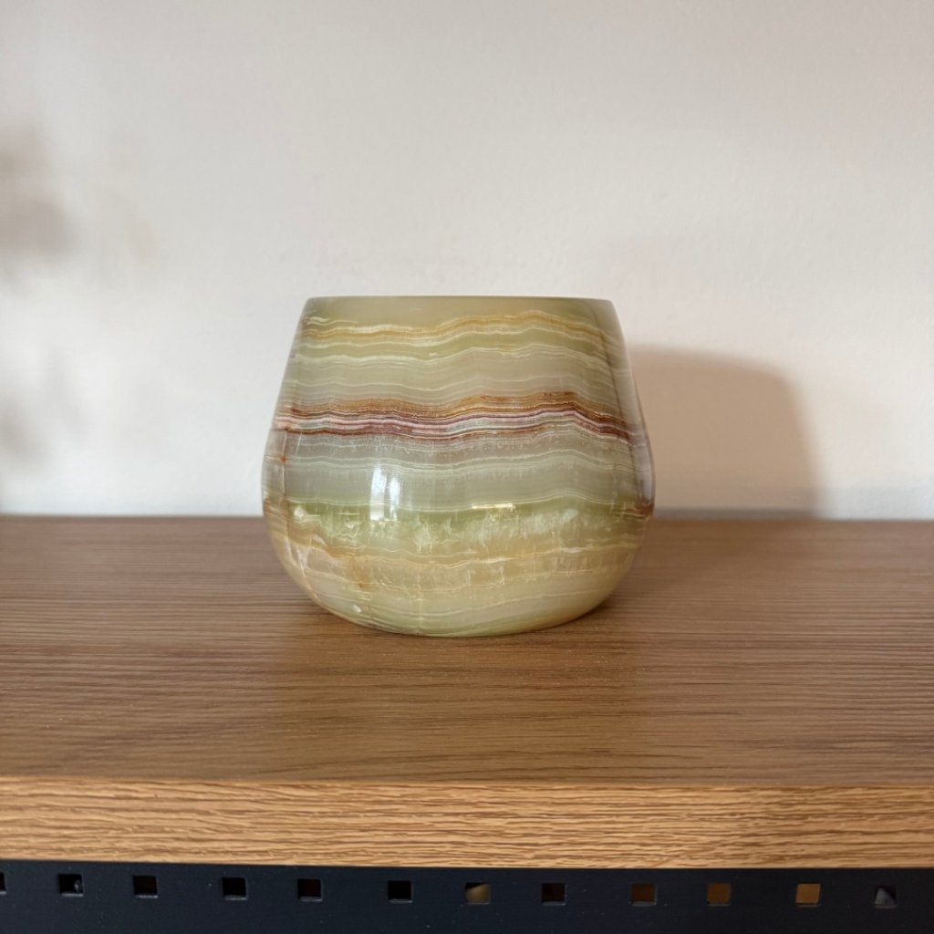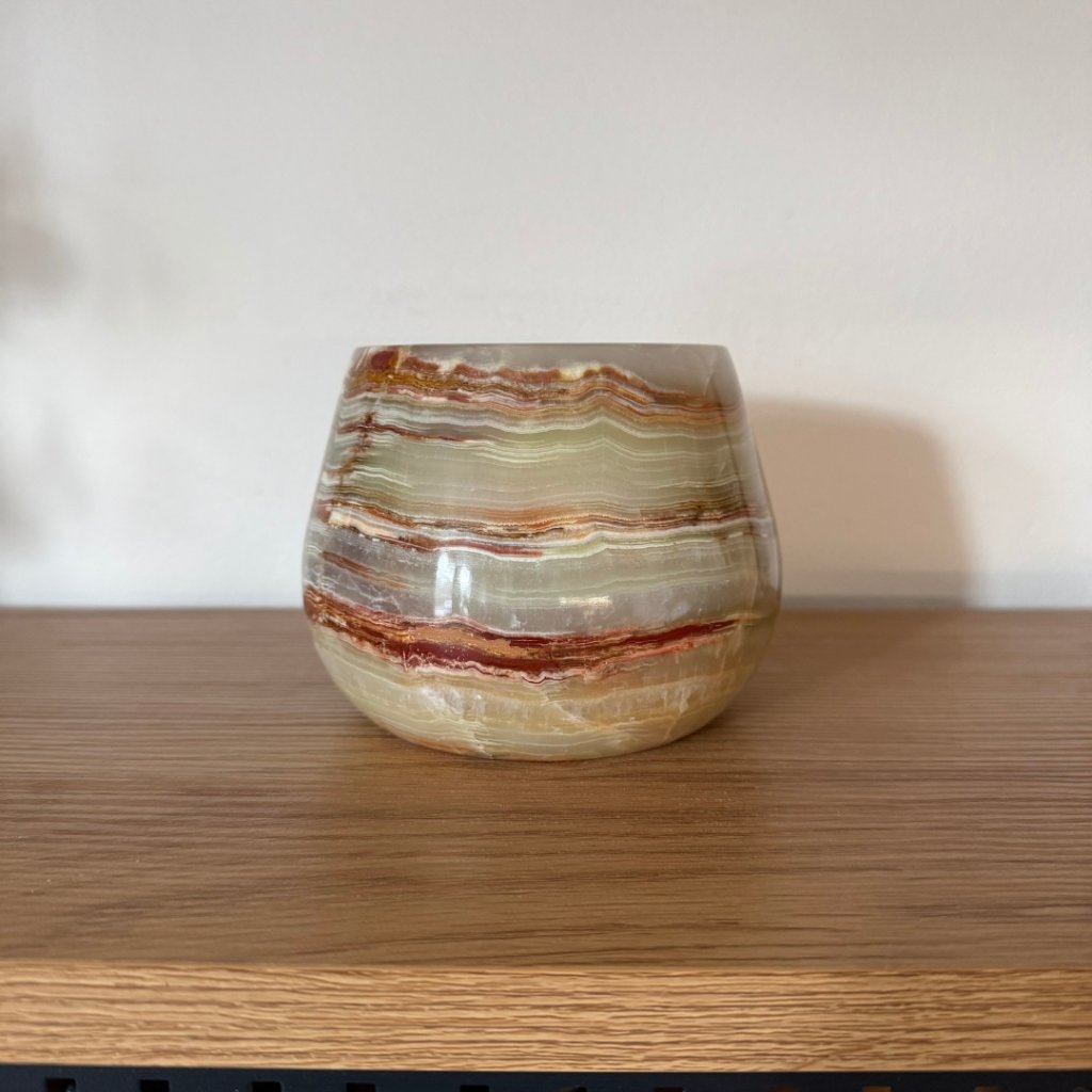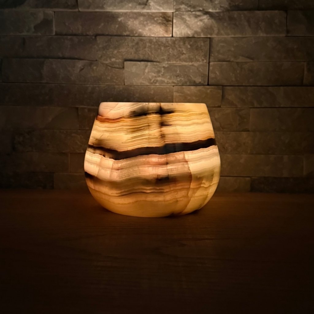 Svícen je vyroben z přírodního aragonitu, známého také jako pákistánský onyx. Tento kámen vyniká pevností, jemným leskem a přirozenou kresbou, která vznikala po tisíce let. Kupujete přesně ten svícen, který vidíte na fotografiích, žádný náhodný výběr, ale konkrétní originální kus.