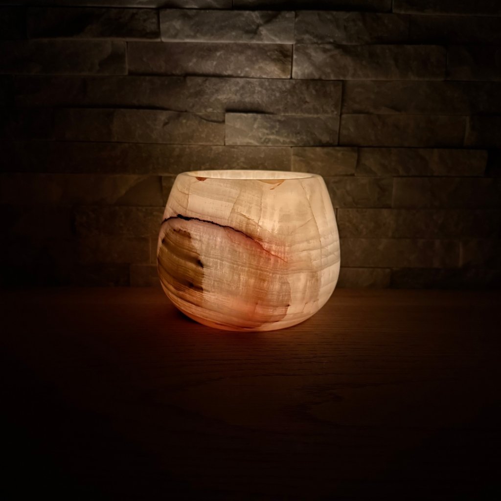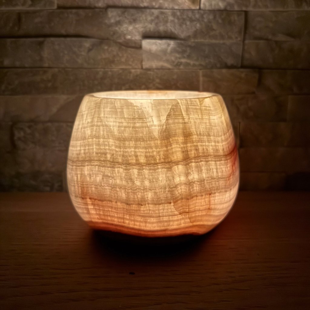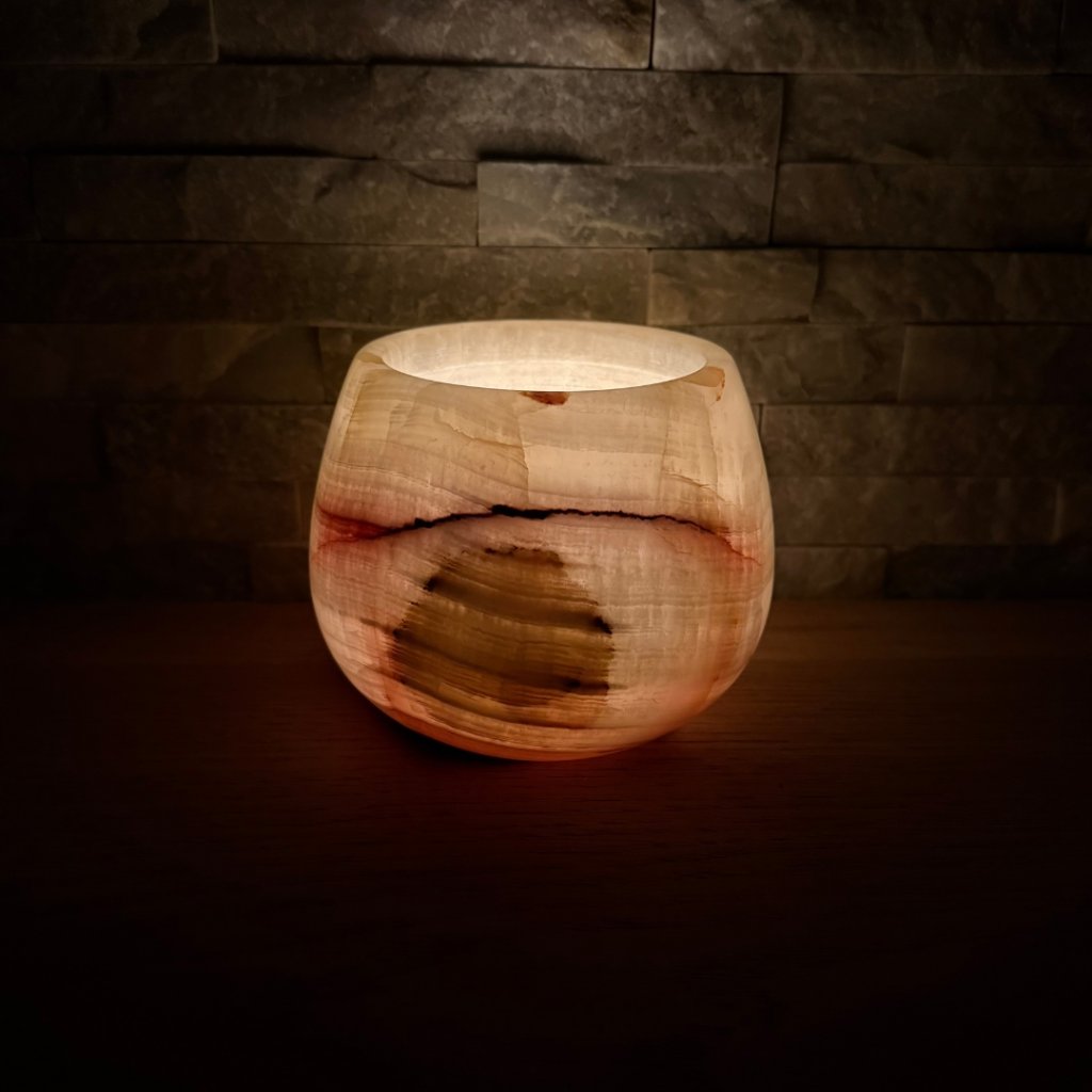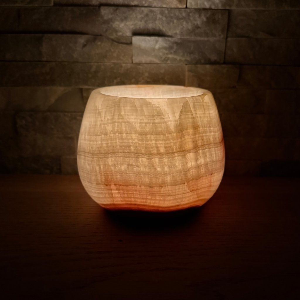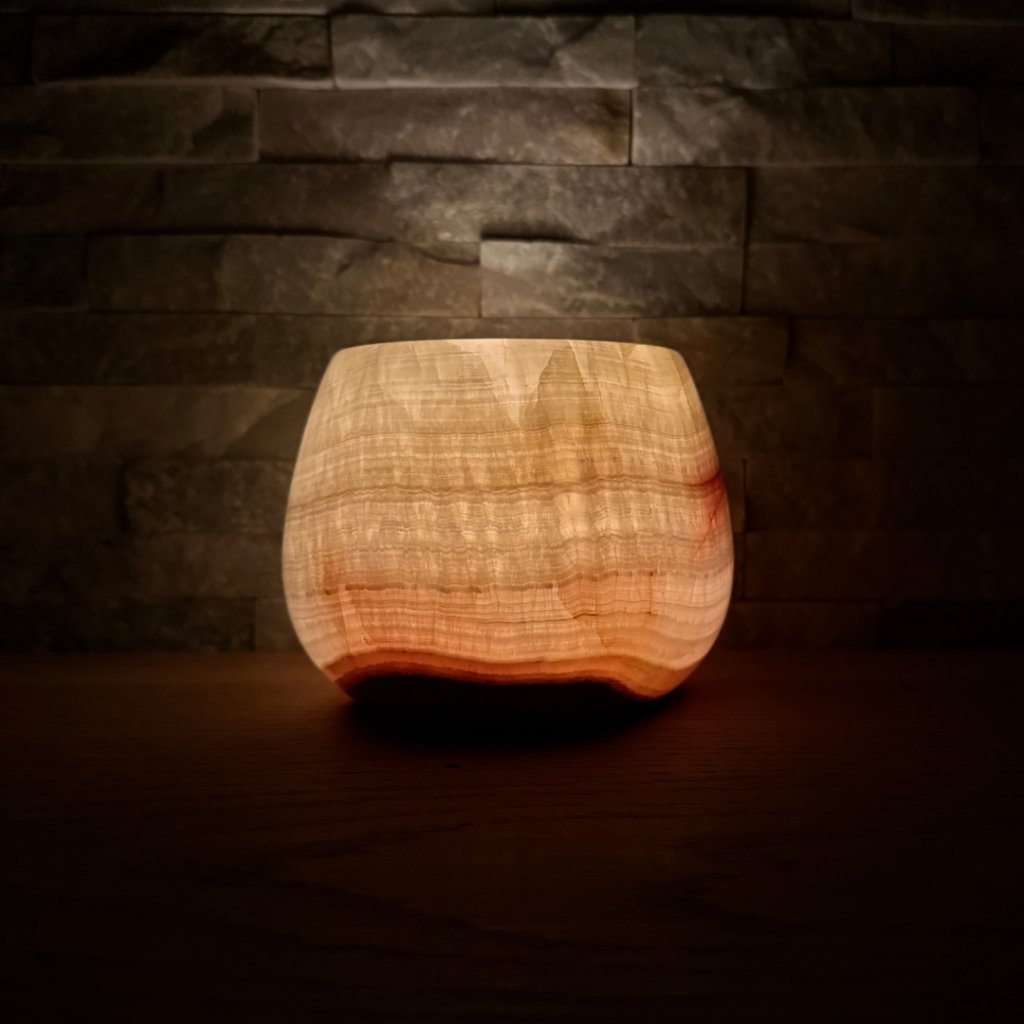 Svícen je vyroben z přírodního aragonitu, známého také jako pákistánský onyx. Tento kámen vyniká pevností, jemným leskem a přirozenou kresbou, která vznikala po tisíce let. Kupujete přesně ten svícen, který vidíte na fotografiích, žádný náhodný výběr, ale konkrétní originální kus.