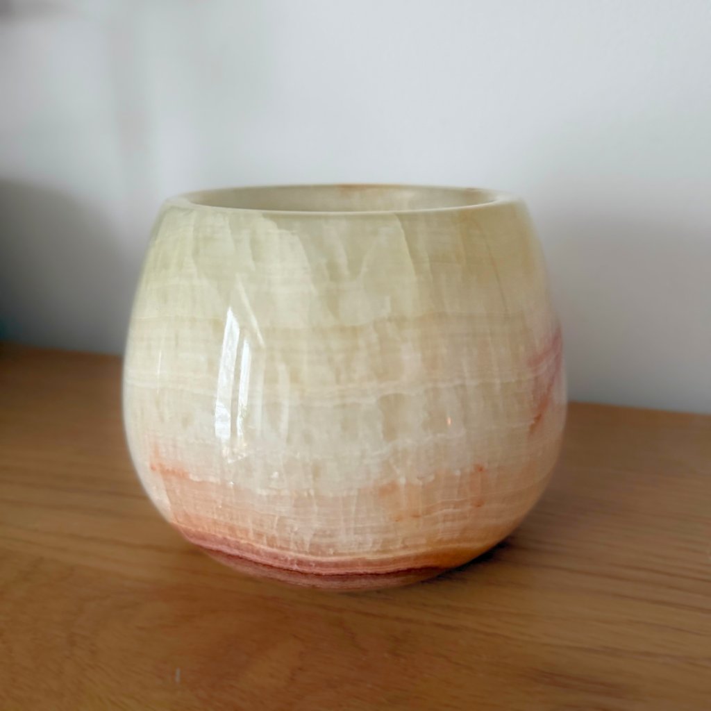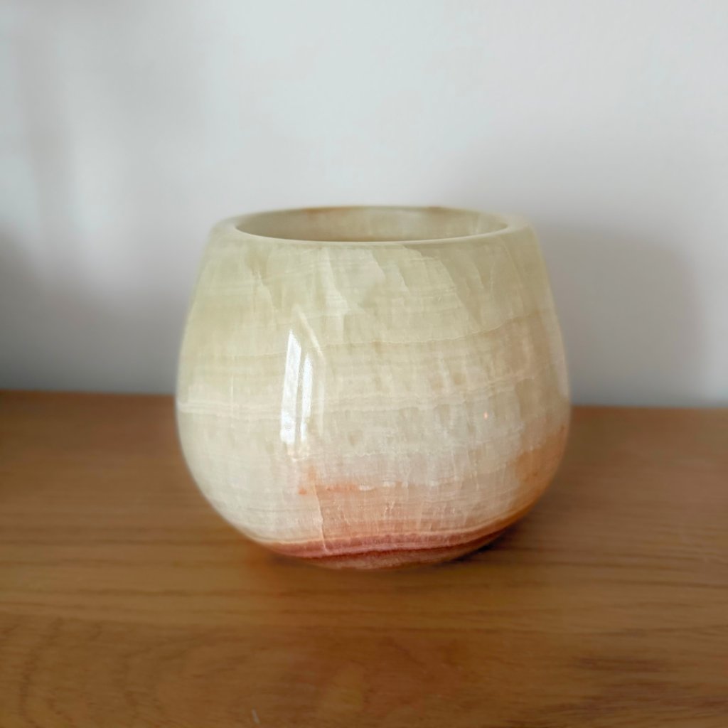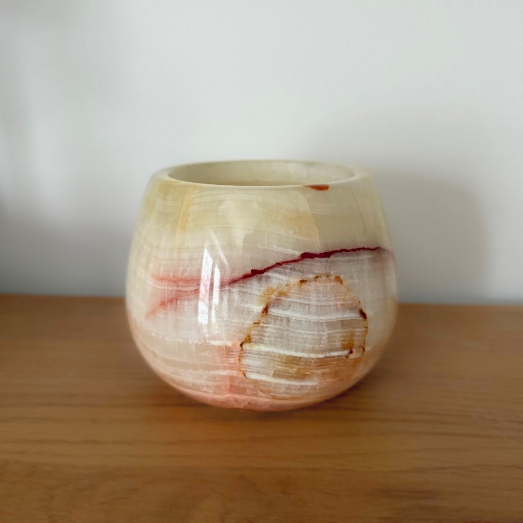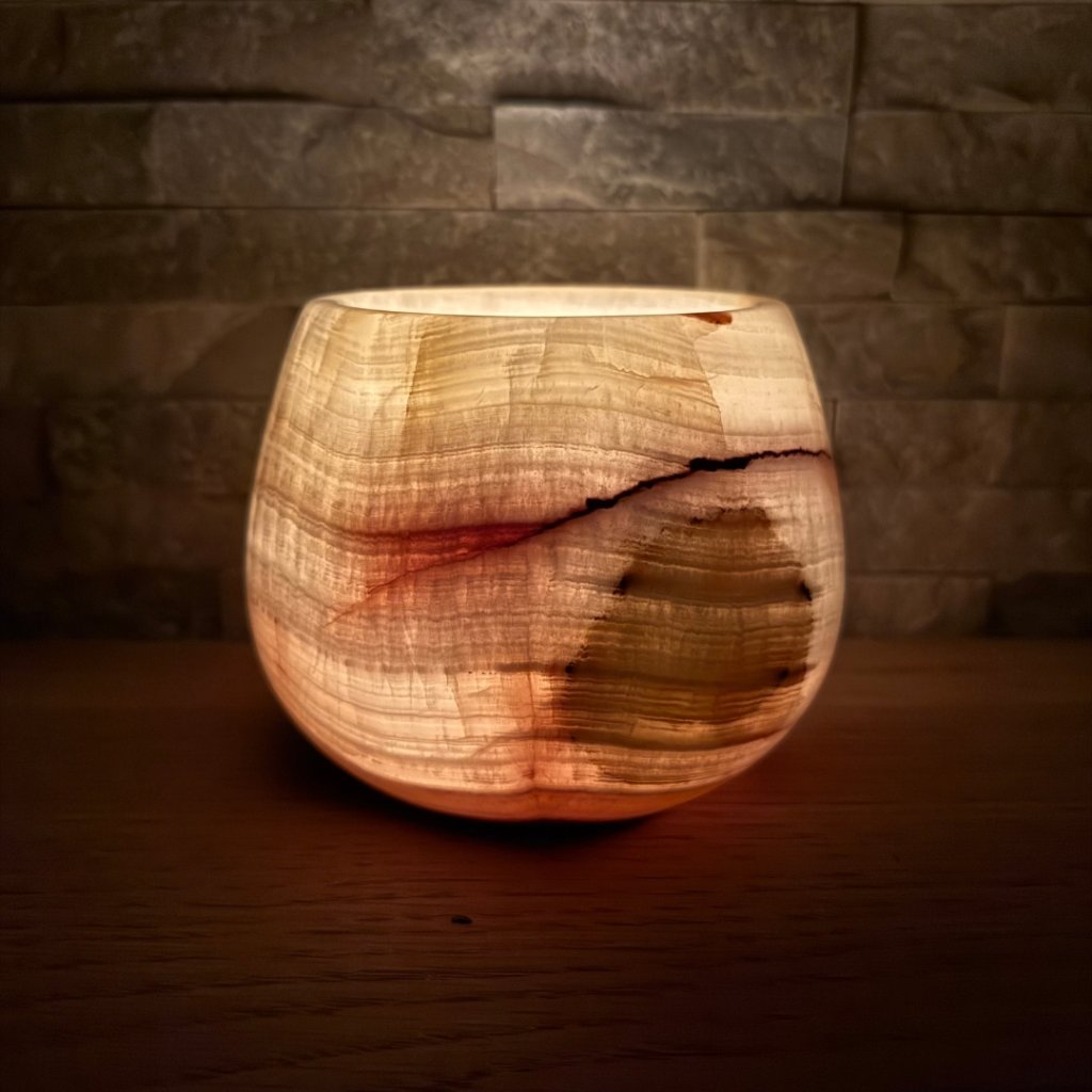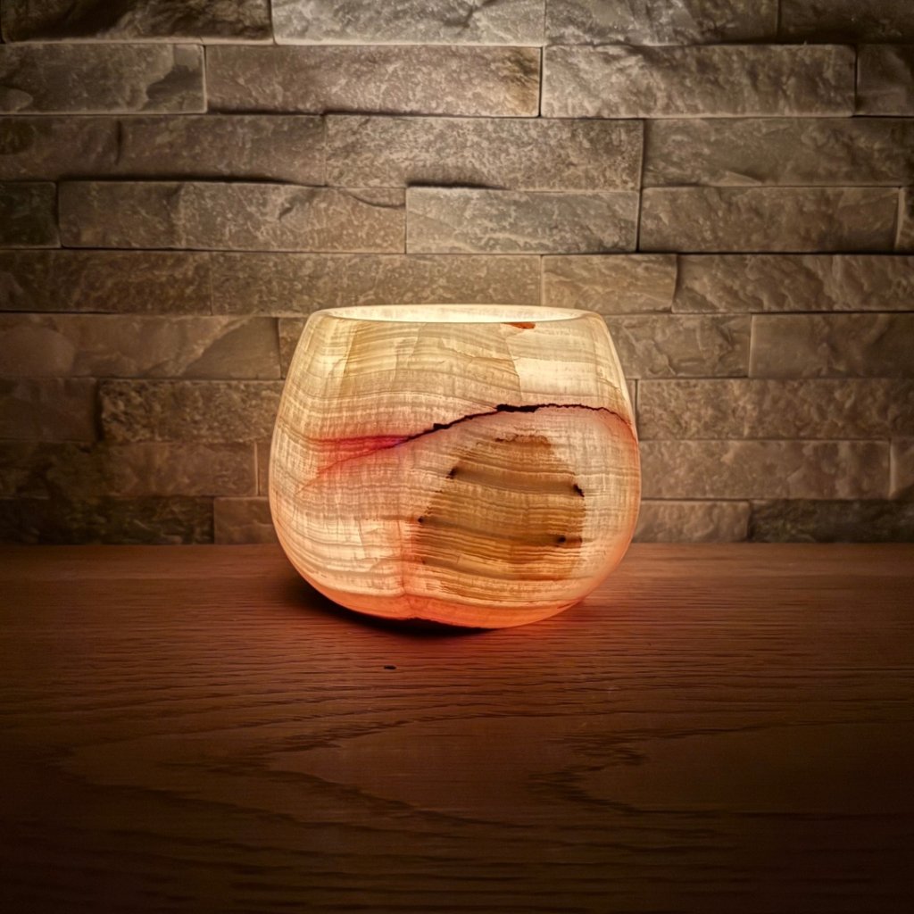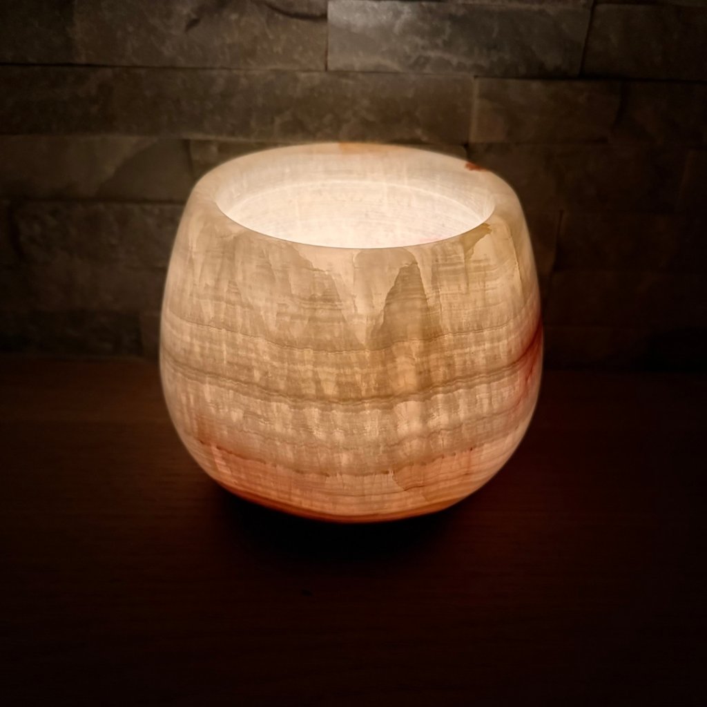 Svícen je vyroben z přírodního aragonitu, známého také jako pákistánský onyx. Tento kámen vyniká pevností, jemným leskem a přirozenou kresbou, která vznikala po tisíce let. Kupujete přesně ten svícen, který vidíte na fotografiích, žádný náhodný výběr, ale konkrétní originální kus.