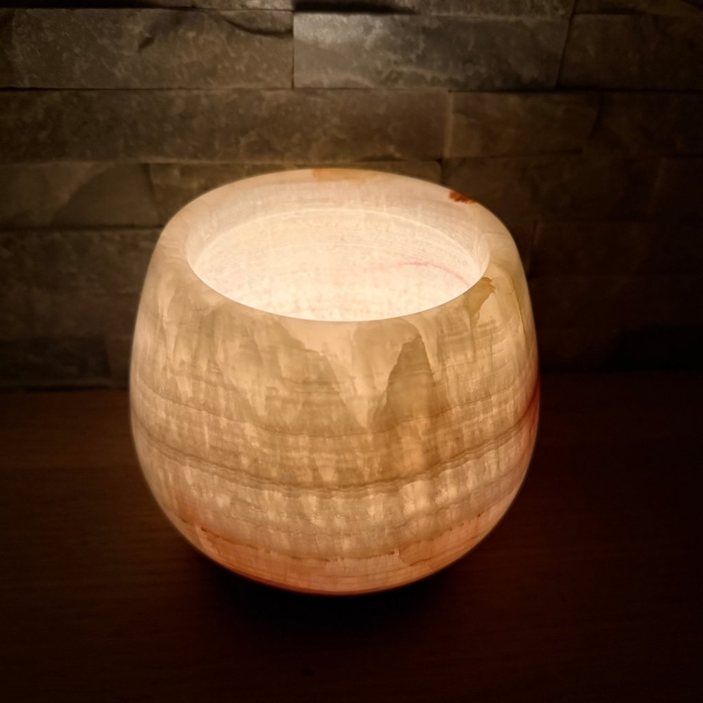 Každý svícen z aragonitu je jedinečný svým vzhledem. Tento konkrétní kus má přesně takovou strukturu, žilkování a barevnost, jakou vidíte na fotkách. Doporučujeme si fotogalerii projít opravdu pečlivě, abyste věděli, jaký svícen si domů vybíráte. Po zapálení čajové svíčky začne světlo jemně prosvítat kamenem a zvýrazní jeho přirozenou kresbu.