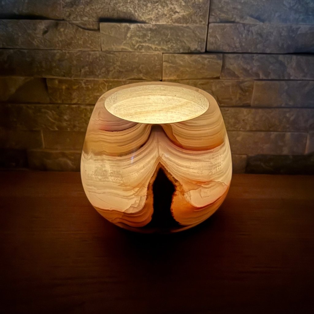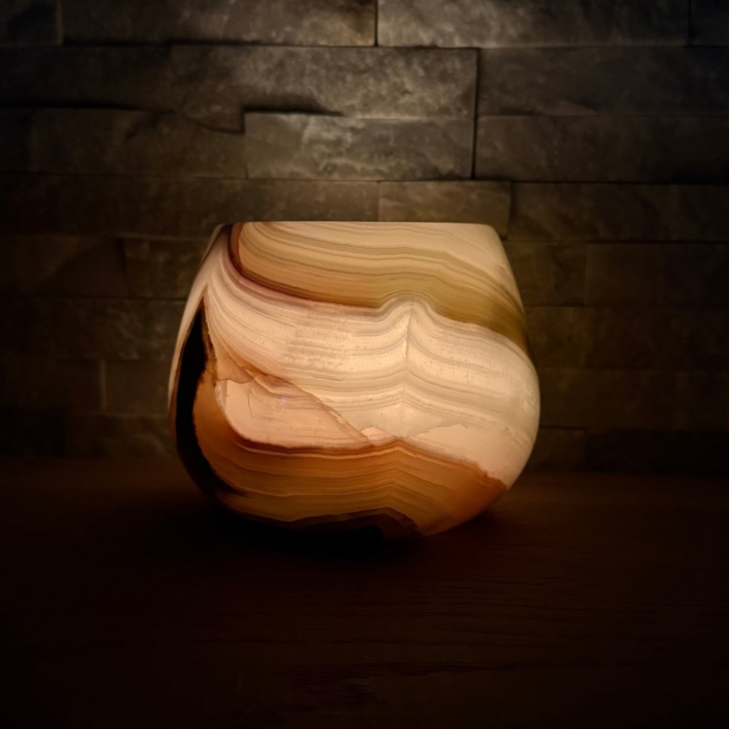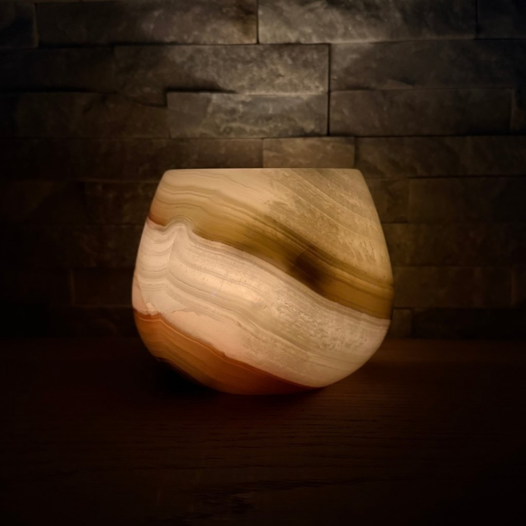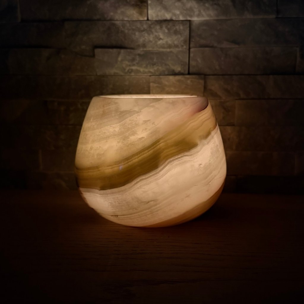 Svícen je vyroben z přírodního aragonitu, známého také jako pákistánský onyx. Tento kámen vyniká pevností, jemným leskem a přirozenou kresbou, která vznikala po tisíce let. Kupujete přesně ten svícen, který vidíte na fotografiích, žádný náhodný výběr, ale konkrétní originální kus.
